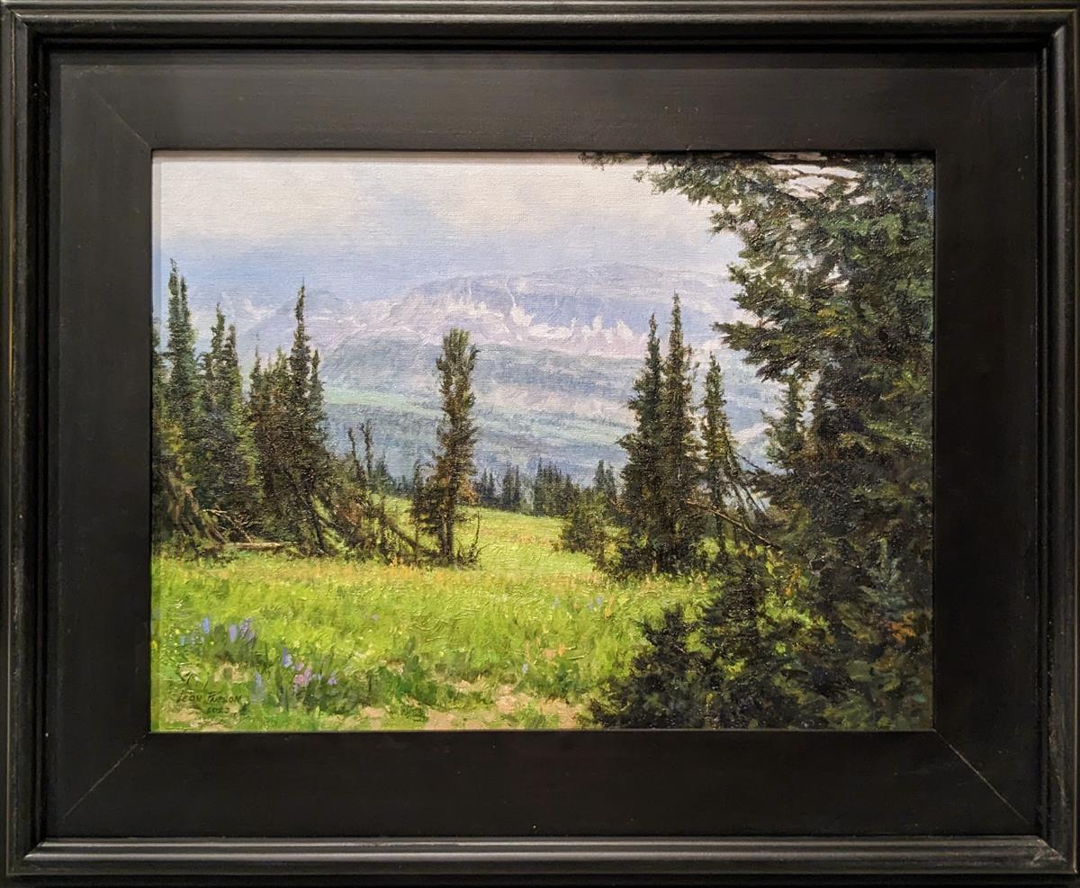 The location for this painting is from a hike up to Table Rock, near the Grand Teton Peak, when I was serving as a leader to a group of young men and young women. I enjoyed the obvious evidence of the severity of the windstorms that are ever present that high up but also loved the wonderful resilience of the stand of pines. It started as a BYUI Landscape class demo but deserved a good amount of additional studio time later.