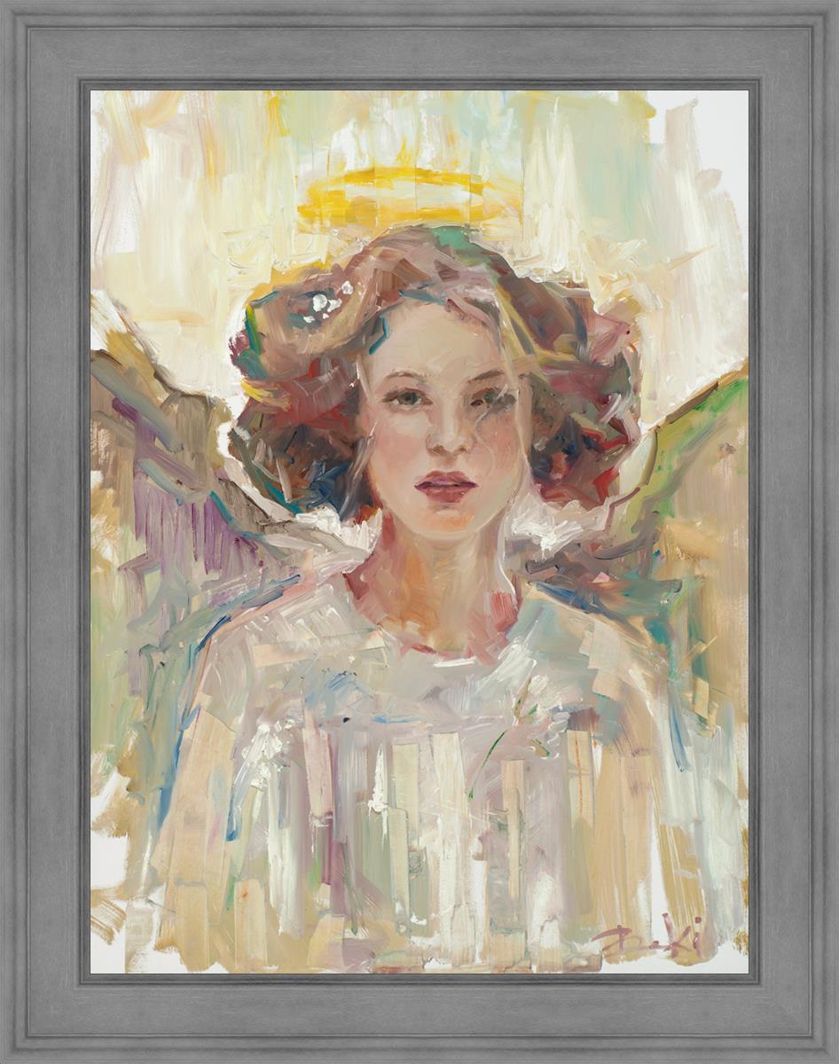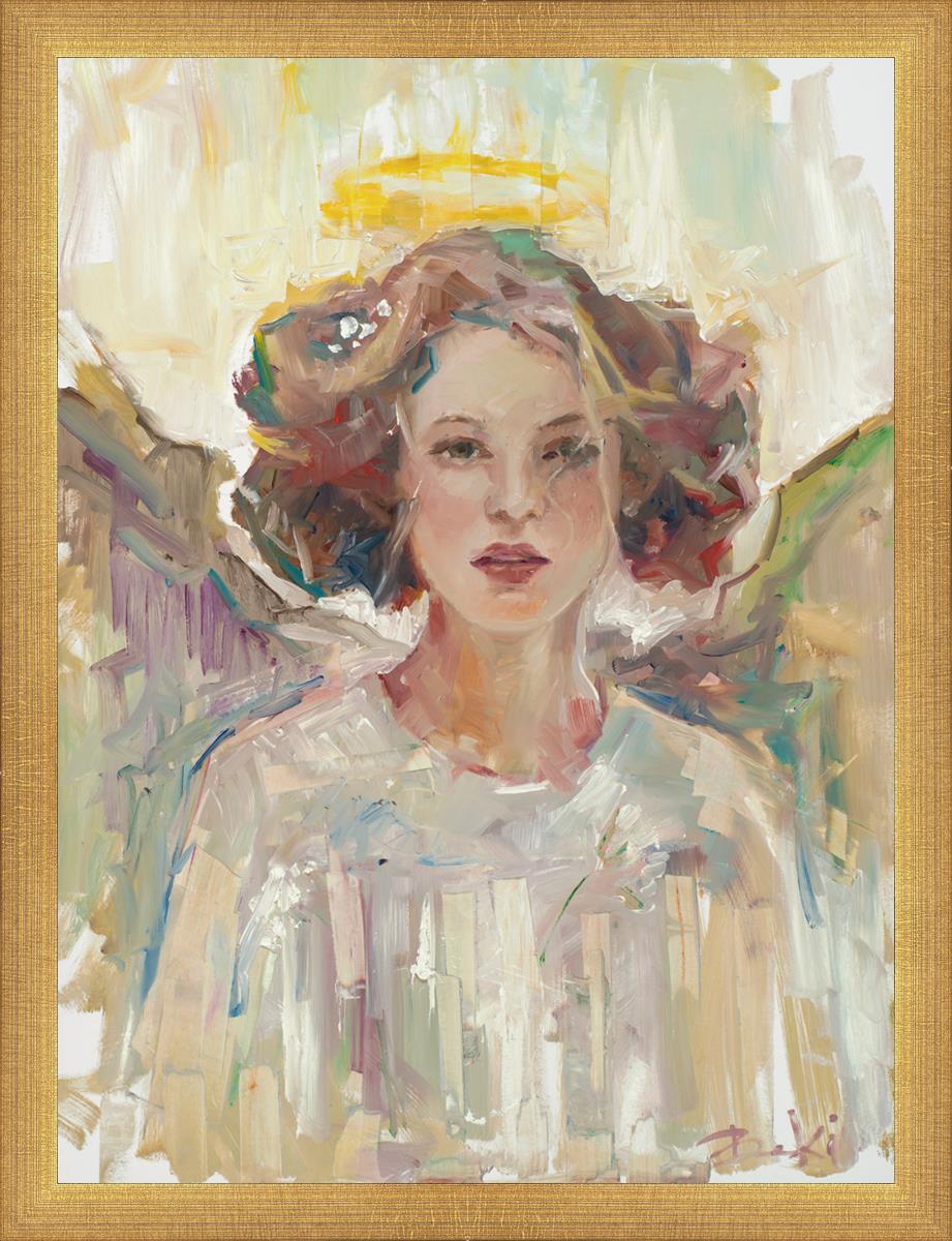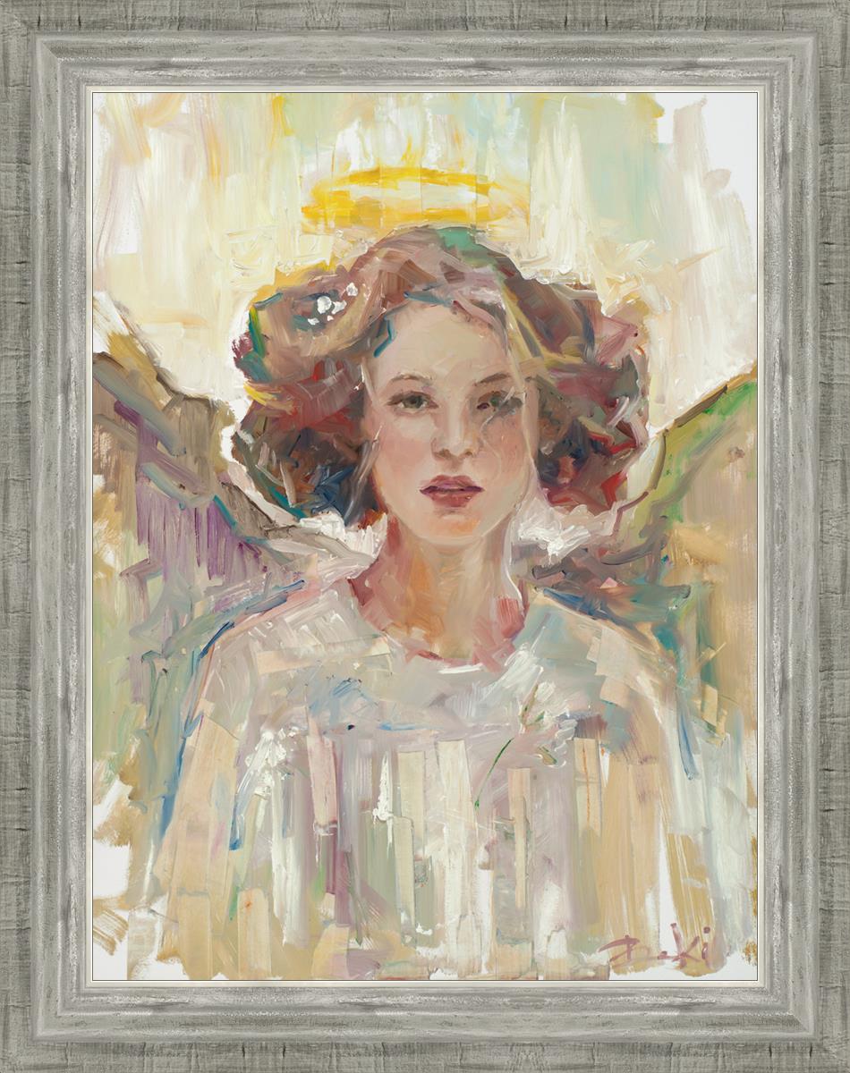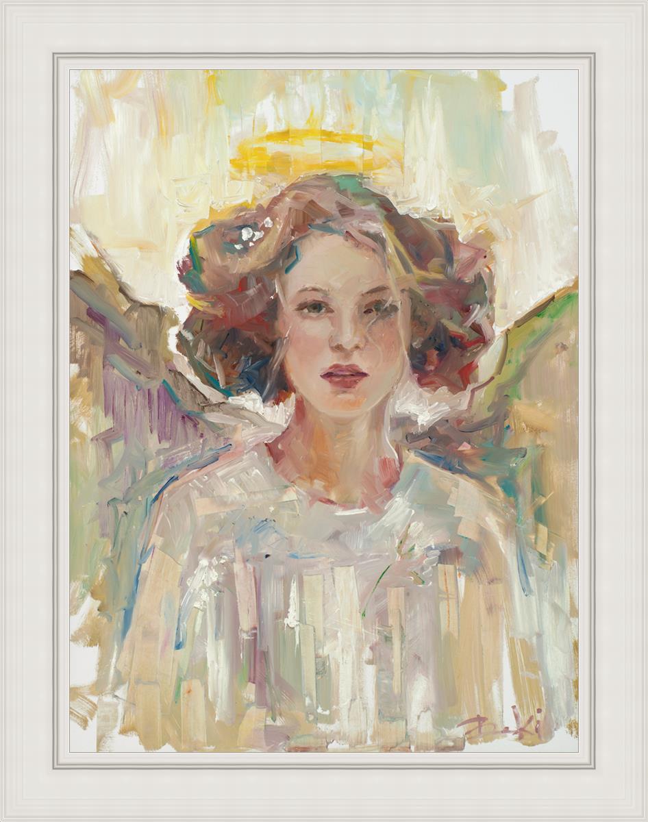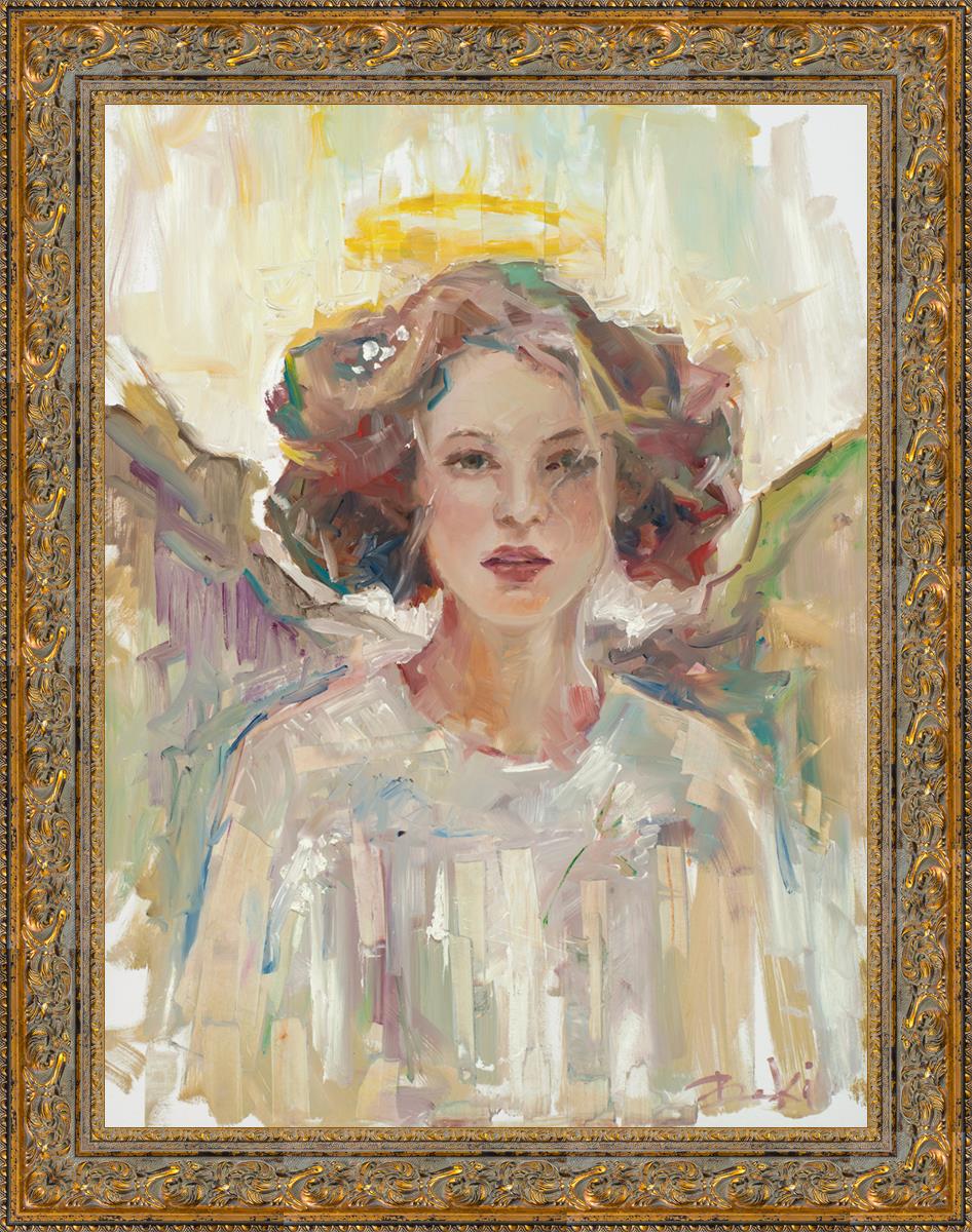 "Disheveled Guardian" is a playful depiction of the artist's vision of her guardian angel - a figure both beautiful and loving, yet slightly worn around the edges. The lively brush strokes suggest chaos and perpetual movement, reflecting the artist's perception of the environment she oversees. Despite the apparent disarray, there's a profound sense of devotion and tenderness in her gaze, highlighting her unwavering commitment to her charge. While she may not find much peace amidst the lively brood of children she watches over, her presence remains a steadfast source of comfort, protection, and unconditional love.
