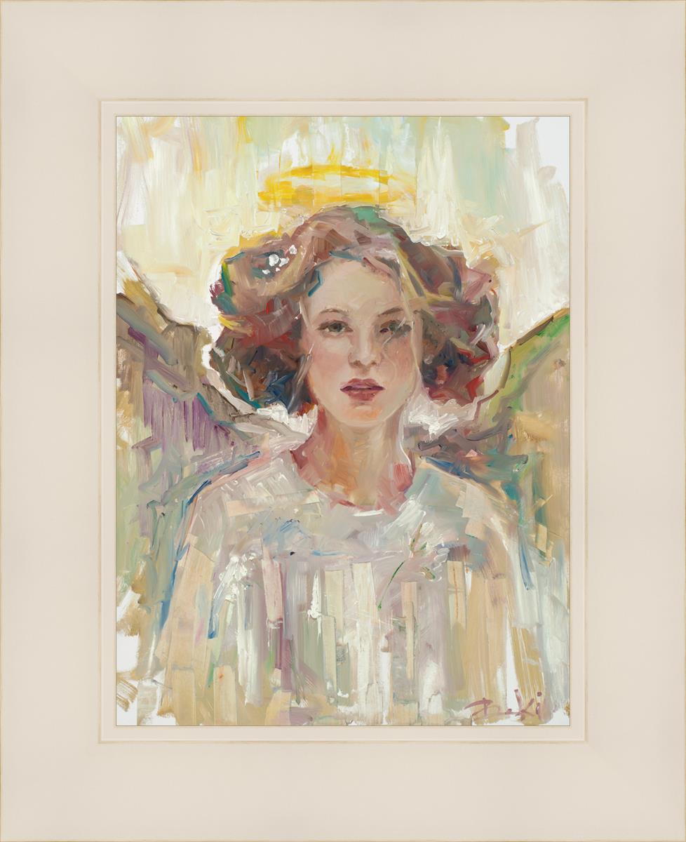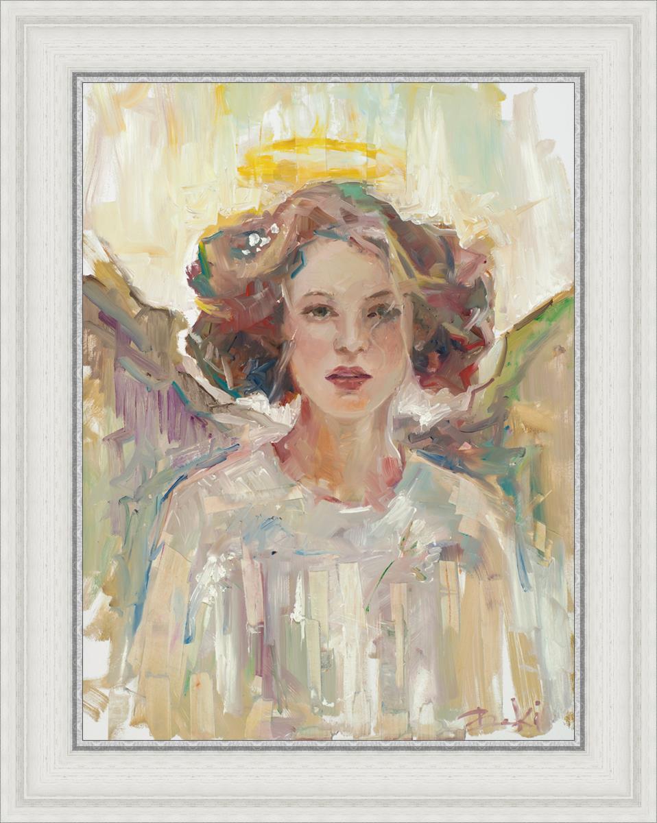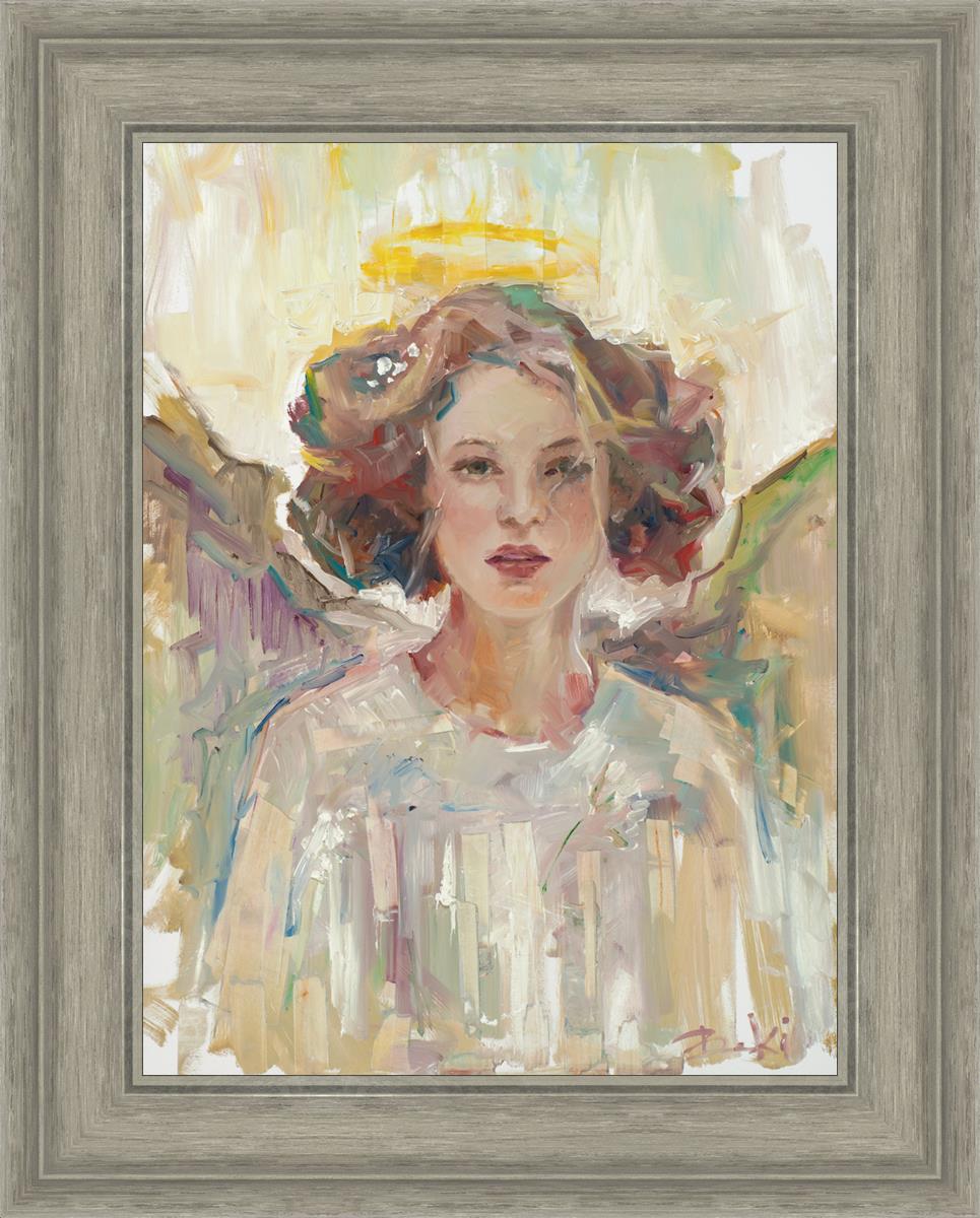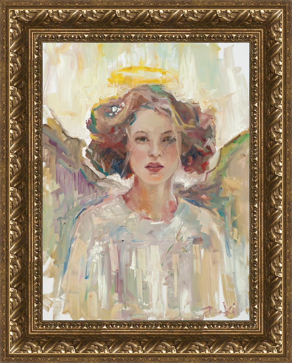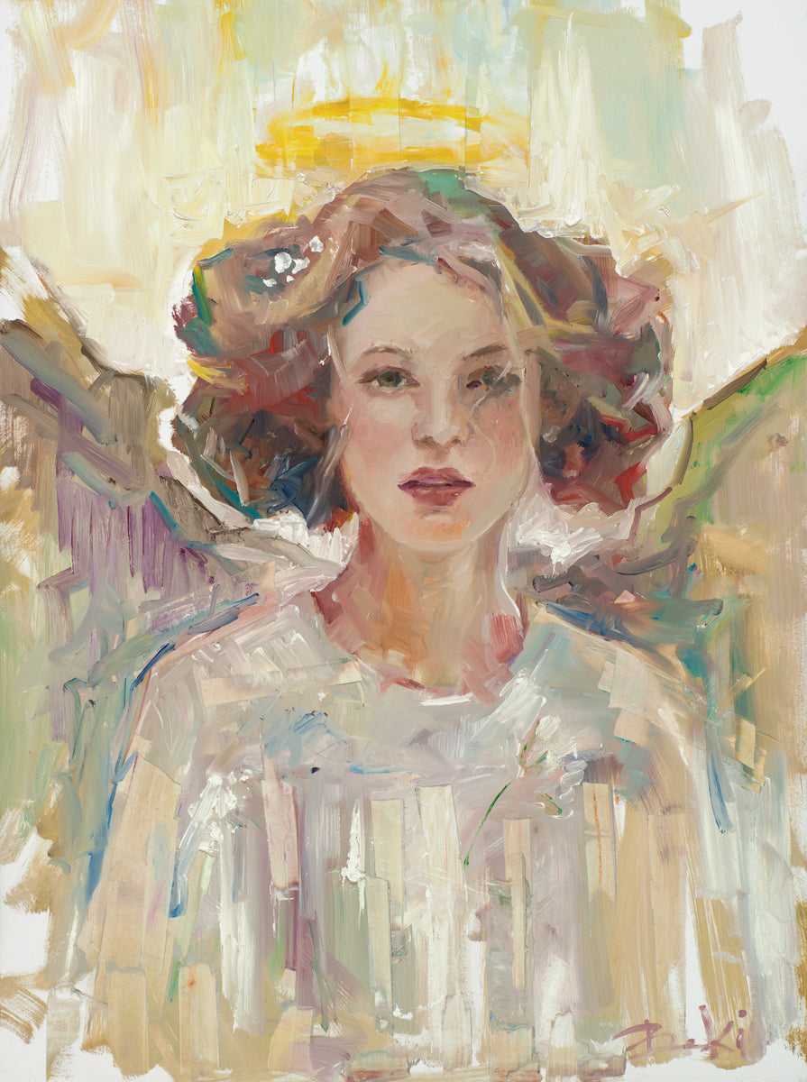 "Disheveled Guardian" is a playful depiction of the artist's vision of her guardian angel - a figure both beautiful and loving, yet slightly worn around the edges. The lively brush strokes suggest chaos and perpetual movement, reflecting the artist's perception of the environment she oversees. Despite the apparent disarray, there's a profound sense of devotion and tenderness in her gaze, highlighting her unwavering commitment to her charge. While she may not find much peace amidst the lively brood of children she watches over, her presence remains a steadfast source of comfort, protection, and unconditional love.