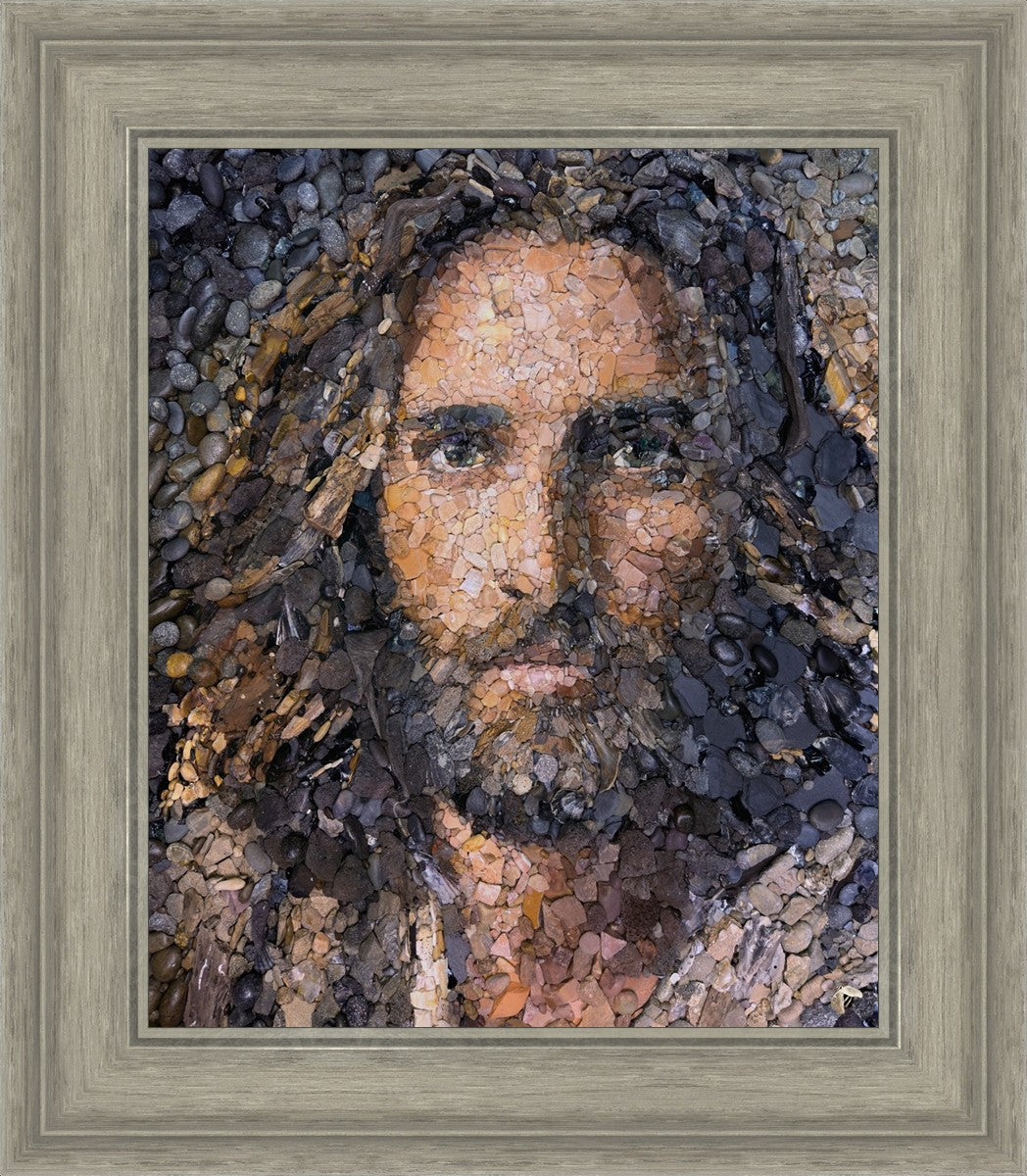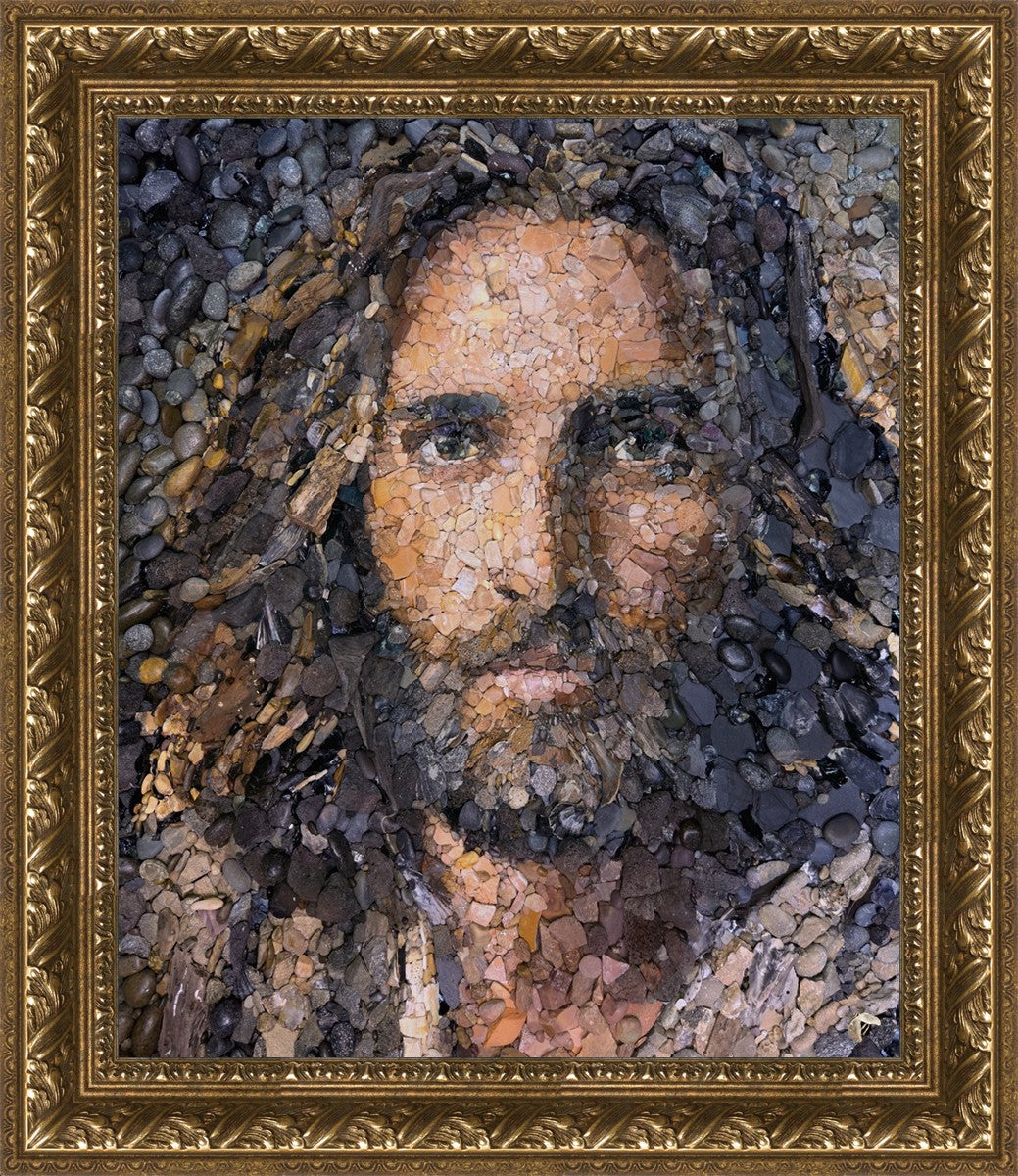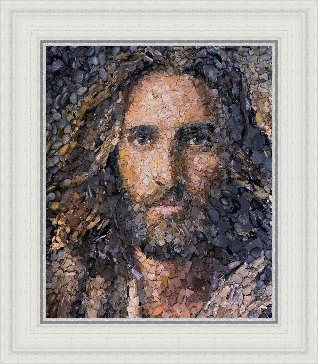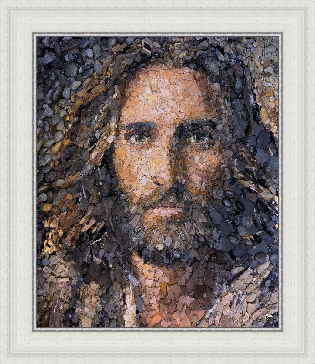 "A Sure Foundation" by Shelby Stroud is a remarkable portrait of Jesus created from a collage of stones, wood, and other earth elements, symbolizing strength and steadfastness. This unique artwork by Shelby Stroud is perfect for Christian homes and spaces, offering a powerful visual representation of faith and resilience.