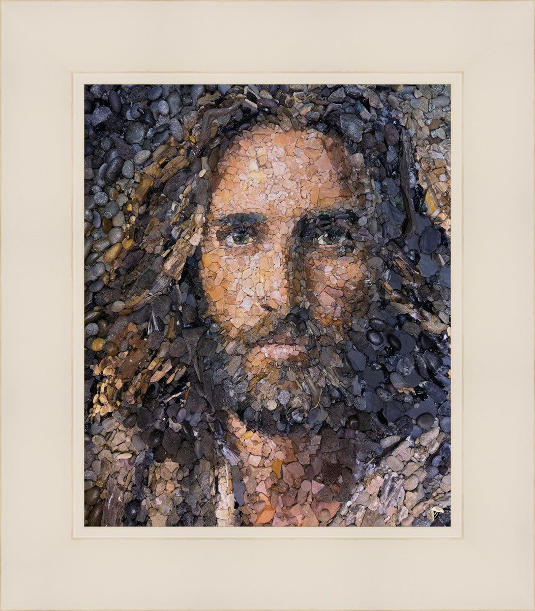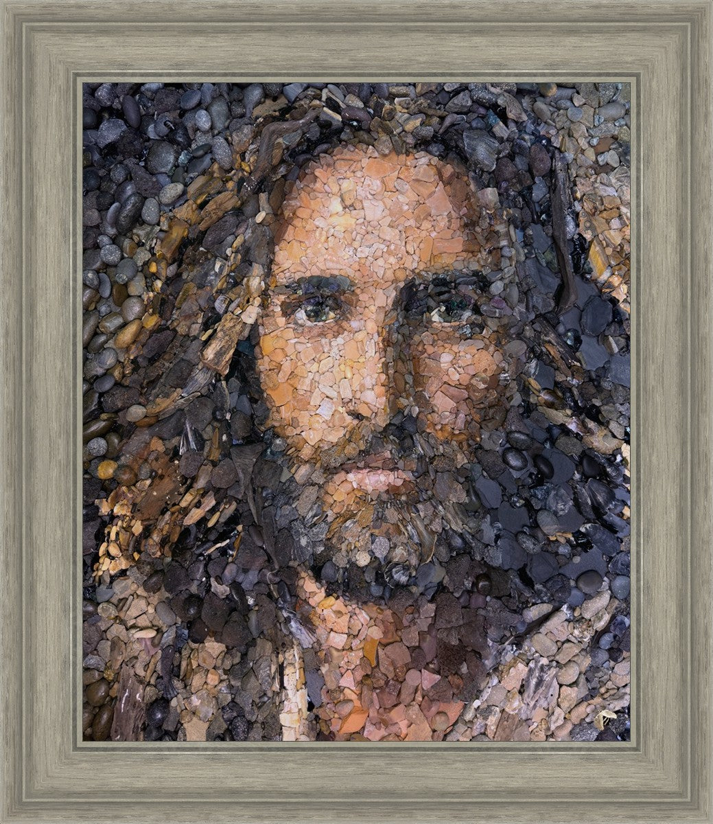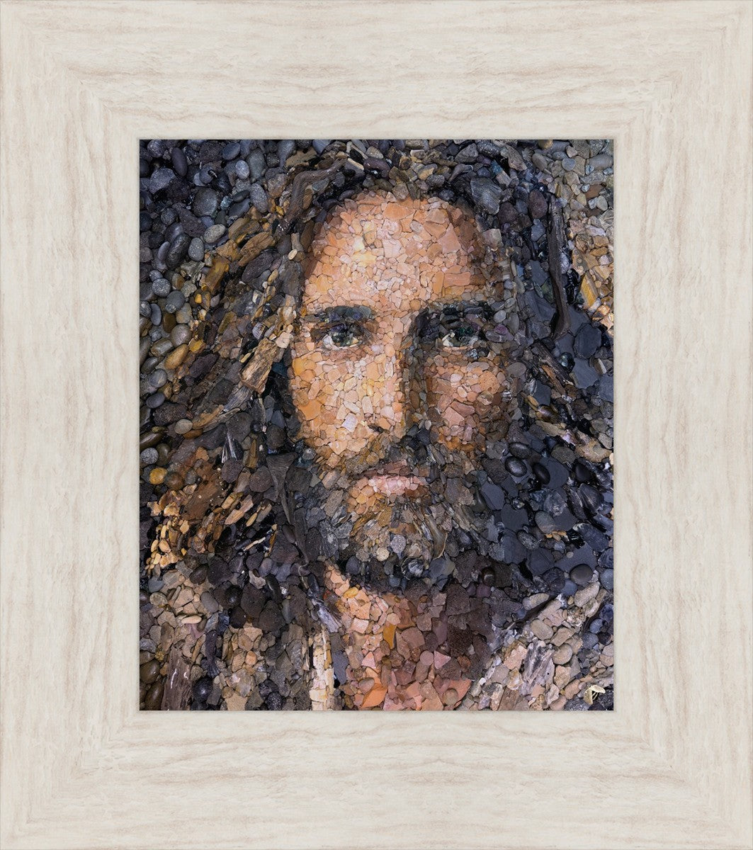 "A Sure Foundation" by Shelby Stroud is a remarkable portrait of Jesus created from a collage of stones, wood, and other earth elements, symbolizing strength and steadfastness. This unique artwork by Shelby Stroud is perfect for Christian homes and spaces, offering a powerful visual representation of faith and resilience.