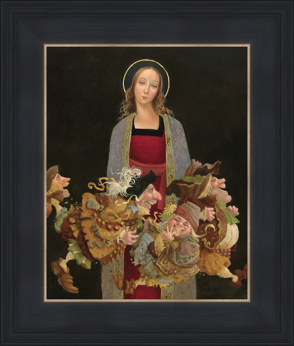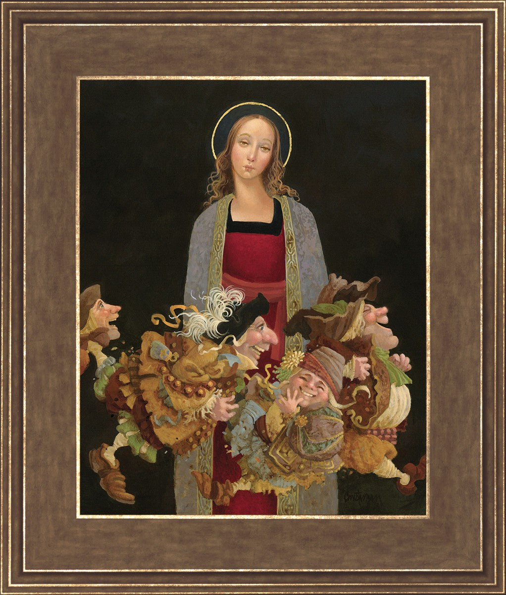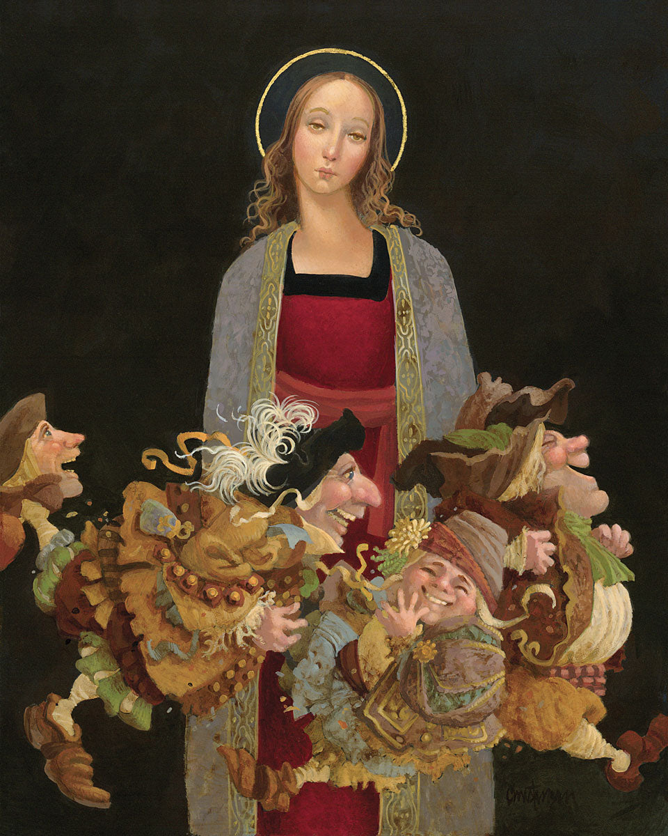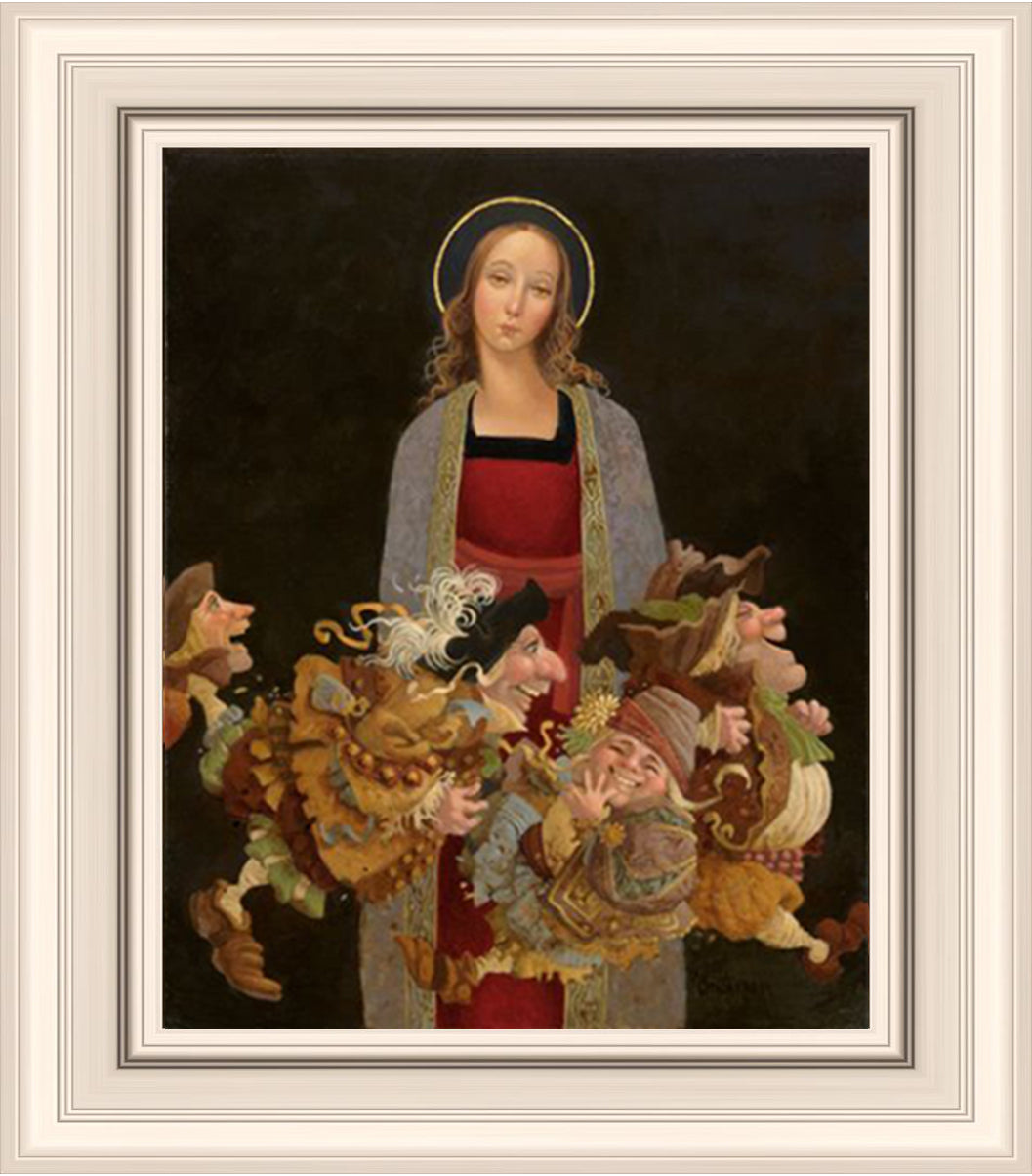 James Christensen said, “We paint to extol the beauty of the subject. I have found that, with very few exceptions, men and women alike relate to the foibles of the poofy guys and enjoy the grace and loveliness of beautiful women. We are God’s most perfect creation, and painting lovely women is a joyful way for me to celebrate that miracle.” In his depiction of Madonna, Christensen says that it is a tribute to all women who patiently endure, “...while the guys rough house in the dining room of life.”