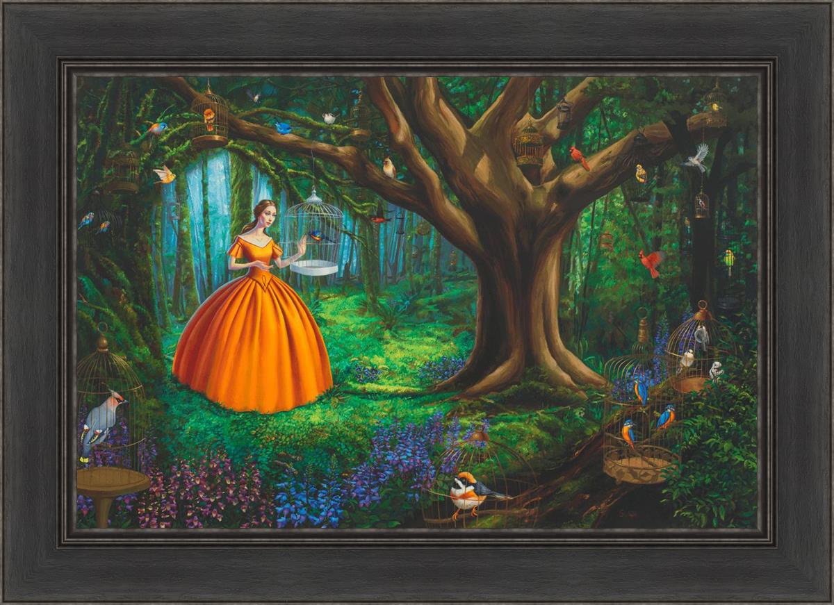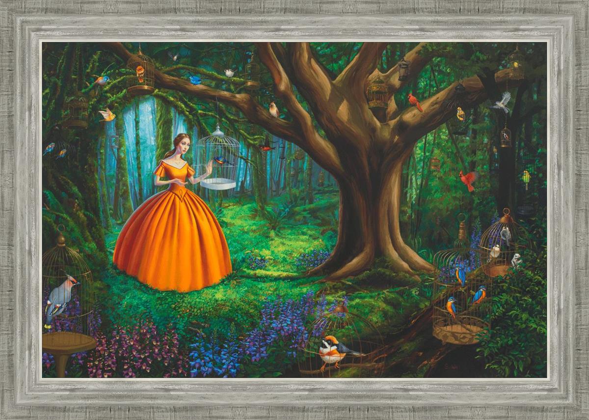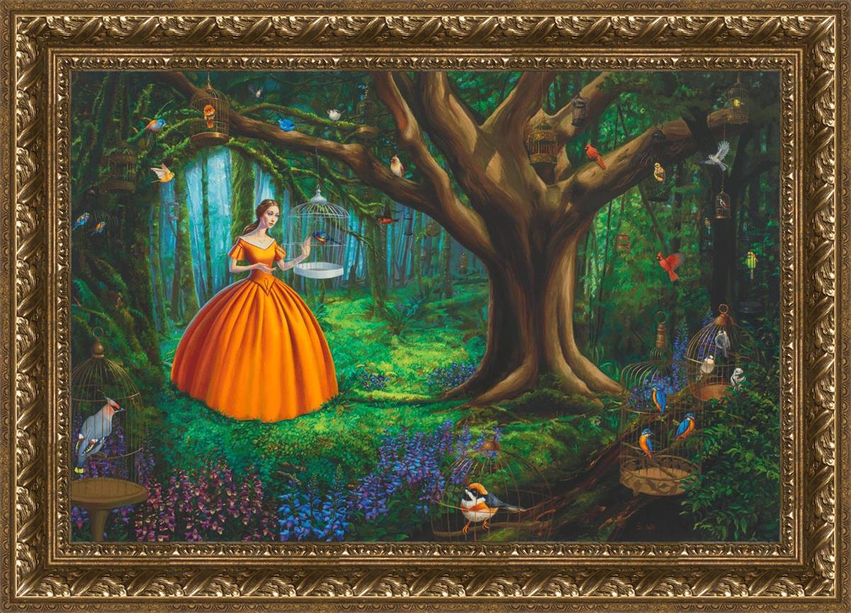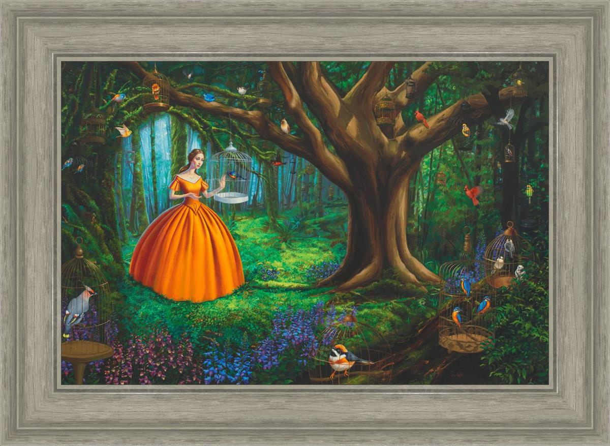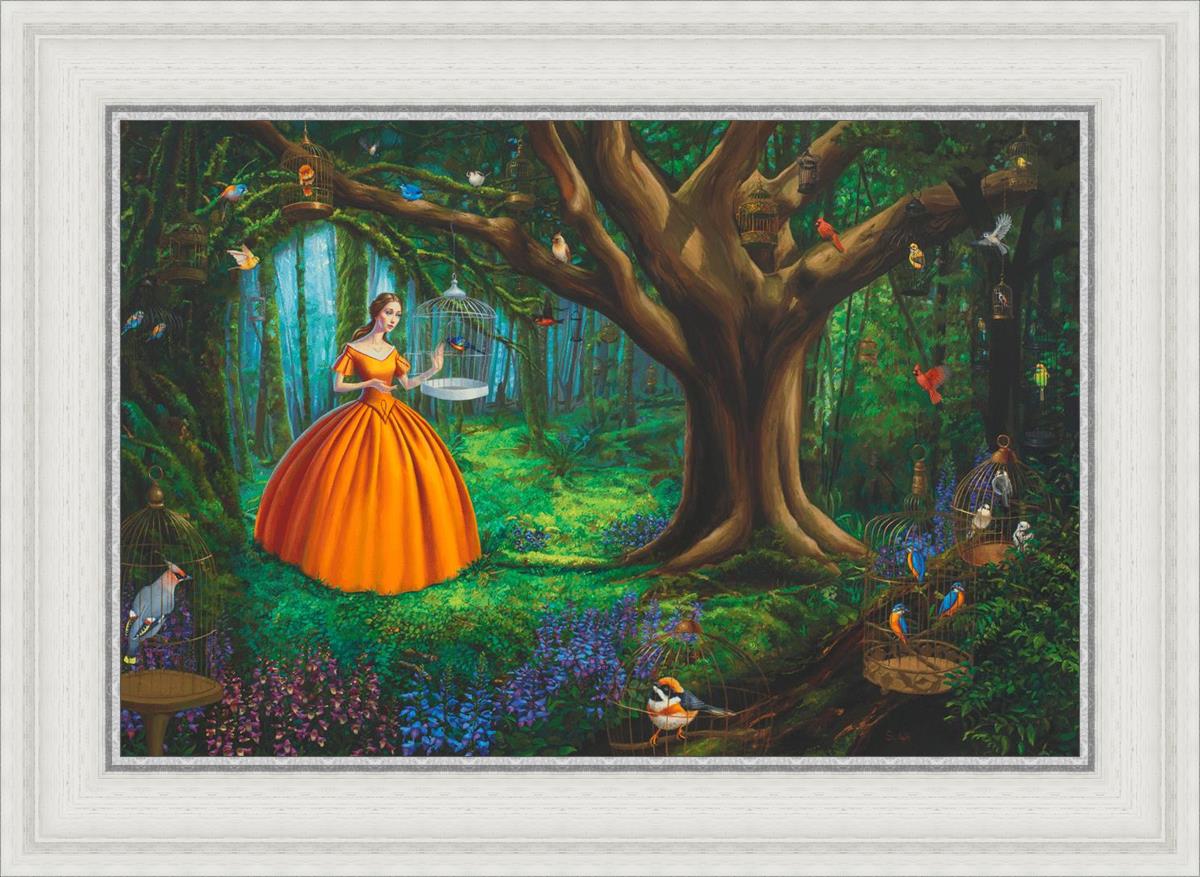 This painting is about letting go of unnecessary burdens and removing conflict from our lives. The idea for this painting, however, actually started from a place of despair. The past couple of years I had felt that my day-to-day existence had been colored largely by the decisions of those in power more than it ever had been before. I was tired of pointless mandates ruining my quality of life and the frequent situations that required herculean patience. I disliked how pride and power were winning over common sense and decency. I despaired over the prevalence of evil and the persecution of goodness. I felt trapped. I felt powerless. I felt used and taken advantage of. And confusion! There was no end to confusion. In response I sketched out an idea of a forest scene with birds all locked up in cages with a woman in the center sadly unable to free them. Here were all these obligations and burdens and expectations placed upon me and I unable to do anything about them. The more I thought about this idea, however, the more I realized that this was a hopeless view of things and not entirely true. Yes, I could not undo others’ choices or change my circumstances in all the ways that I wished, but there was something I could do: I could let go. I could let go of the burden of maintaining my fury. My anger could do nothing to make my situation better; on the contrary, maintaining my indignation was only adding to my woes. I decided, therefore, to change my outlook. I needed to focus on what I could change and let go of that which I couldn’t. I needed to not let outside pressures hold my mind captive. I empowered my character by having her release the birds in the cages. She could not control the actions of the birds, but she could remove her obligation to continue to harbor them and thereby find inner peace.