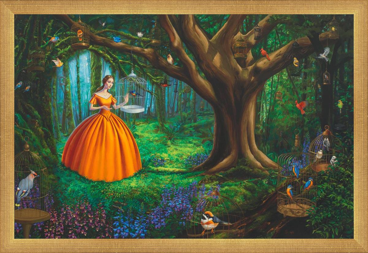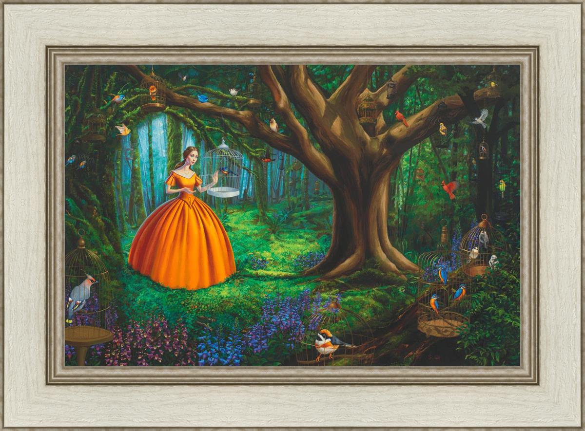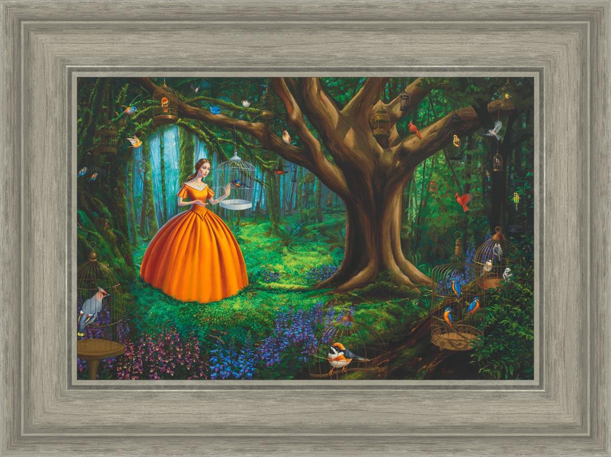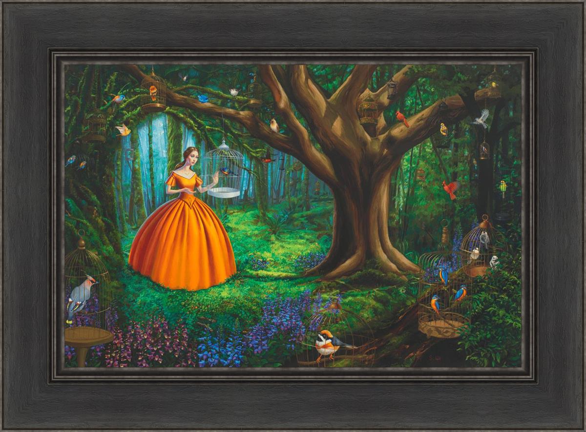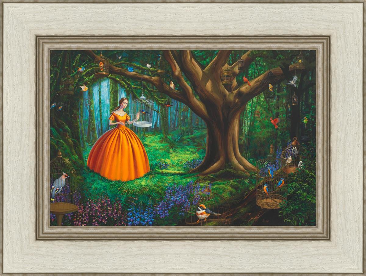 This painting is about letting go of unnecessary burdens and removing conflict from our lives. The idea for this painting, however, actually started from a place of despair. The past couple of years I had felt that my day-to-day existence had been colored largely by the decisions of those in power more than it ever had been before. I was tired of pointless mandates ruining my quality of life and the frequent situations that required herculean patience. I disliked how pride and power were winning over common sense and decency. I despaired over the prevalence of evil and the persecution of goodness. I felt trapped. I felt powerless. I felt used and taken advantage of. And confusion! There was no end to confusion. In response I sketched out an idea of a forest scene with birds all locked up in cages with a woman in the center sadly unable to free them. Here were all these obligations and burdens and expectations placed upon me and I unable to do anything about them. The more I thought about this idea, however, the more I realized that this was a hopeless view of things and not entirely true. Yes, I could not undo others’ choices or change my circumstances in all the ways that I wished, but there was something I could do: I could let go. I could let go of the burden of maintaining my fury. My anger could do nothing to make my situation better; on the contrary, maintaining my indignation was only adding to my woes. I decided, therefore, to change my outlook. I needed to focus on what I could change and let go of that which I couldn’t. I needed to not let outside pressures hold my mind captive. I empowered my character by having her release the birds in the cages. She could not control the actions of the birds, but she could remove her obligation to continue to harbor them and thereby find inner peace.