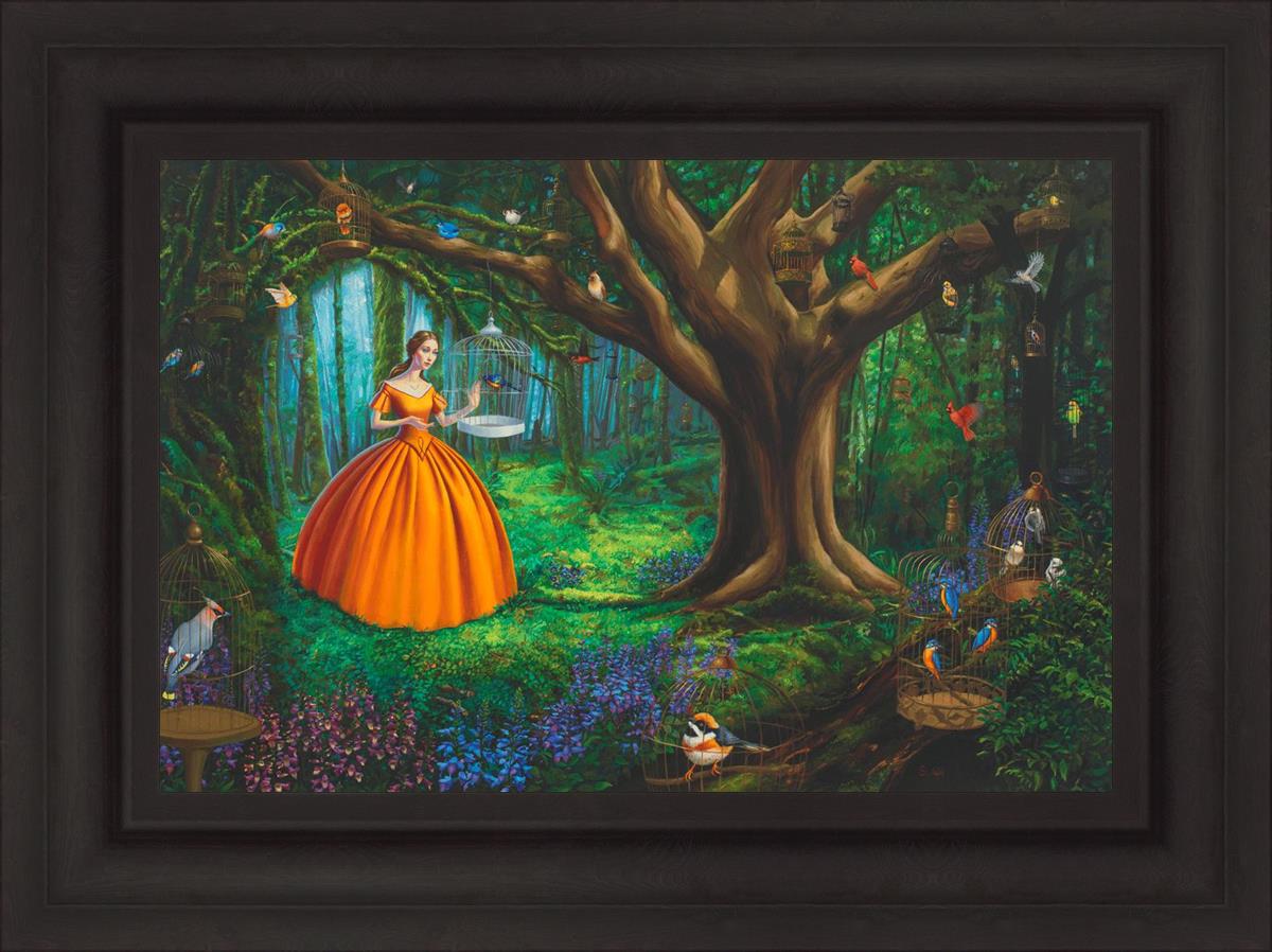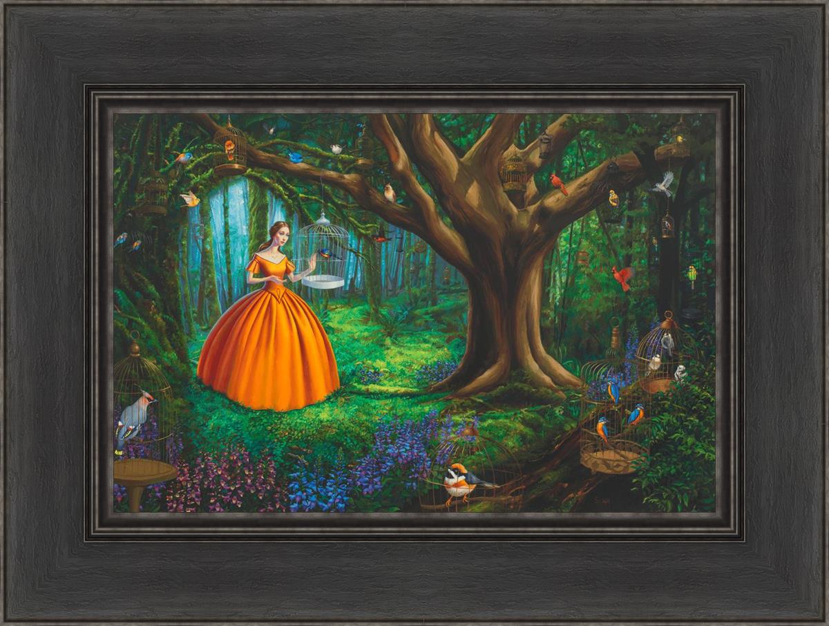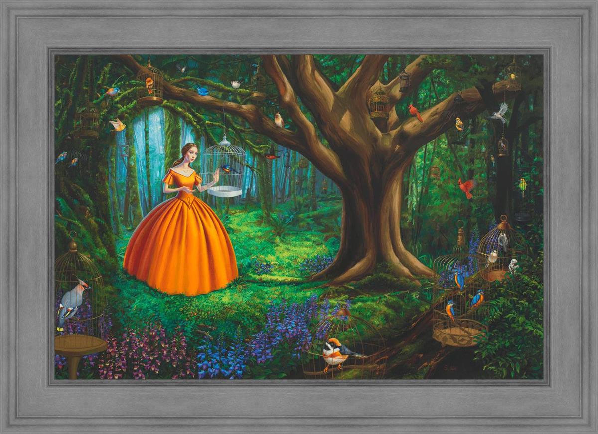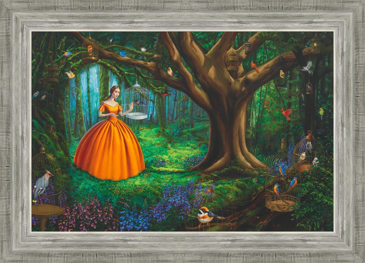 This painting is about letting go of unnecessary burdens and removing conflict from our lives. The idea for this painting, however, actually started from a place of despair. The past couple of years I had felt that my day-to-day existence had been colored largely by the decisions of those in power more than it ever had been before. I was tired of pointless mandates ruining my quality of life and the frequent situations that required herculean patience. I disliked how pride and power were winning over common sense and decency. I despaired over the prevalence of evil and the persecution of goodness. I felt trapped. I felt powerless. I felt used and taken advantage of. And confusion! There was no end to confusion. In response I sketched out an idea of a forest scene with birds all locked up in cages with a woman in the center sadly unable to free them. Here were all these obligations and burdens and expectations placed upon me and I unable to do anything about them. The more I thought about this idea, however, the more I realized that this was a hopeless view of things and not entirely true. Yes, I could not undo others’ choices or change my circumstances in all the ways that I wished, but there was something I could do: I could let go. I could let go of the burden of maintaining my fury. My anger could do nothing to make my situation better; on the contrary, maintaining my indignation was only adding to my woes. I decided, therefore, to change my outlook. I needed to focus on what I could change and let go of that which I couldn’t. I needed to not let outside pressures hold my mind captive. I empowered my character by having her release the birds in the cages. She could not control the actions of the birds, but she could remove her obligation to continue to harbor them and thereby find inner peace.