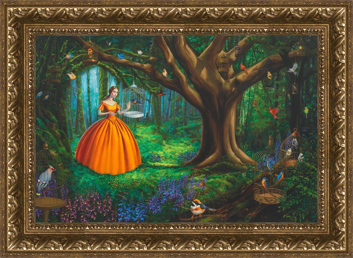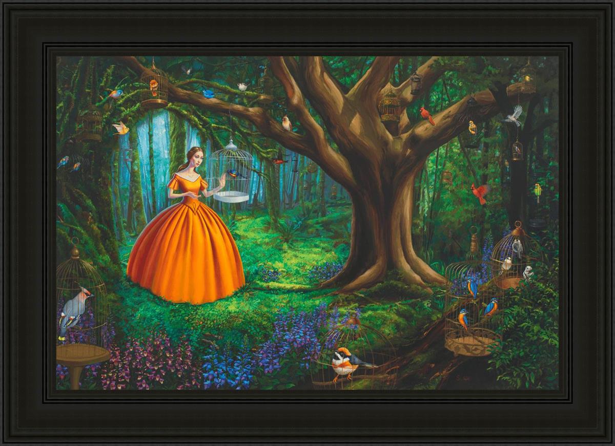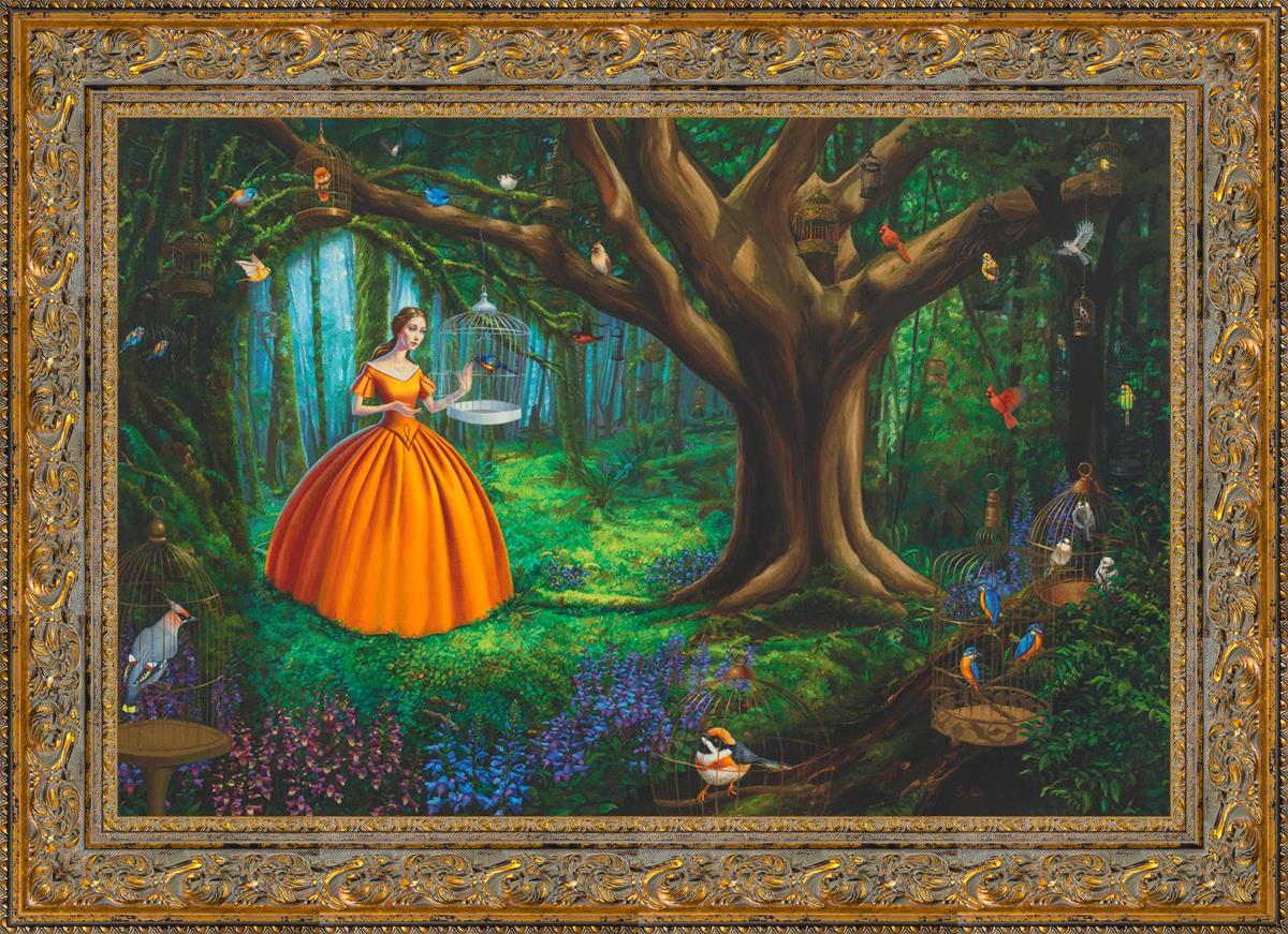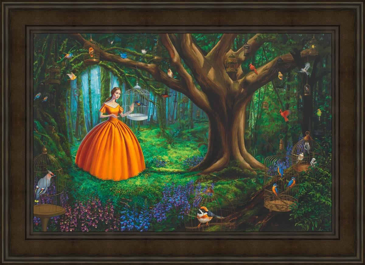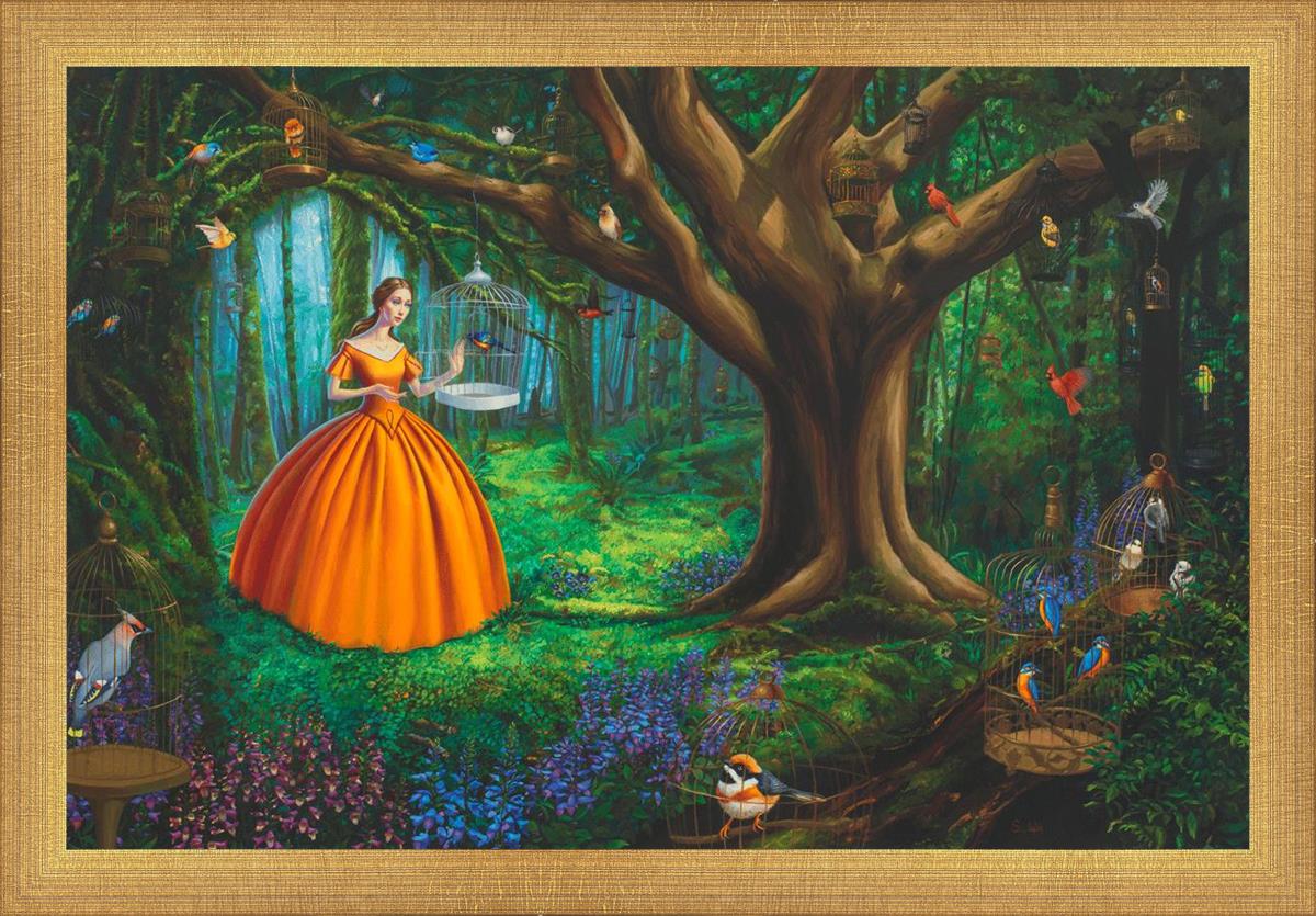 This painting is about letting go of unnecessary burdens and removing conflict from our lives. The idea for this painting, however, actually started from a place of despair. The past couple of years I had felt that my day-to-day existence had been colored largely by the decisions of those in power more than it ever had been before. I was tired of pointless mandates ruining my quality of life and the frequent situations that required herculean patience. I disliked how pride and power were winning over common sense and decency. I despaired over the prevalence of evil and the persecution of goodness. I felt trapped. I felt powerless. I felt used and taken advantage of. And confusion! There was no end to confusion. In response I sketched out an idea of a forest scene with birds all locked up in cages with a woman in the center sadly unable to free them. Here were all these obligations and burdens and expectations placed upon me and I unable to do anything about them. The more I thought about this idea, however, the more I realized that this was a hopeless view of things and not entirely true. Yes, I could not undo others’ choices or change my circumstances in all the ways that I wished, but there was something I could do: I could let go. I could let go of the burden of maintaining my fury. My anger could do nothing to make my situation better; on the contrary, maintaining my indignation was only adding to my woes. I decided, therefore, to change my outlook. I needed to focus on what I could change and let go of that which I couldn’t. I needed to not let outside pressures hold my mind captive. I empowered my character by having her release the birds in the cages. She could not control the actions of the birds, but she could remove her obligation to continue to harbor them and thereby find inner peace.