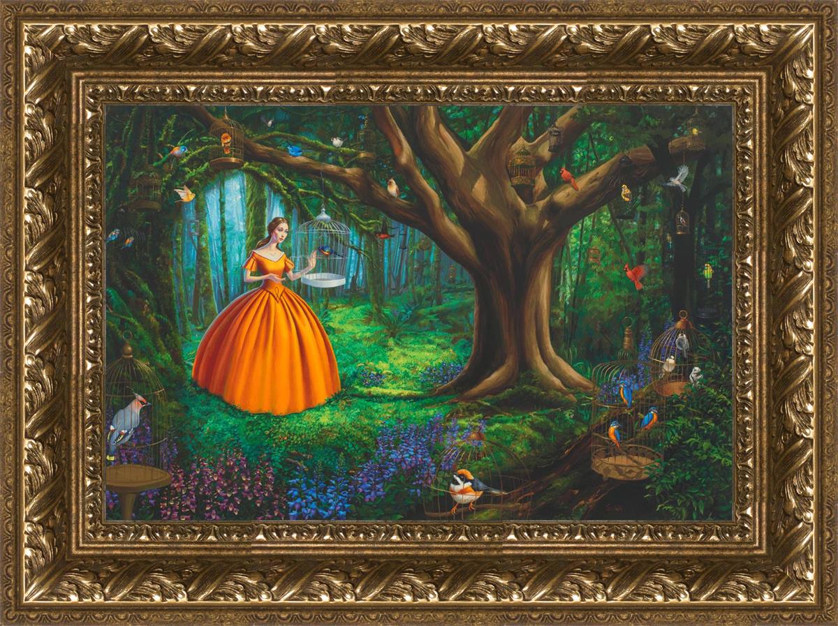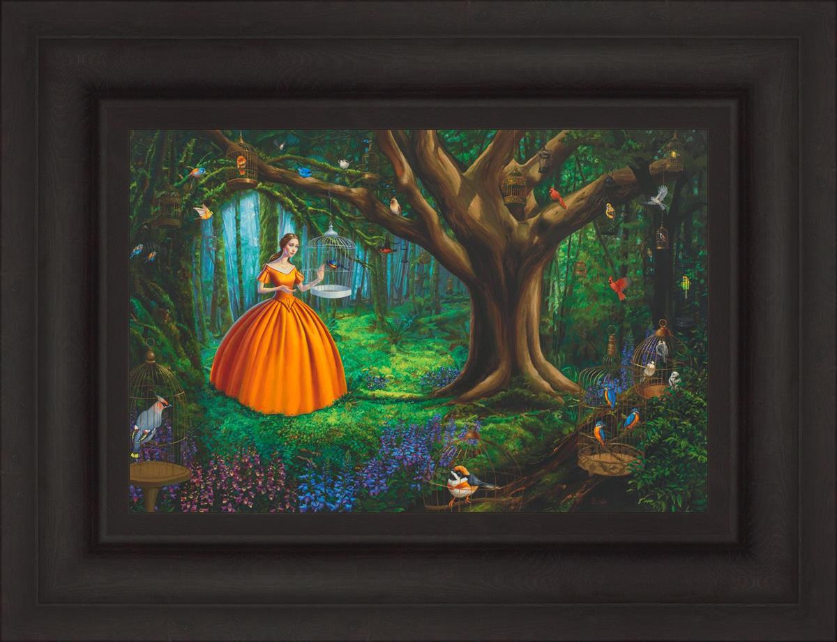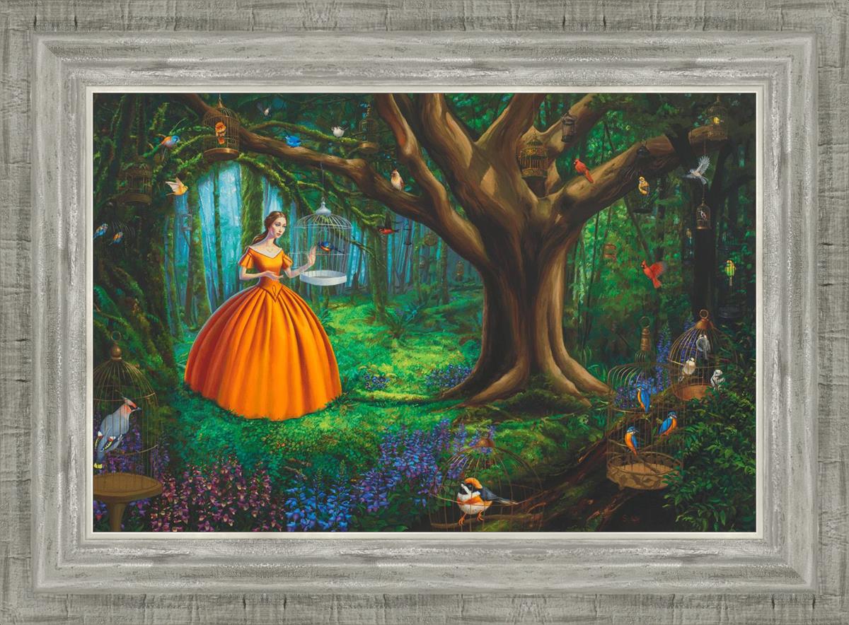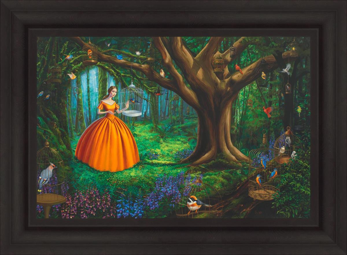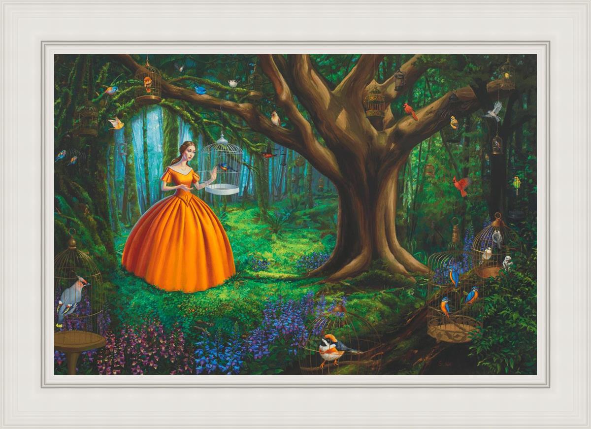 This painting is about letting go of unnecessary burdens and removing conflict from our lives. The idea for this painting, however, actually started from a place of despair. The past couple of years I had felt that my day-to-day existence had been colored largely by the decisions of those in power more than it ever had been before. I was tired of pointless mandates ruining my quality of life and the frequent situations that required herculean patience. I disliked how pride and power were winning over common sense and decency. I despaired over the prevalence of evil and the persecution of goodness. I felt trapped. I felt powerless. I felt used and taken advantage of. And confusion! There was no end to confusion. In response I sketched out an idea of a forest scene with birds all locked up in cages with a woman in the center sadly unable to free them. Here were all these obligations and burdens and expectations placed upon me and I unable to do anything about them. The more I thought about this idea, however, the more I realized that this was a hopeless view of things and not entirely true. Yes, I could not undo others’ choices or change my circumstances in all the ways that I wished, but there was something I could do: I could let go. I could let go of the burden of maintaining my fury. My anger could do nothing to make my situation better; on the contrary, maintaining my indignation was only adding to my woes. I decided, therefore, to change my outlook. I needed to focus on what I could change and let go of that which I couldn’t. I needed to not let outside pressures hold my mind captive. I empowered my character by having her release the birds in the cages. She could not control the actions of the birds, but she could remove her obligation to continue to harbor them and thereby find inner peace.