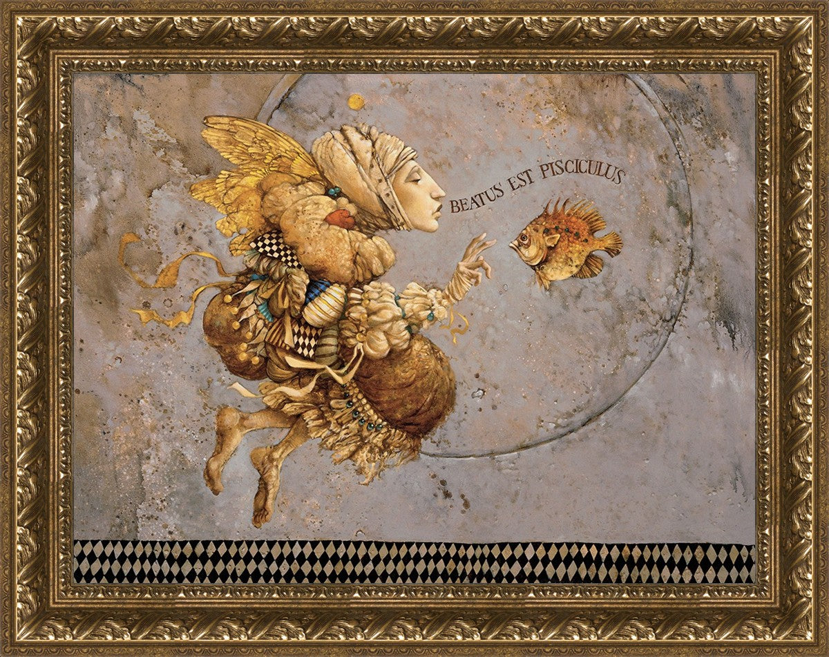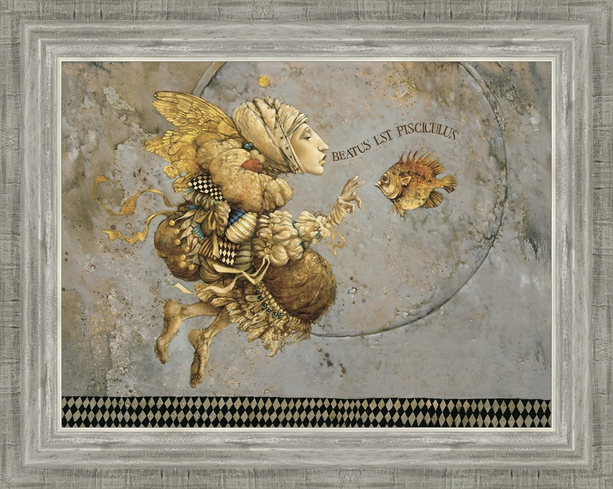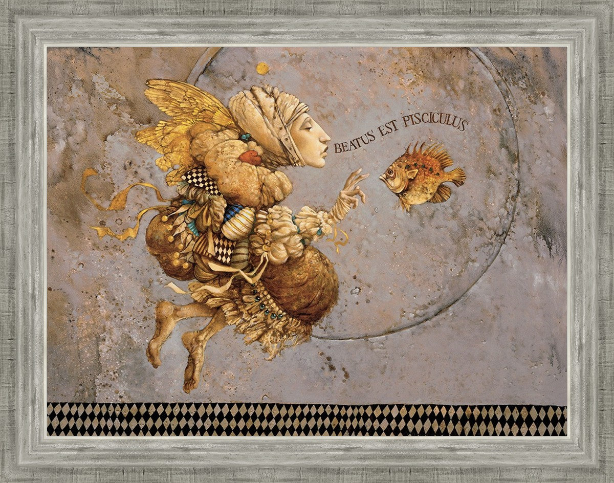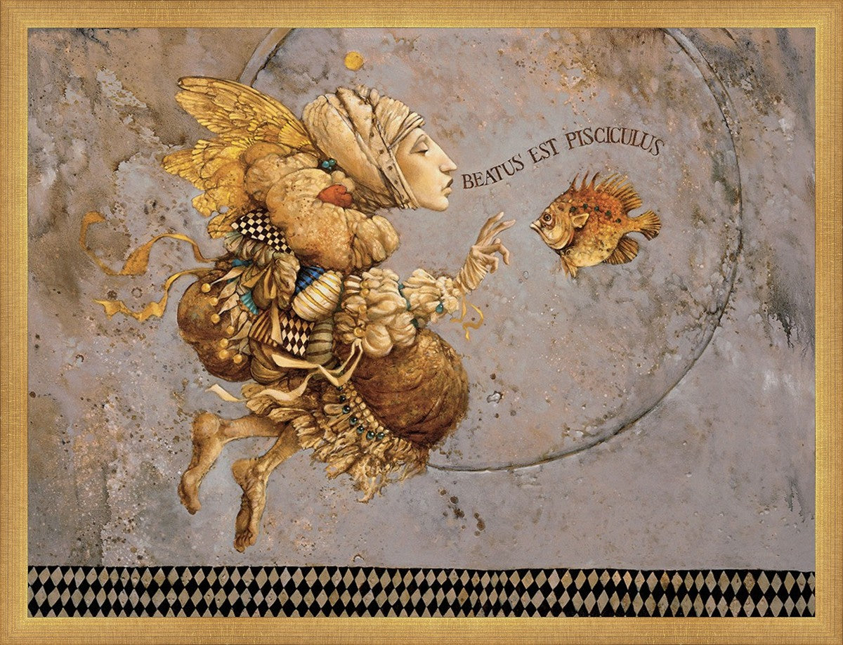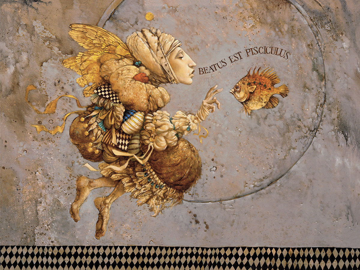 "The words coming out of this angel’s mouth are purposely provocative and designed to make you wonder 'What does that mean?' They are in Latin, "beatus est pisciculus," meaning 'Blessed is the little fish.' Floating fish symbolize the magic all around us and and in Jim's world they are blessed little things unto themselves, bringing this magic into our lives. Is the angel blessing the fish or the fish blessing the angel? The fish is a symbol I frequently use and this painting was meant as my 'thank-you' for a lot of the magic in my life."