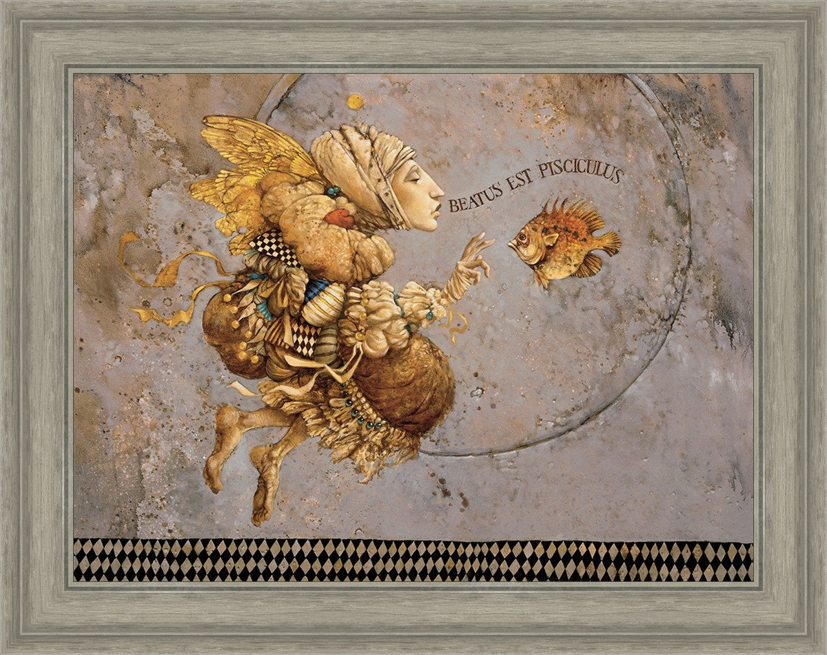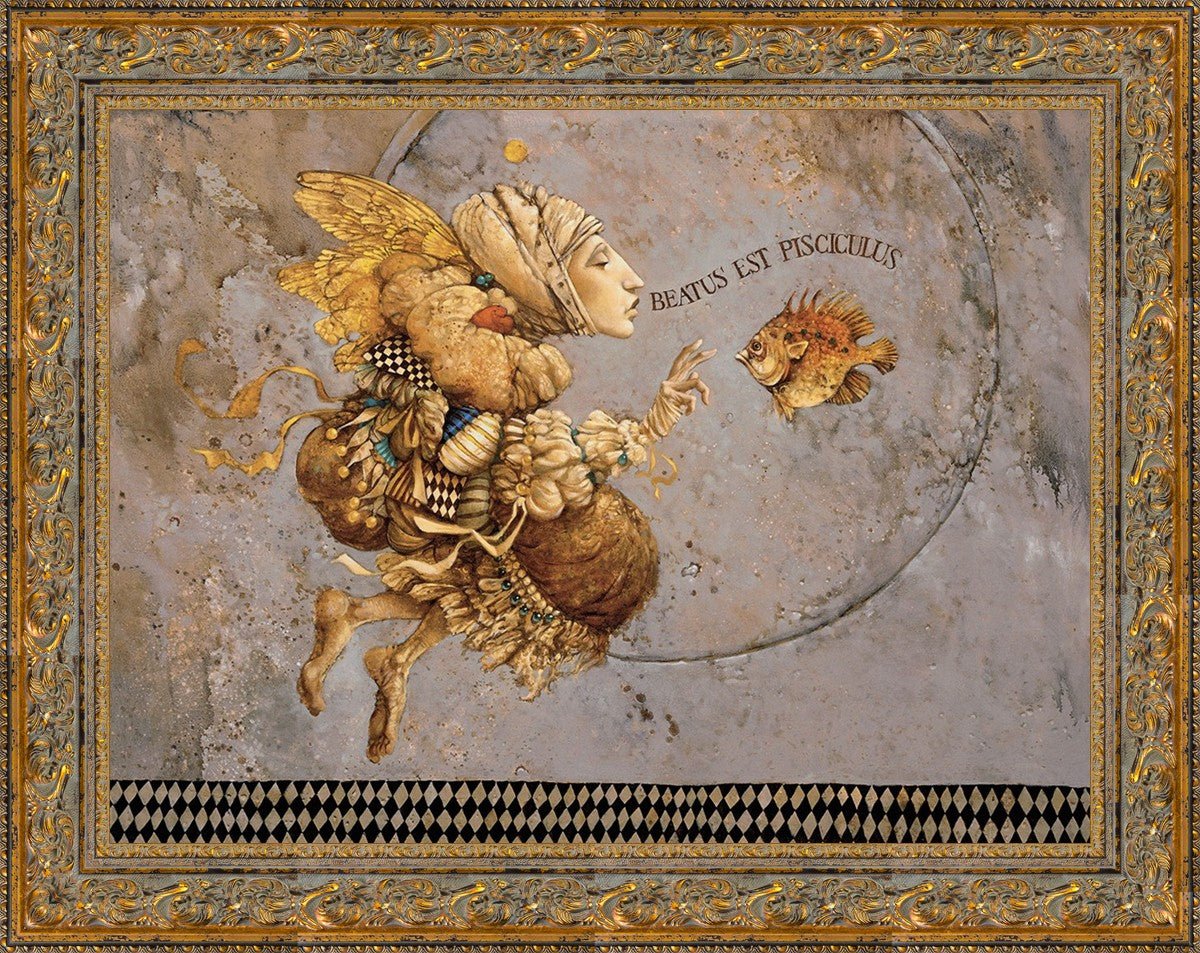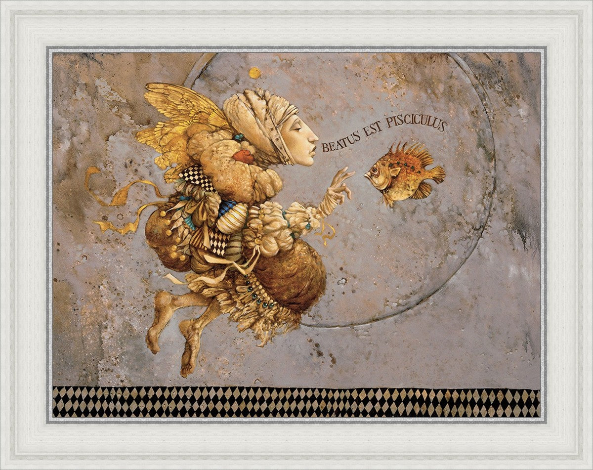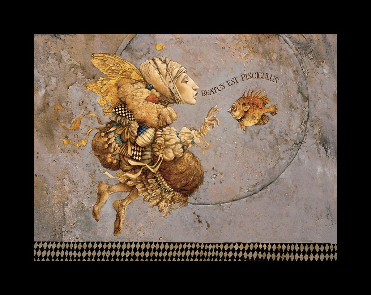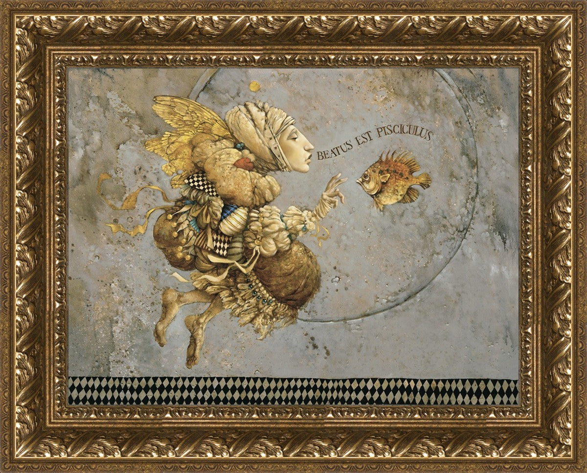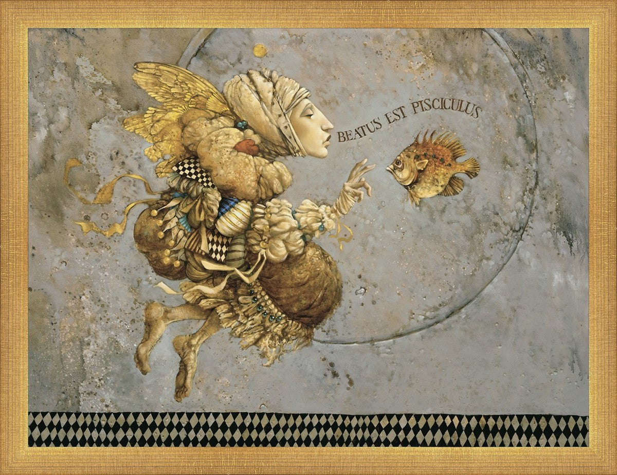 "The words coming out of this angel’s mouth are purposely provocative and designed to make you wonder 'What does that mean?' They are in Latin, "beatus est pisciculus," meaning 'Blessed is the little fish.' Floating fish symbolize the magic all around us and and in Jim's world they are blessed little things unto themselves, bringing this magic into our lives. Is the angel blessing the fish or the fish blessing the angel? The fish is a symbol I frequently use and this painting was meant as my 'thank-you' for a lot of the magic in my life."