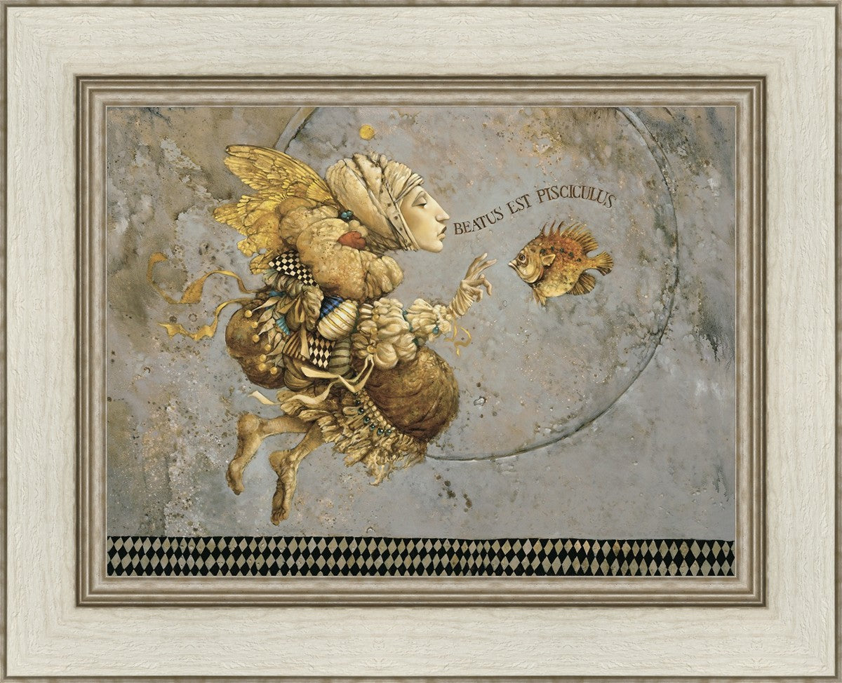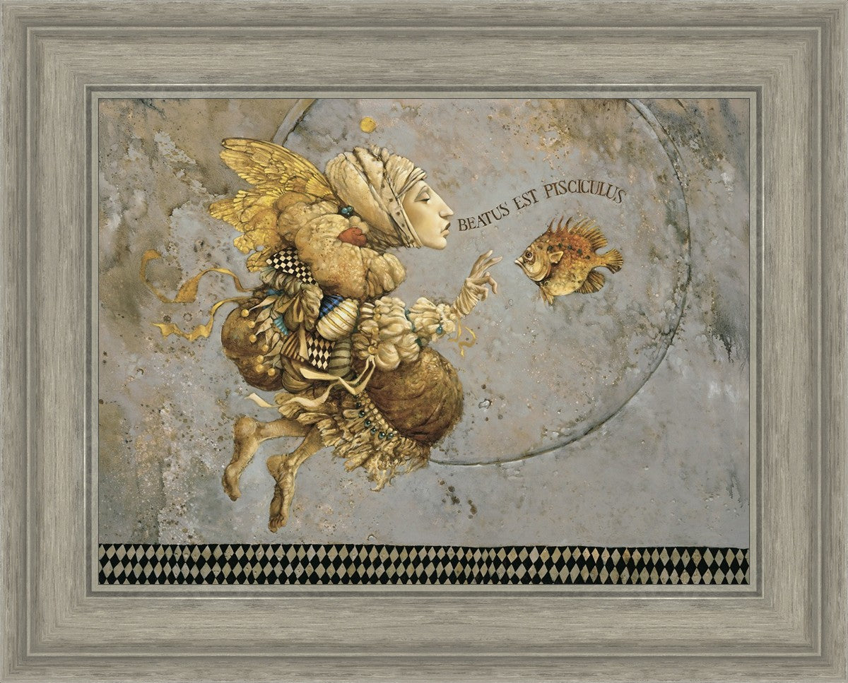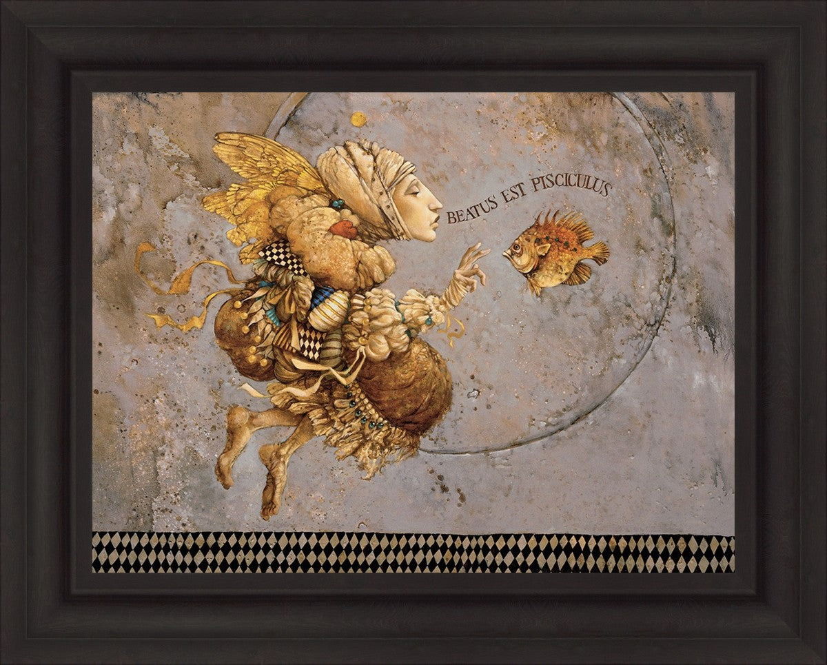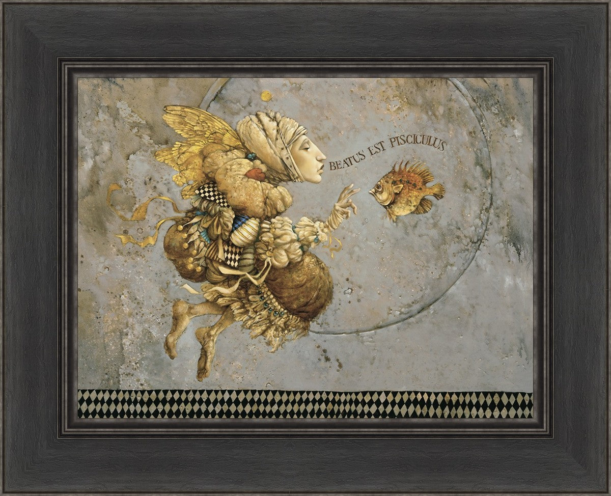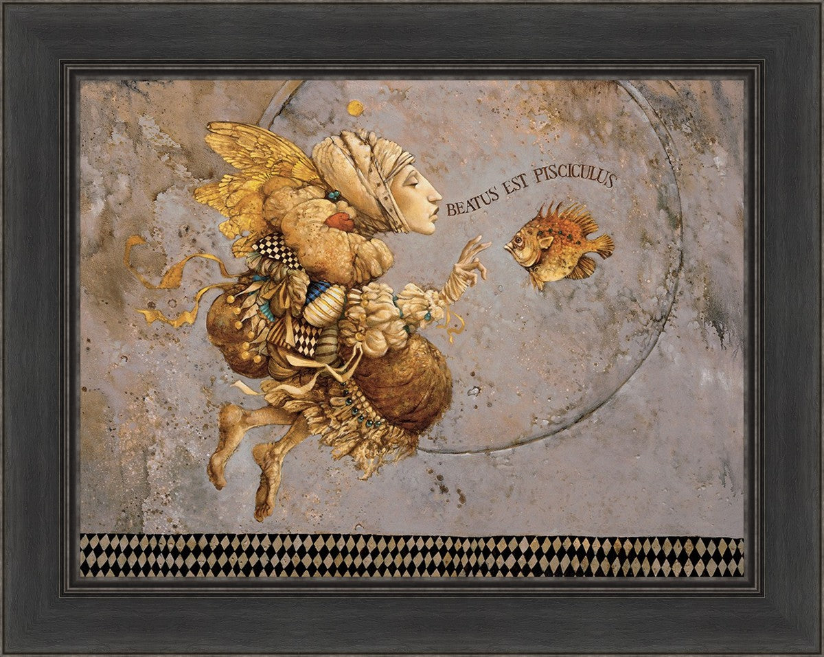 "The words coming out of this angel’s mouth are purposely provocative and designed to make you wonder 'What does that mean?' They are in Latin, "beatus est pisciculus," meaning 'Blessed is the little fish.' Floating fish symbolize the magic all around us and and in Jim's world they are blessed little things unto themselves, bringing this magic into our lives. Is the angel blessing the fish or the fish blessing the angel? The fish is a symbol I frequently use and this painting was meant as my 'thank-you' for a lot of the magic in my life."