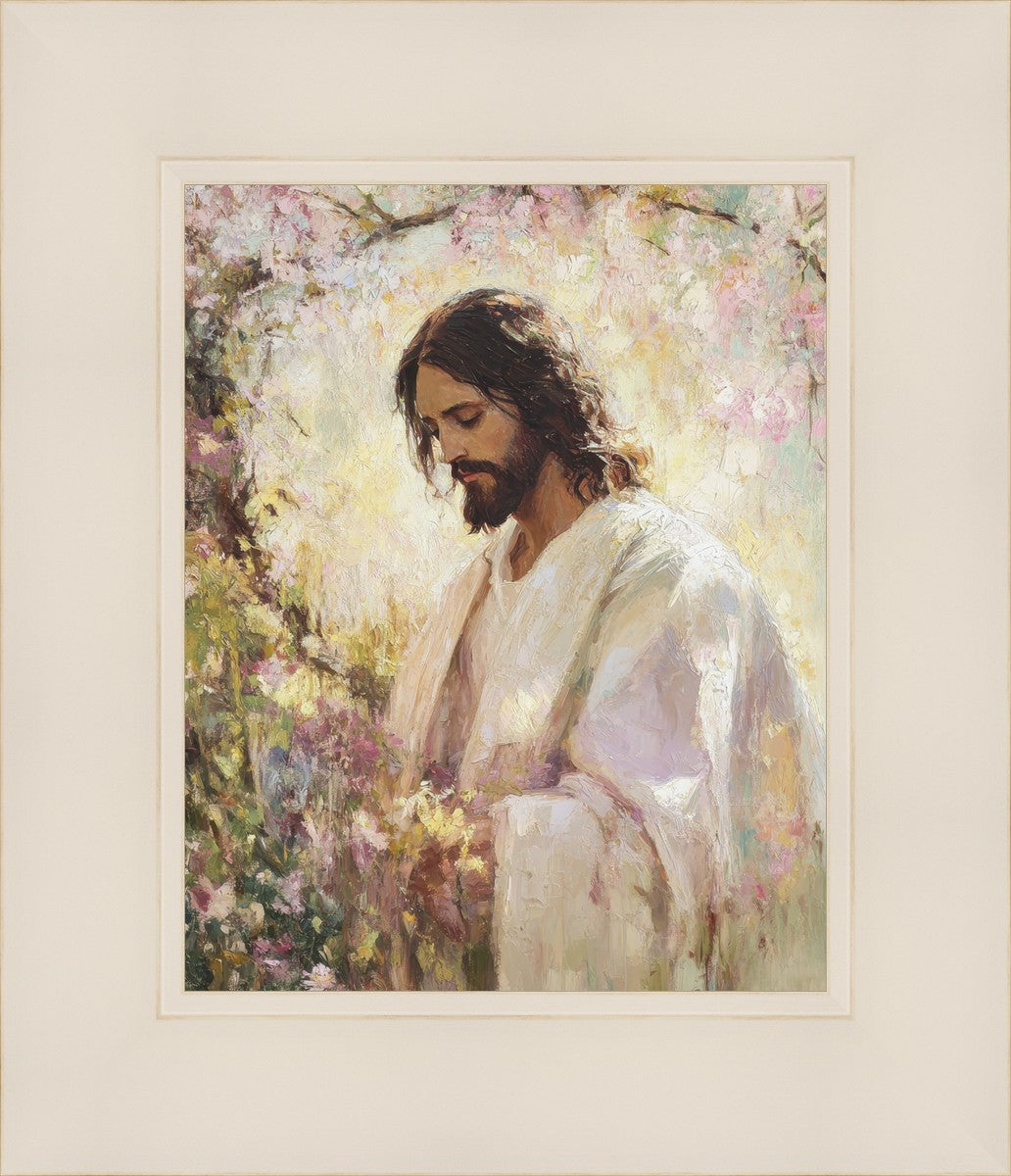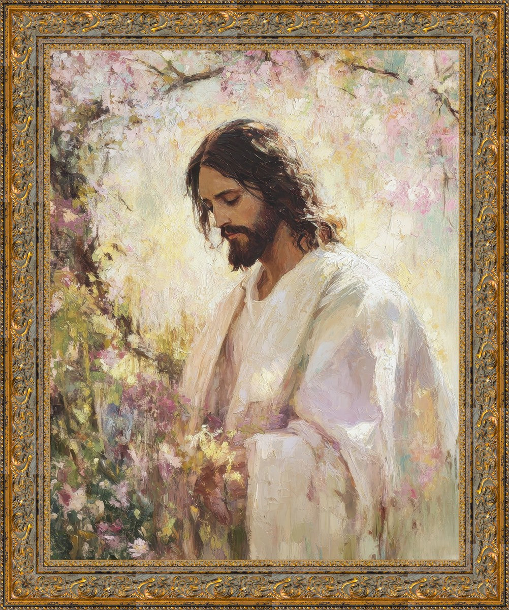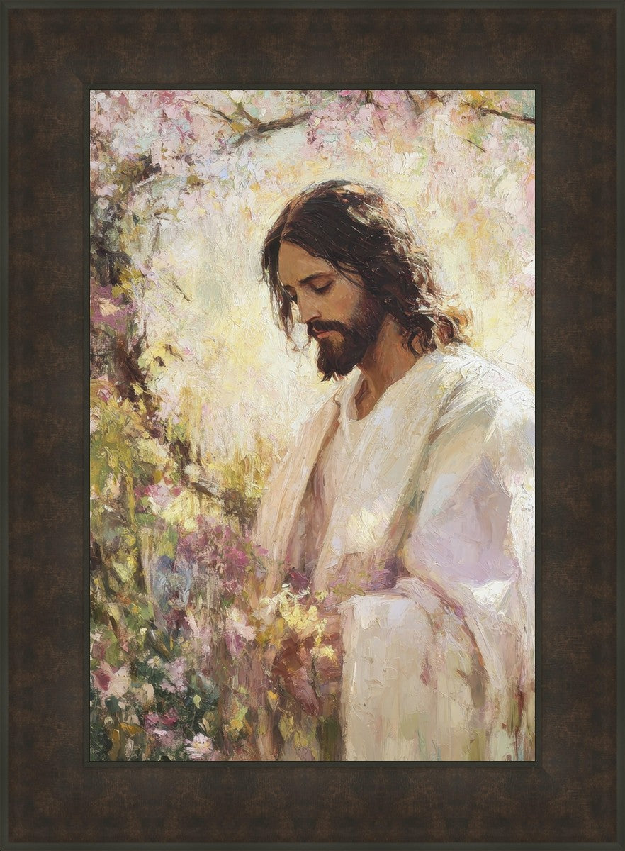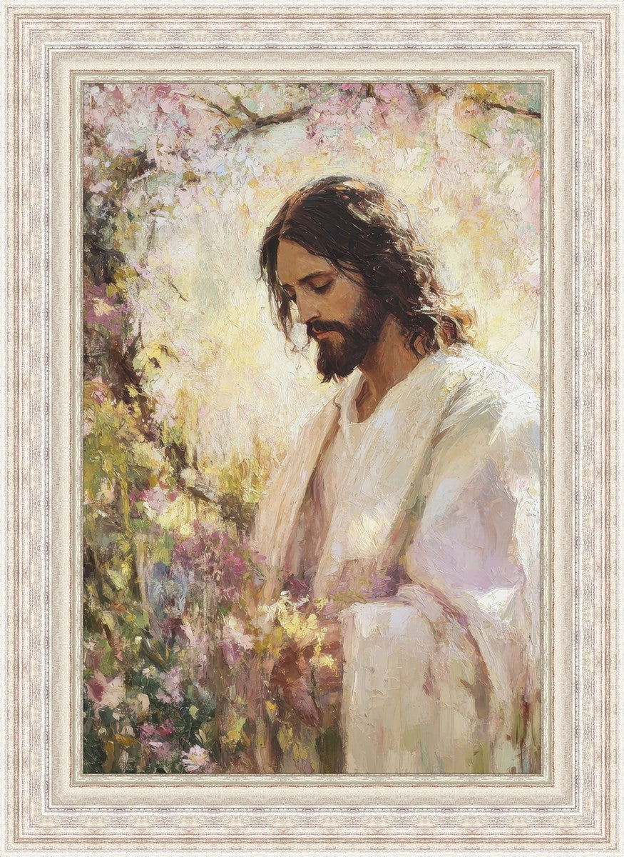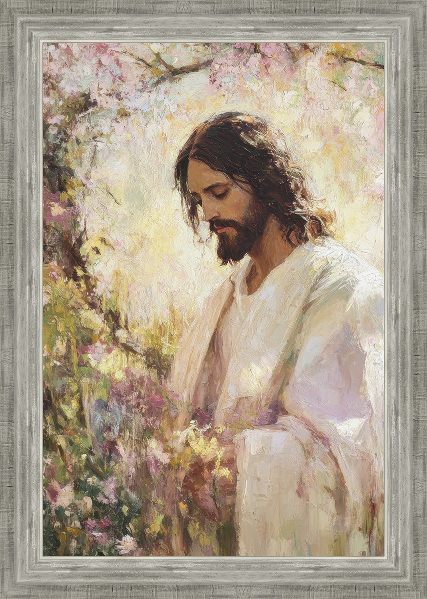 We wanted to capture the simple yet profound truth that we are all divinely created with love and purpose. Jesus stands among delicate flower blossoms, a reminder that just as God carefully forms each petal. He has created each of us with the same beauty and intention. This piece is a quiet nod to His infinite care—not just for the world around us, but for every soul.