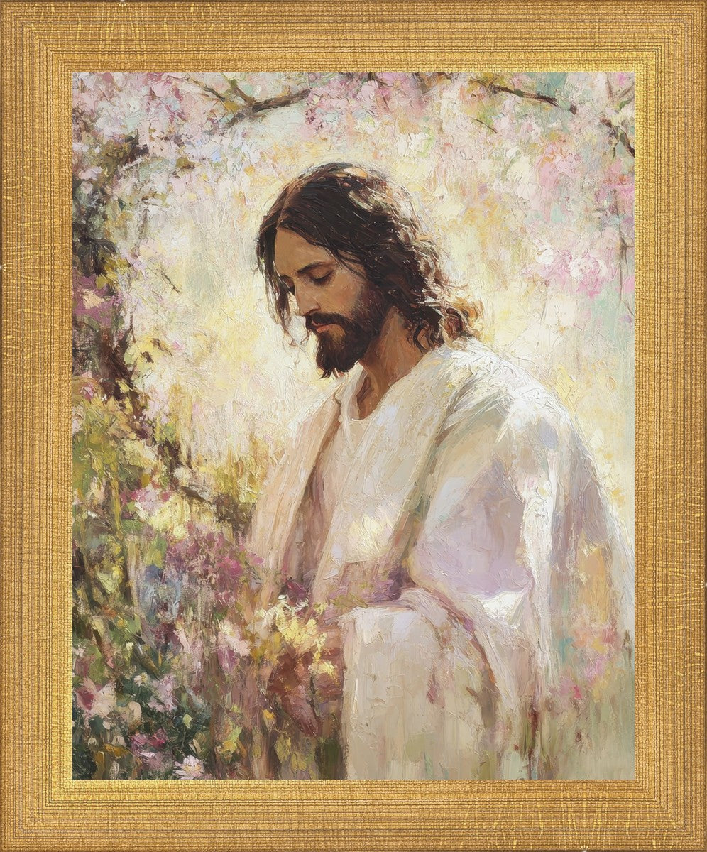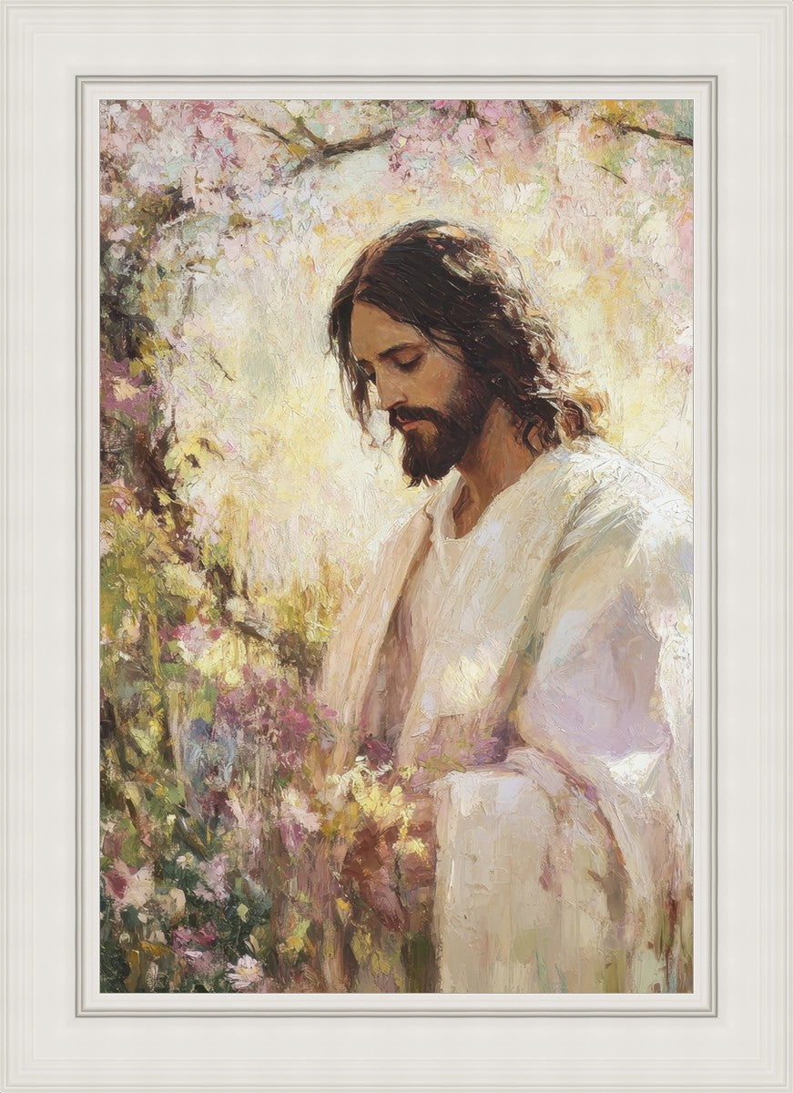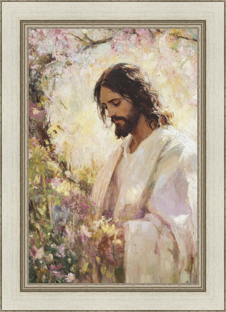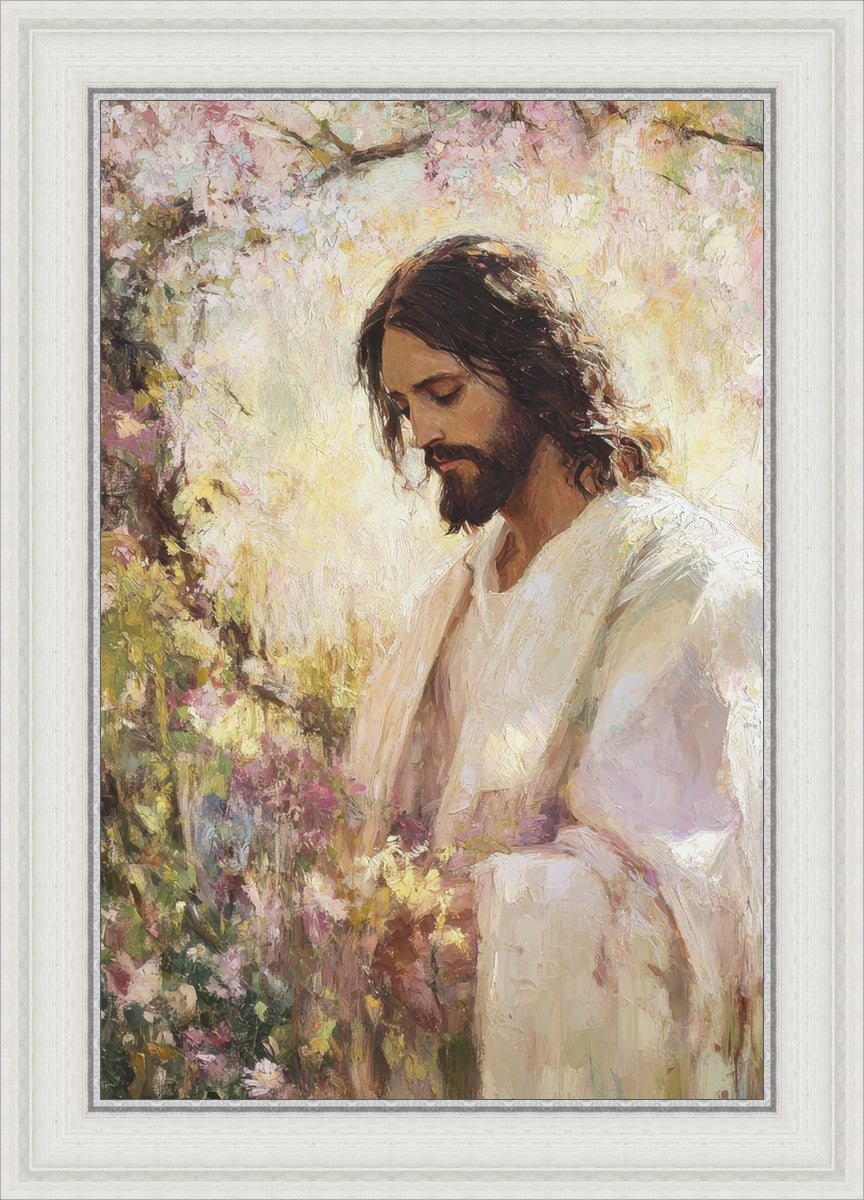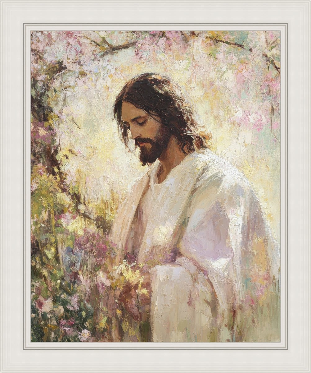 We wanted to capture the simple yet profound truth that we are all divinely created with love and purpose. Jesus stands among delicate flower blossoms, a reminder that just as God carefully forms each petal. He has created each of us with the same beauty and intention. This piece is a quiet nod to His infinite care—not just for the world around us, but for every soul.