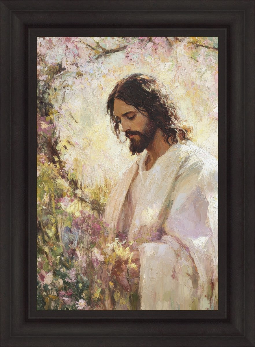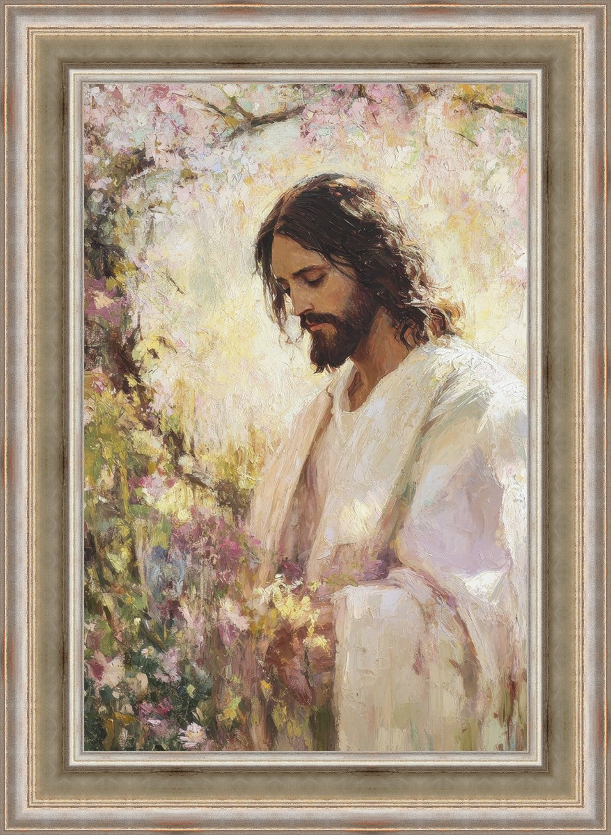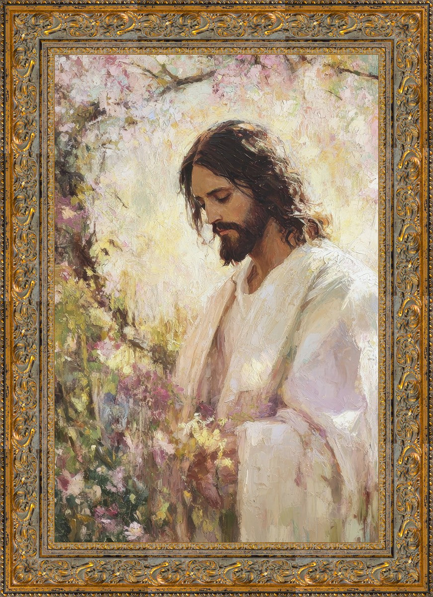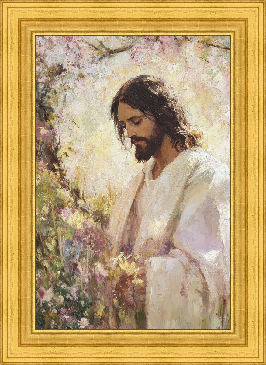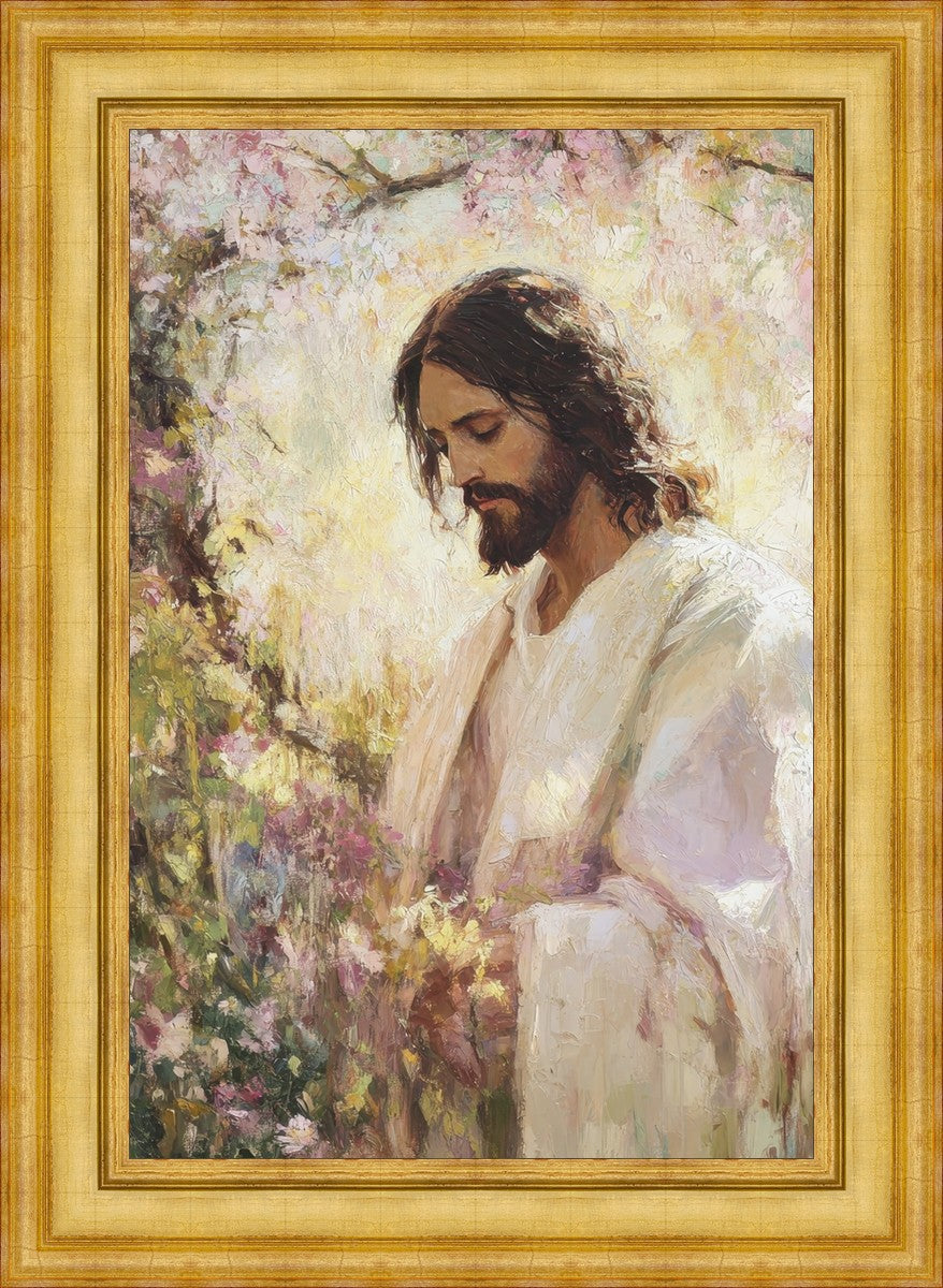 We wanted to capture the simple yet profound truth that we are all divinely created with love and purpose. Jesus stands among delicate flower blossoms, a reminder that just as God carefully forms each petal. He has created each of us with the same beauty and intention. This piece is a quiet nod to His infinite care—not just for the world around us, but for every soul.