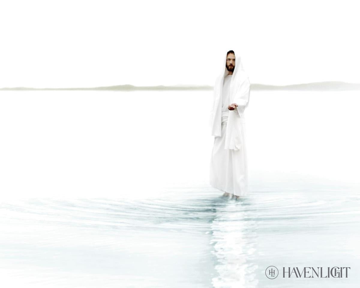 "Come and See Blue" by Scott Sumner showcases a striking mountain silhouette against a serene blue water backdrop, with Jesus Christ extending a welcoming hand, dressed in a white shawl and robe. This captivating artwork evokes a sense of spiritual invitation and tranquility, resonating with viewers seeking inspiration and a deeper connection to their faith journey.