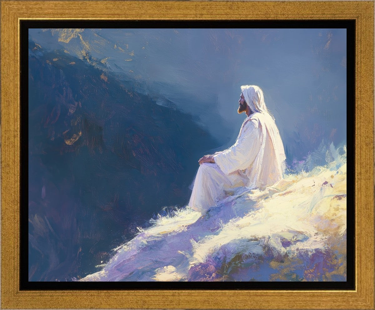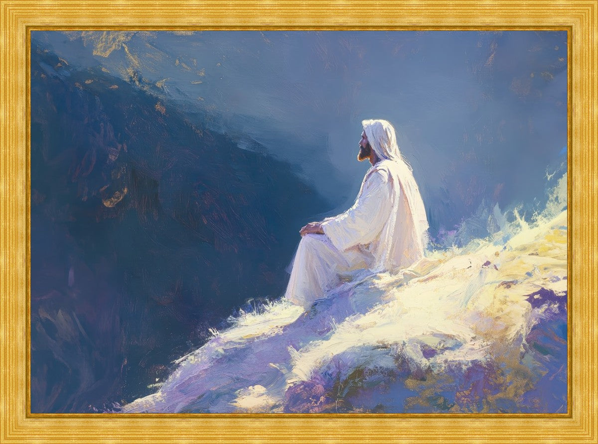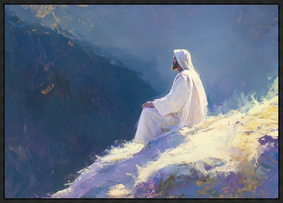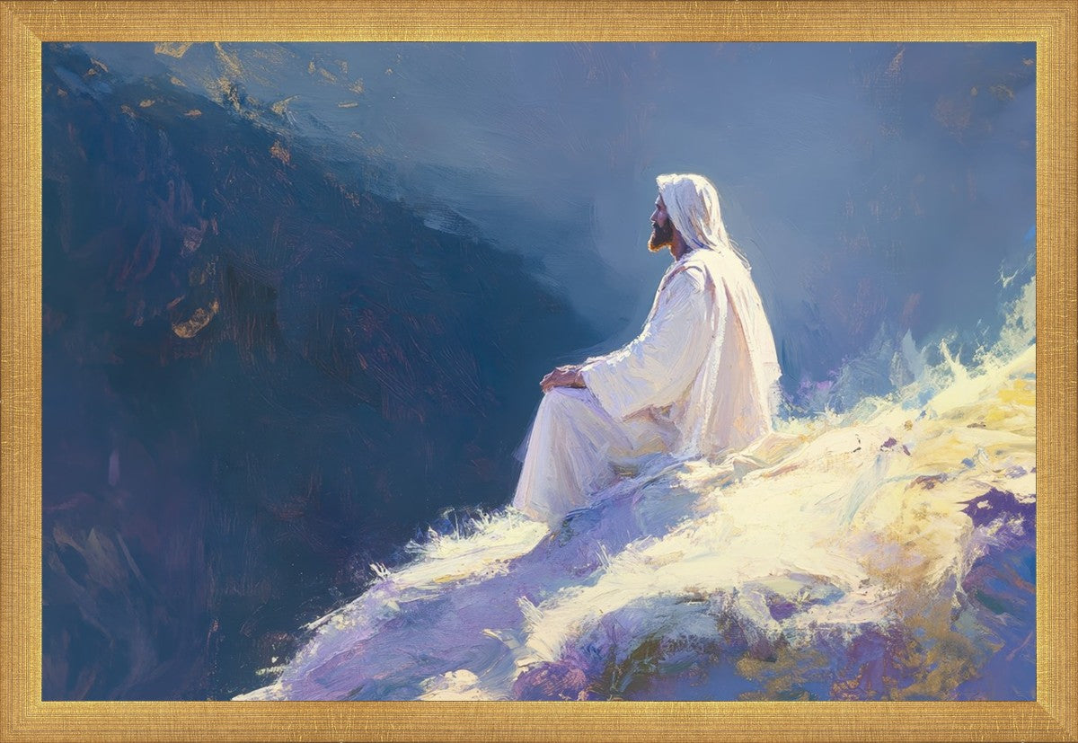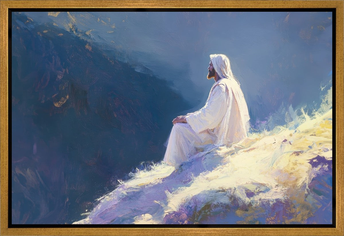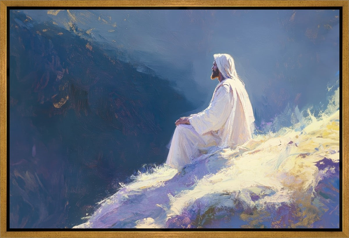 In "Contemplation," we sought to portray a moment of Jesus in quiet reflection, perched on a sunlit ridge. The vibrant colors and ethereal light reflect our desire to capture His peace and spiritual strength. Our simple message is one of hope and stillness, inviting viewers to find solace in His presence amidst life's vastness.