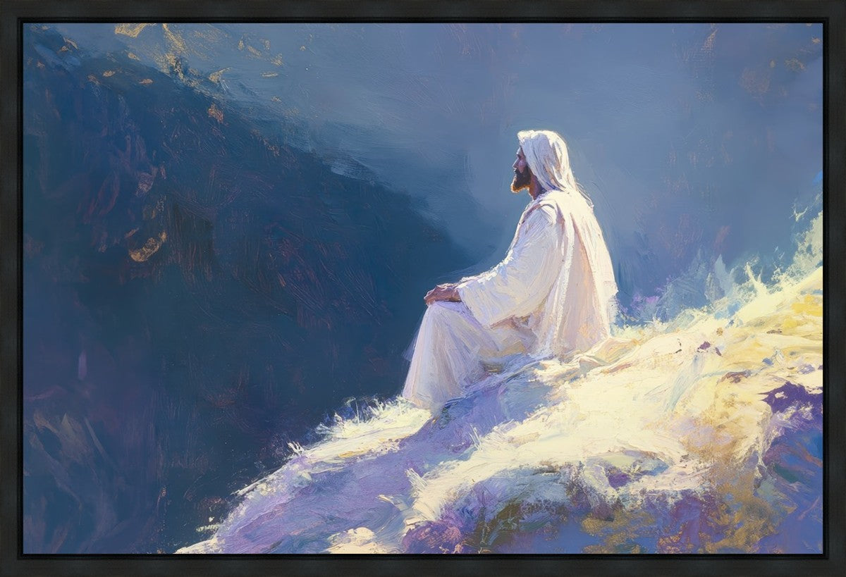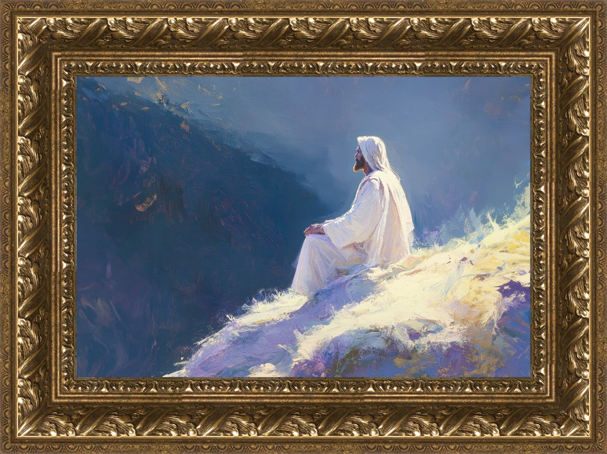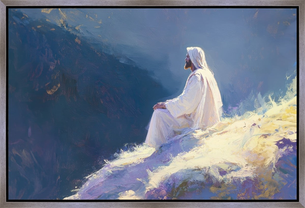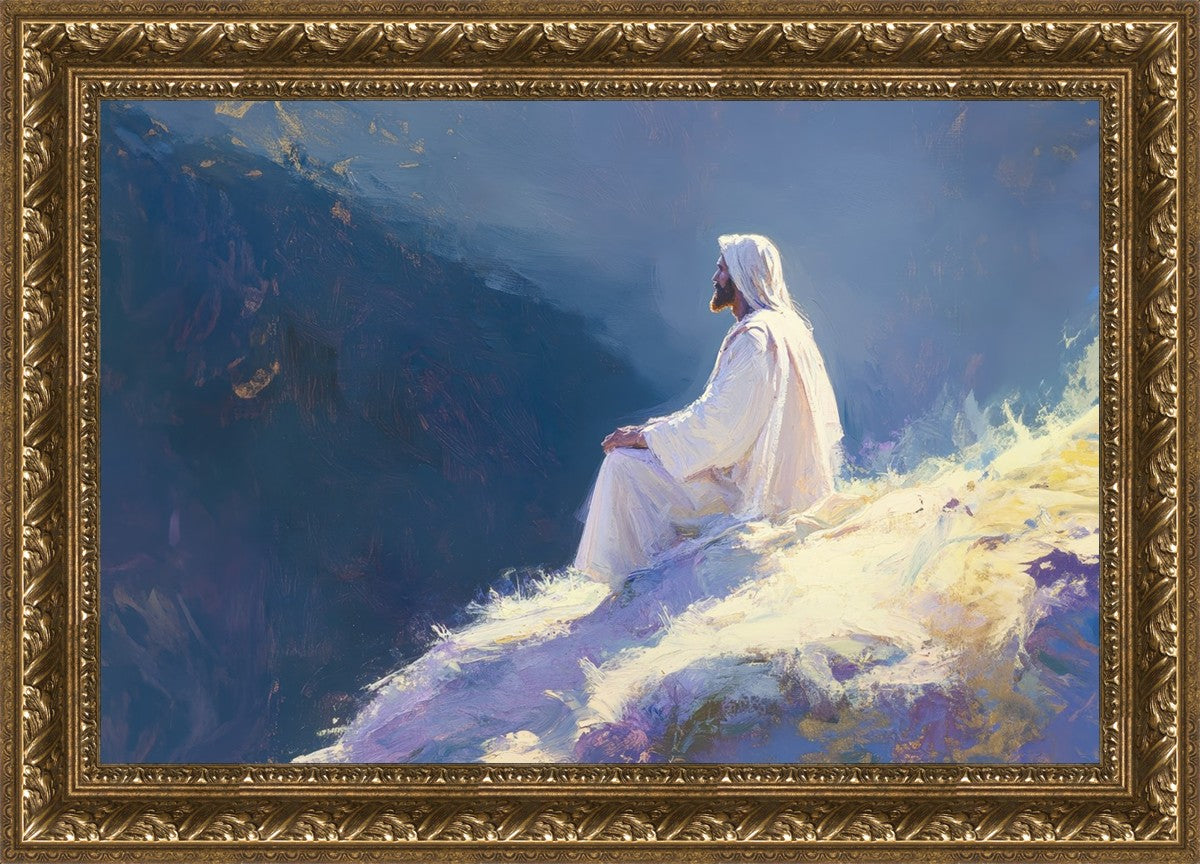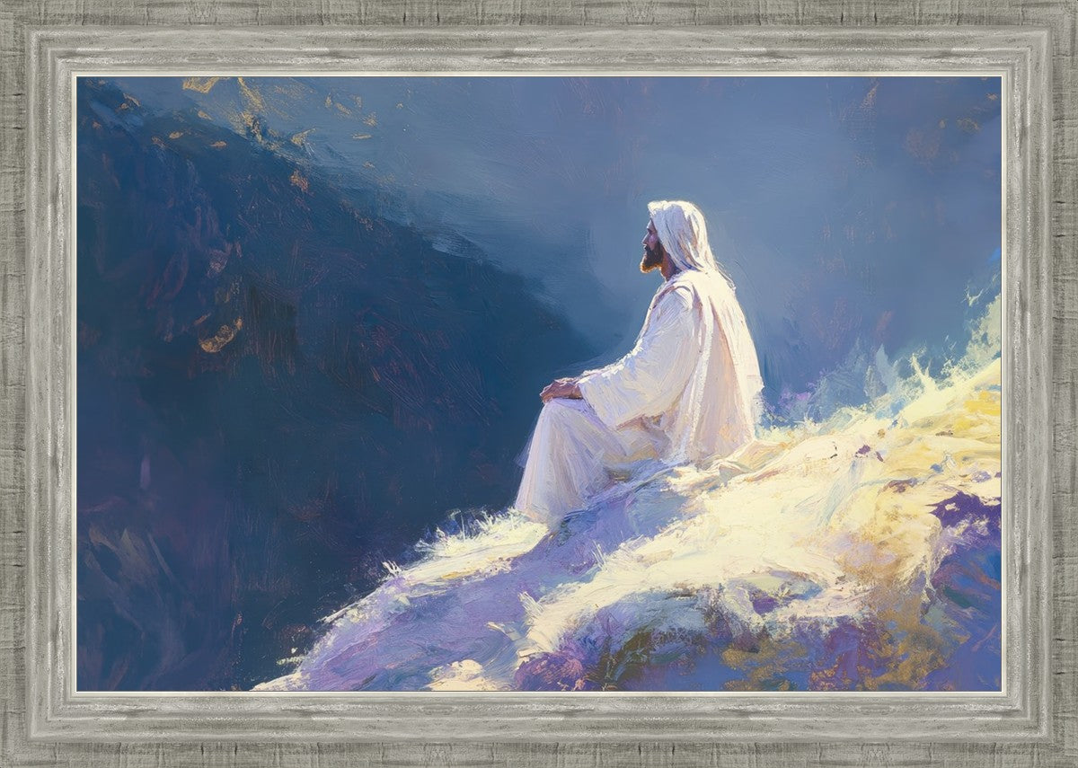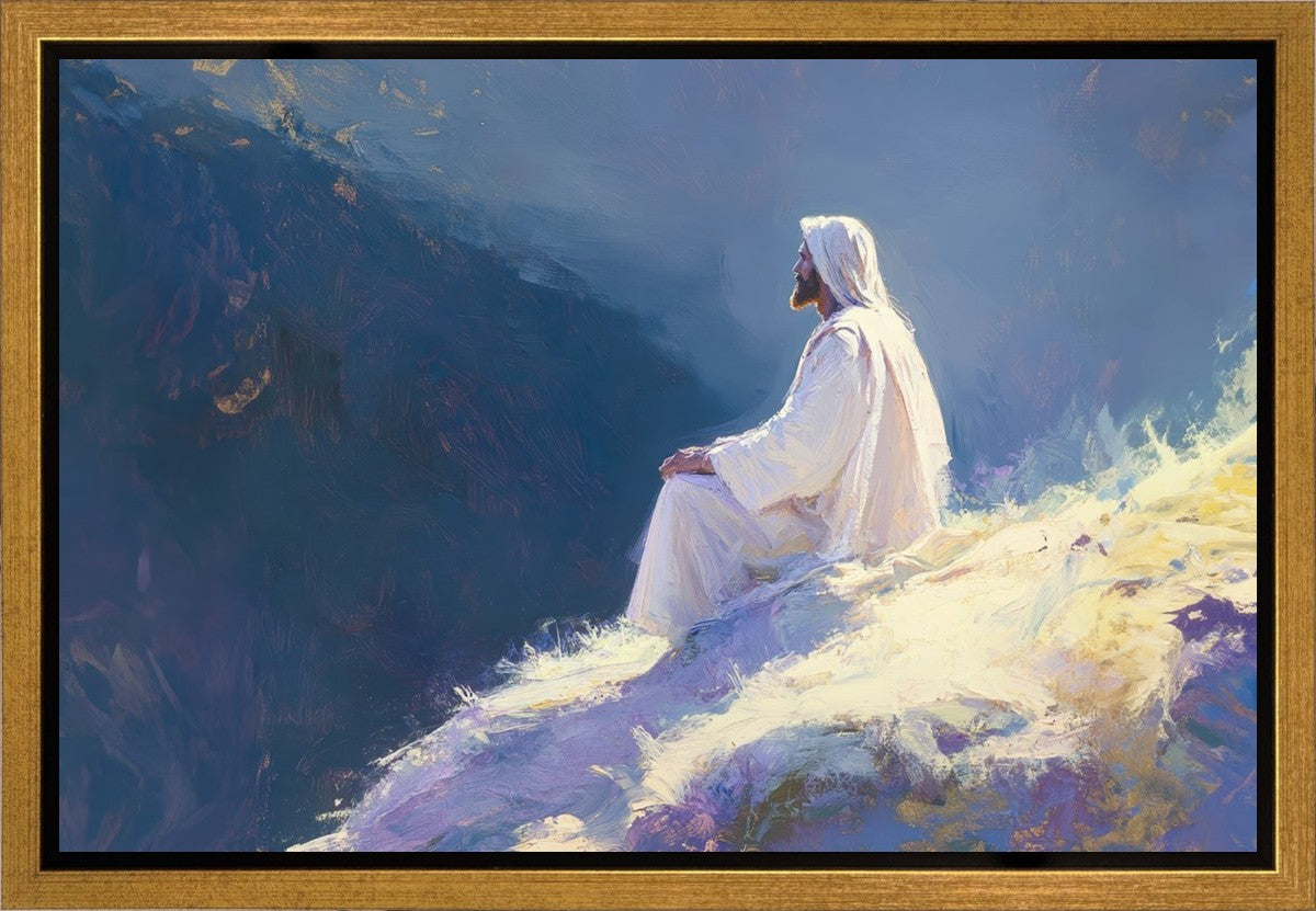 In "Contemplation," we sought to portray a moment of Jesus in quiet reflection, perched on a sunlit ridge. The vibrant colors and ethereal light reflect our desire to capture His peace and spiritual strength. Our simple message is one of hope and stillness, inviting viewers to find solace in His presence amidst life's vastness.