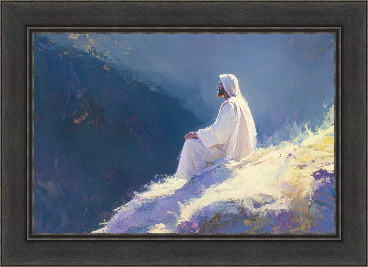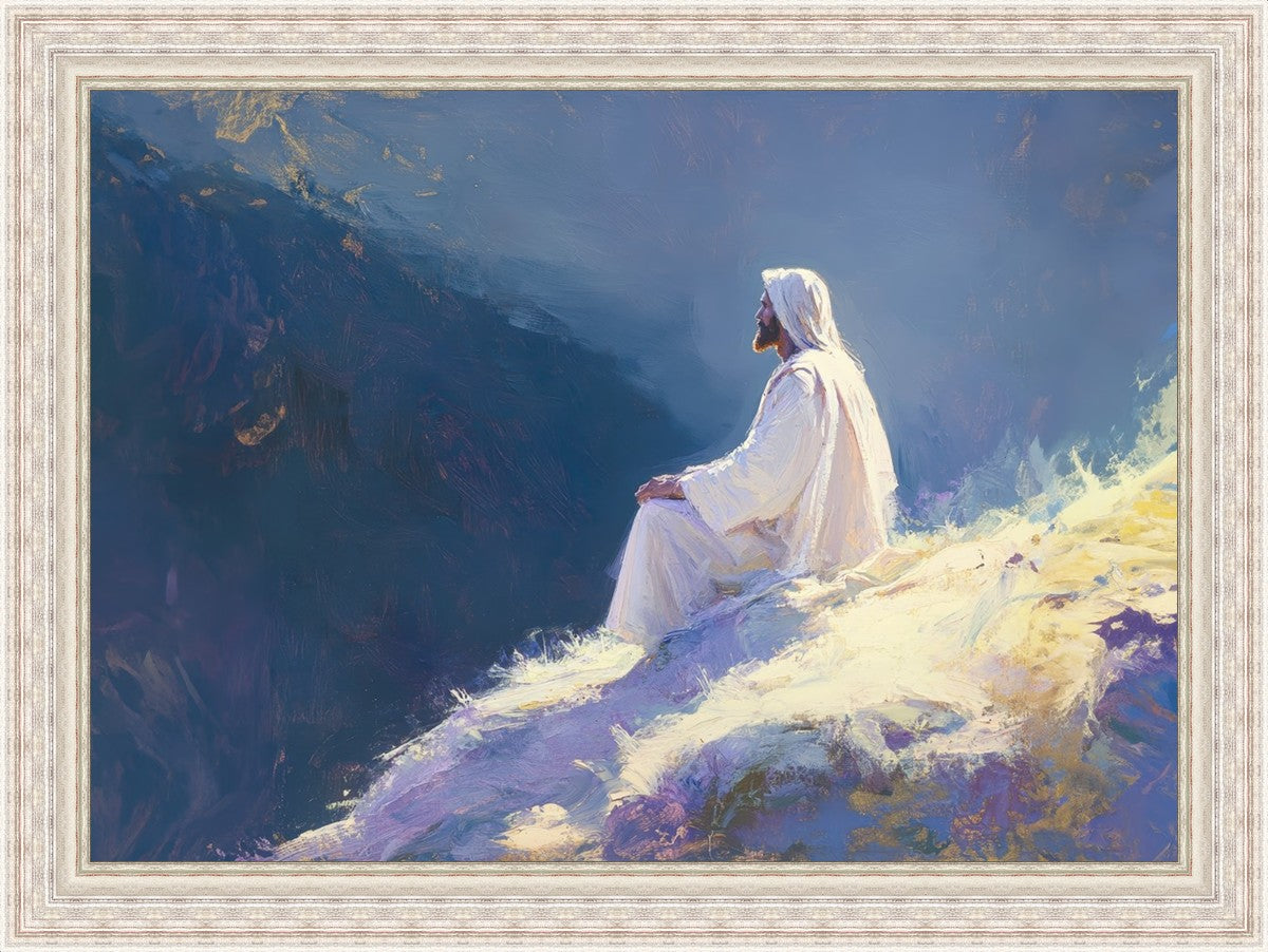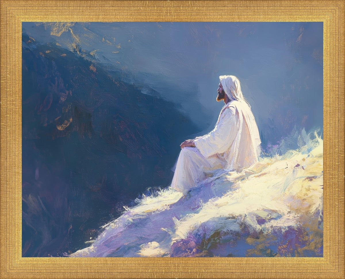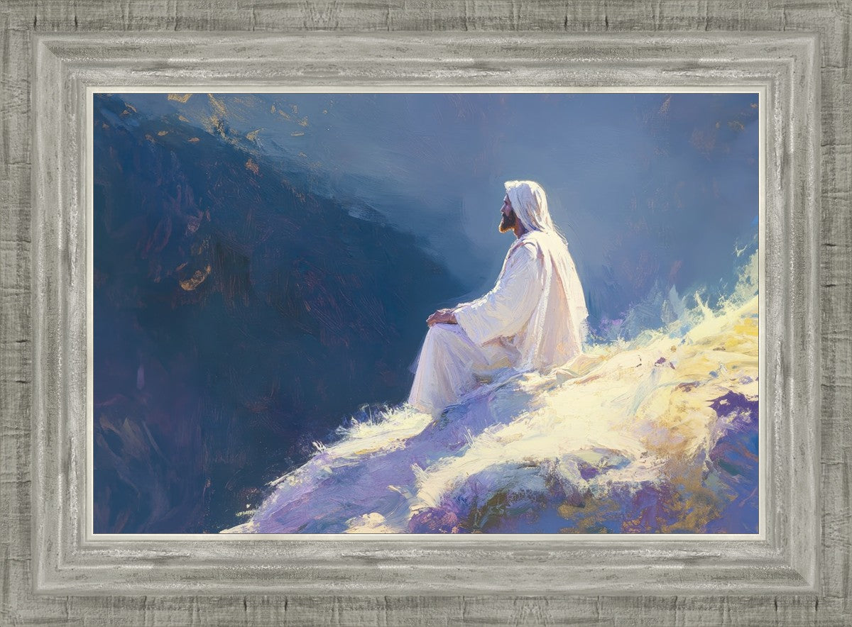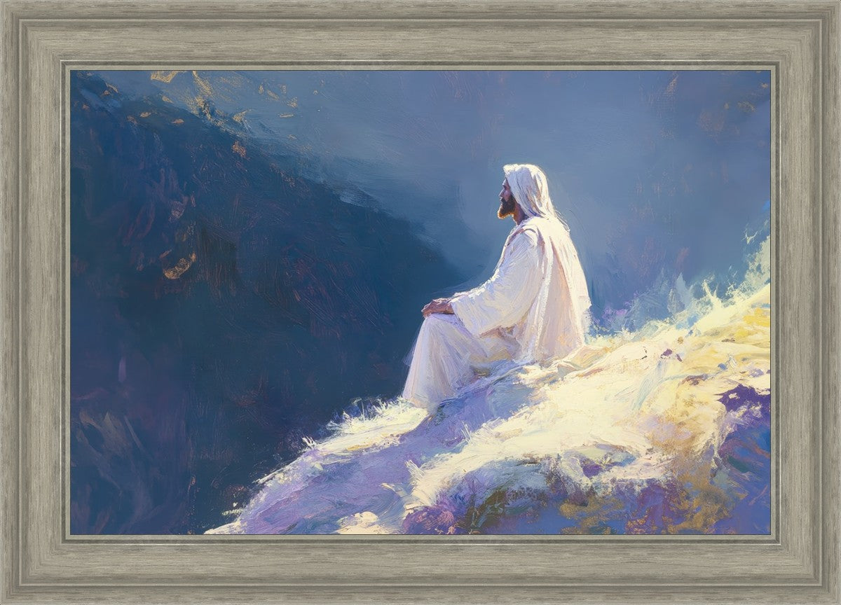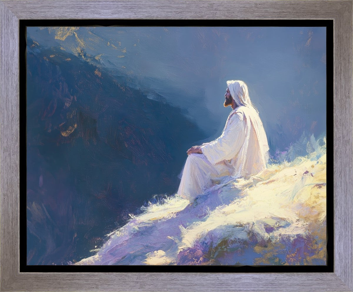 In "Contemplation," we sought to portray a moment of Jesus in quiet reflection, perched on a sunlit ridge. The vibrant colors and ethereal light reflect our desire to capture His peace and spiritual strength. Our simple message is one of hope and stillness, inviting viewers to find solace in His presence amidst life's vastness.