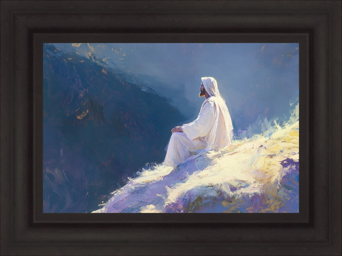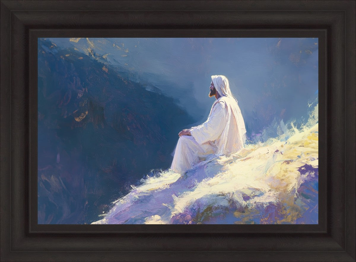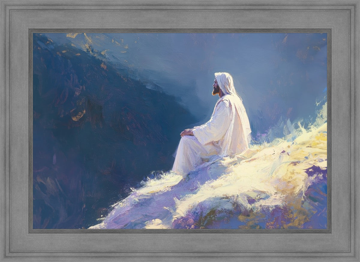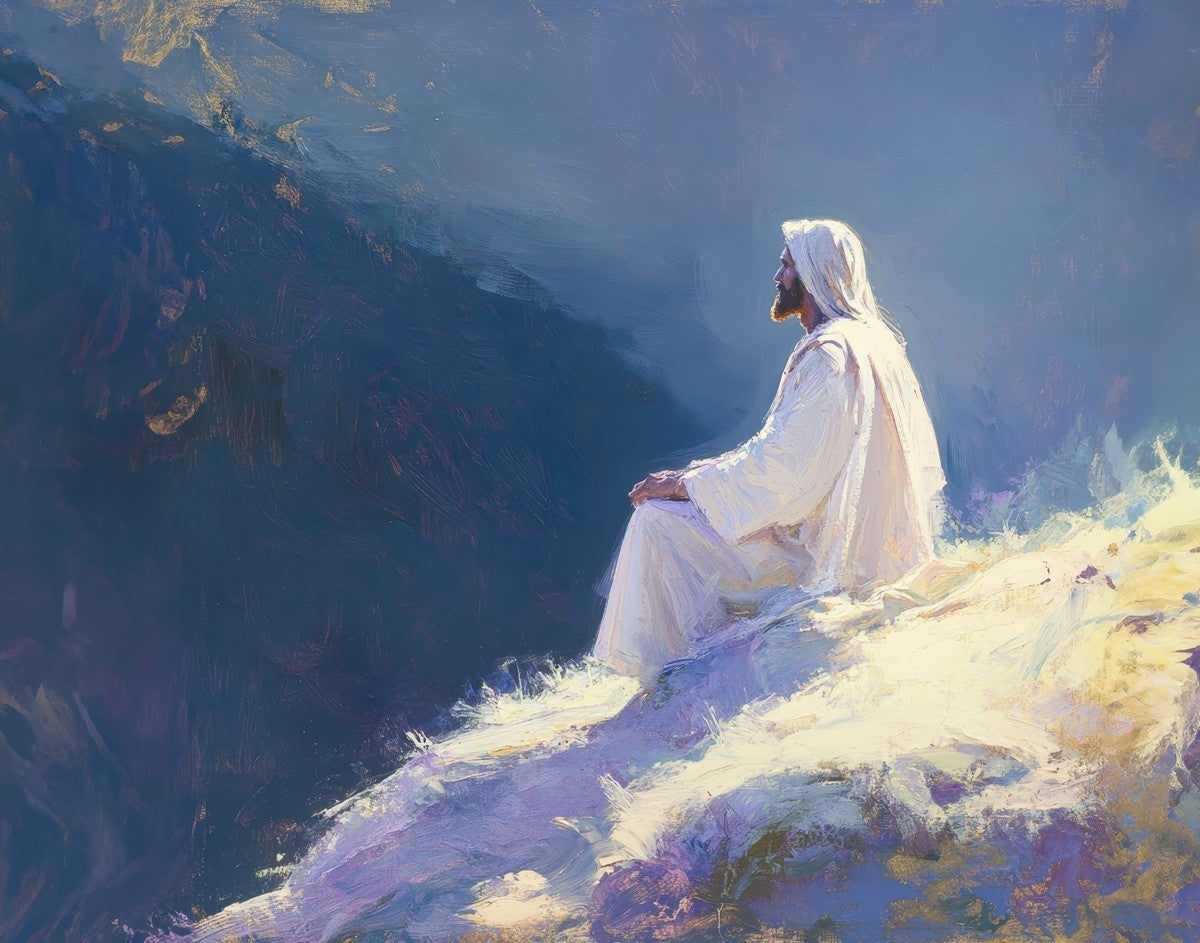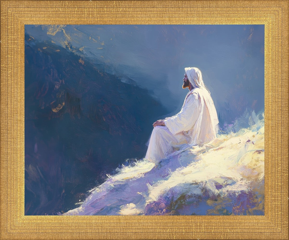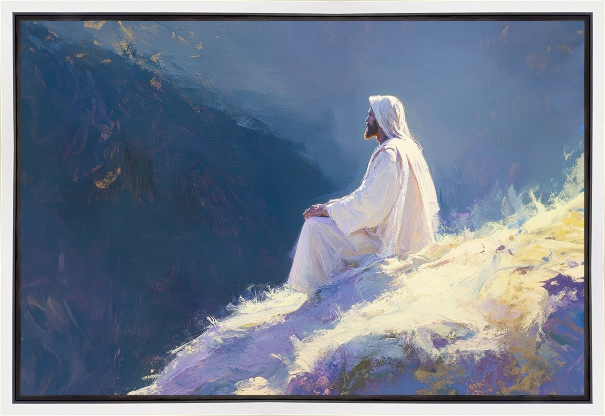 In "Contemplation," we sought to portray a moment of Jesus in quiet reflection, perched on a sunlit ridge. The vibrant colors and ethereal light reflect our desire to capture His peace and spiritual strength. Our simple message is one of hope and stillness, inviting viewers to find solace in His presence amidst life's vastness.