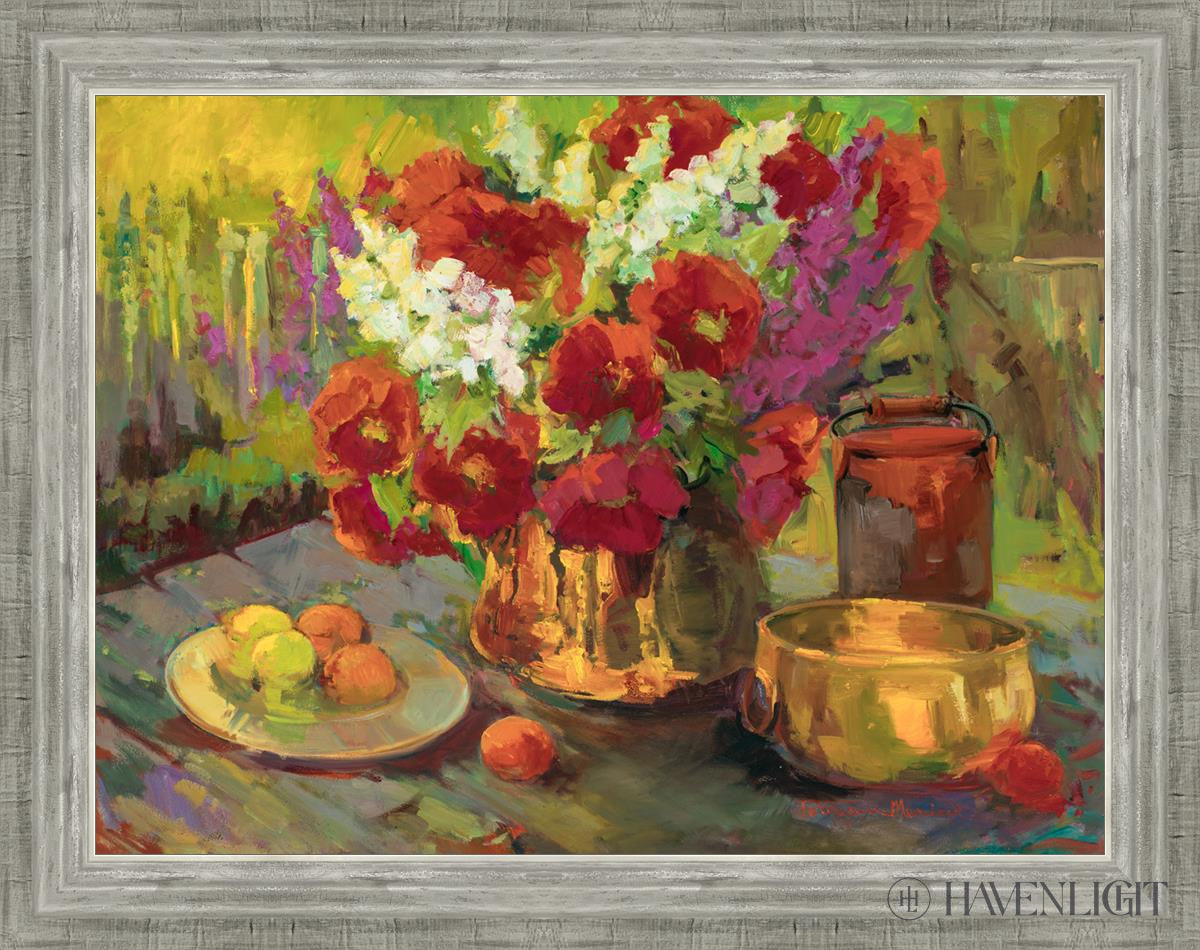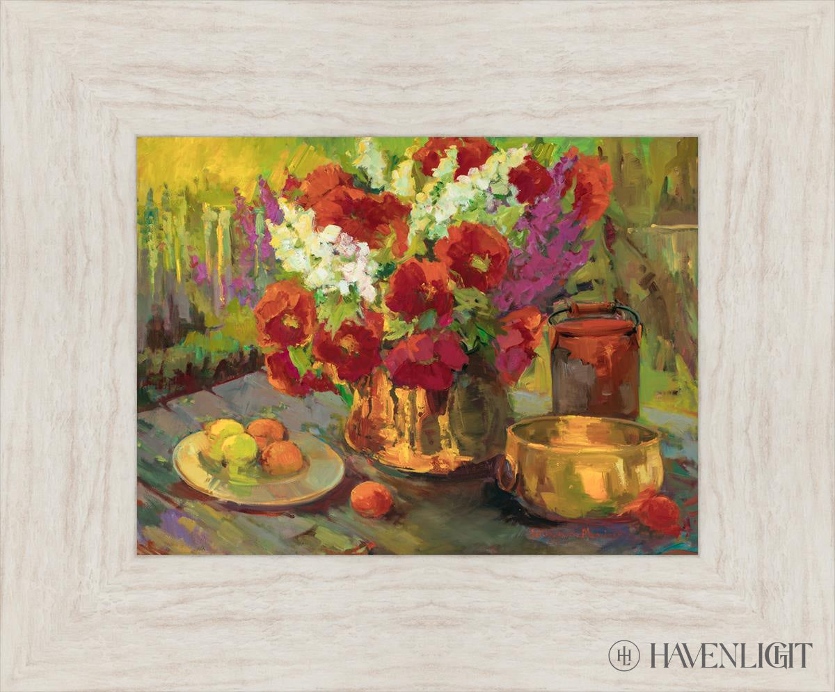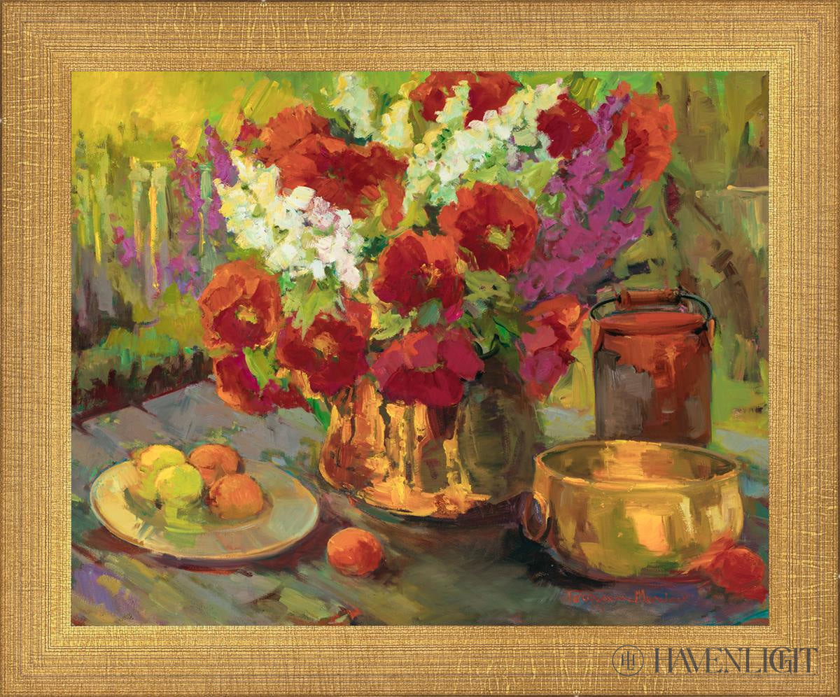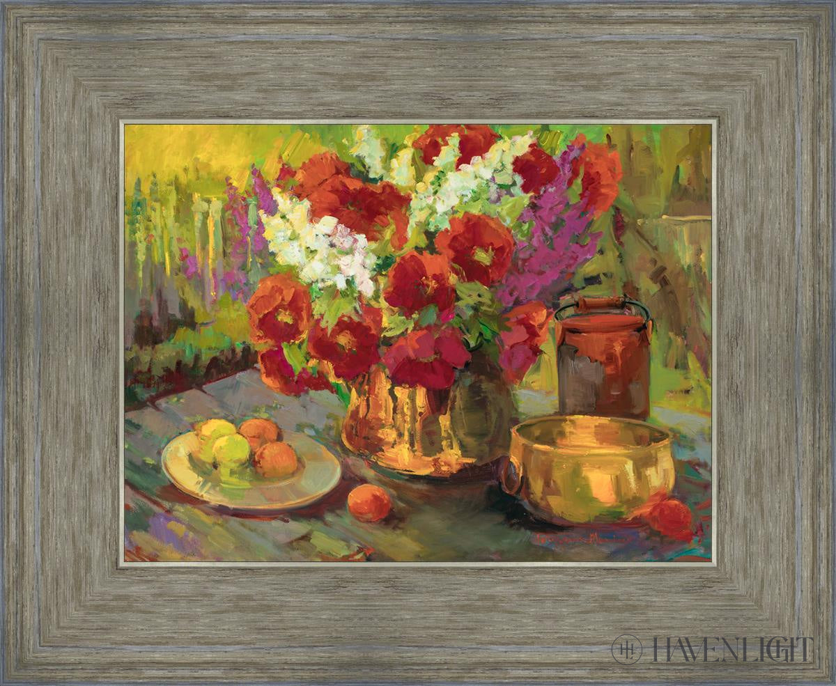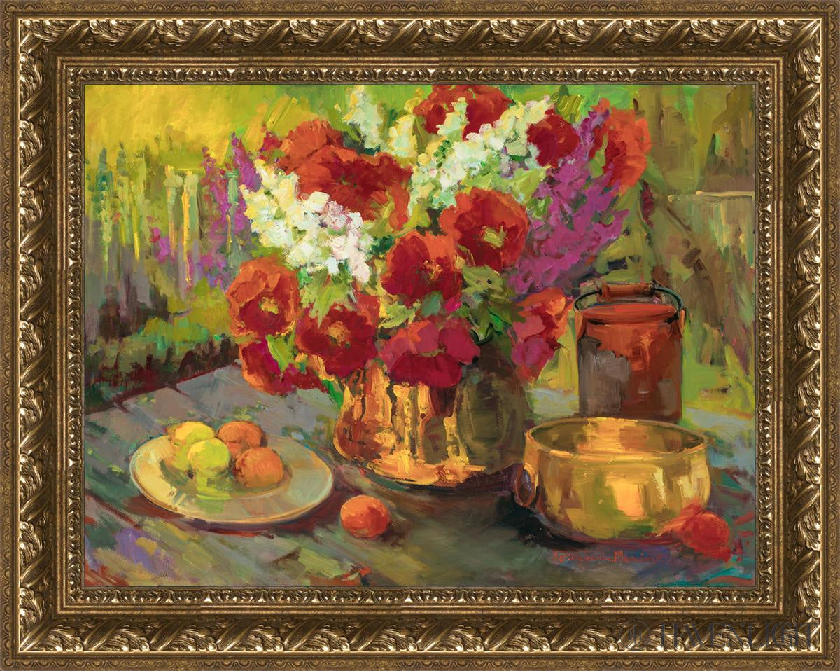 Sun, summer, green lawns, and red poppies. These are a few of my favorite things especially when set off by shining brass and copper. This painting was done on a hot afternoon sunshine day in June. It seemed to me as I sat outside under my umbrella that nothing could be