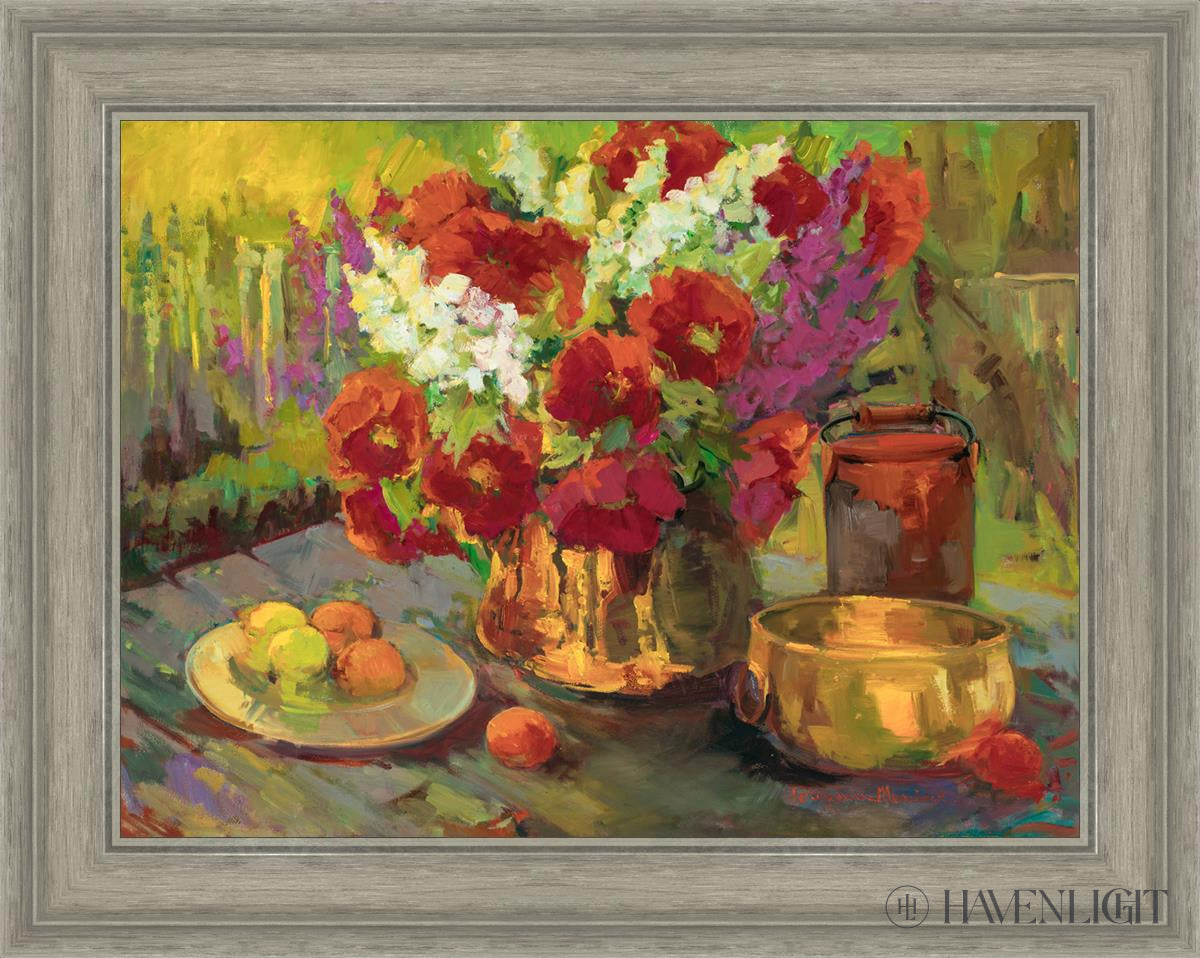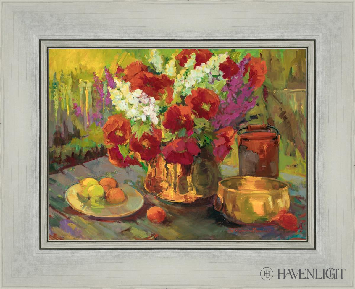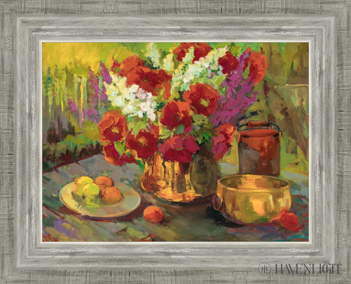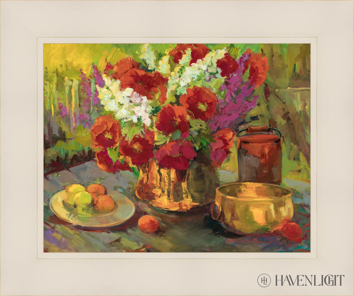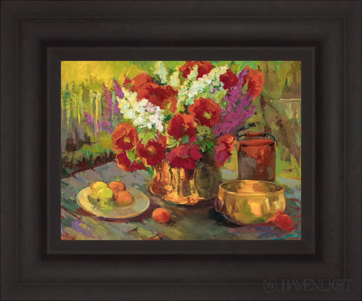 Sun, summer, green lawns, and red poppies. These are a few of my favorite things especially when set off by shining brass and copper. This painting was done on a hot afternoon sunshine day in June. It seemed to me as I sat outside under my umbrella that nothing could be