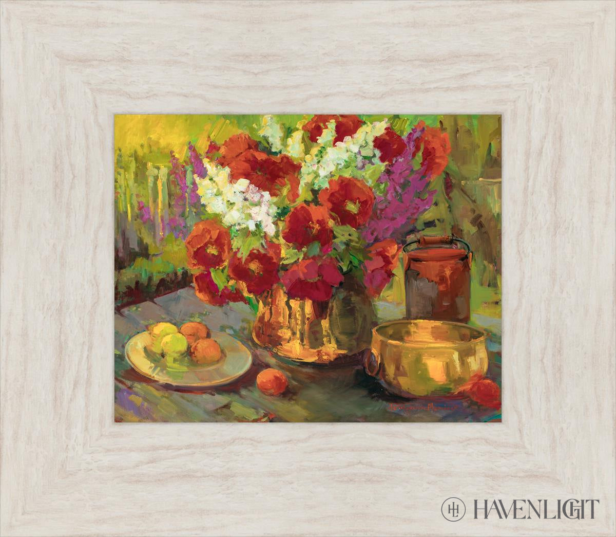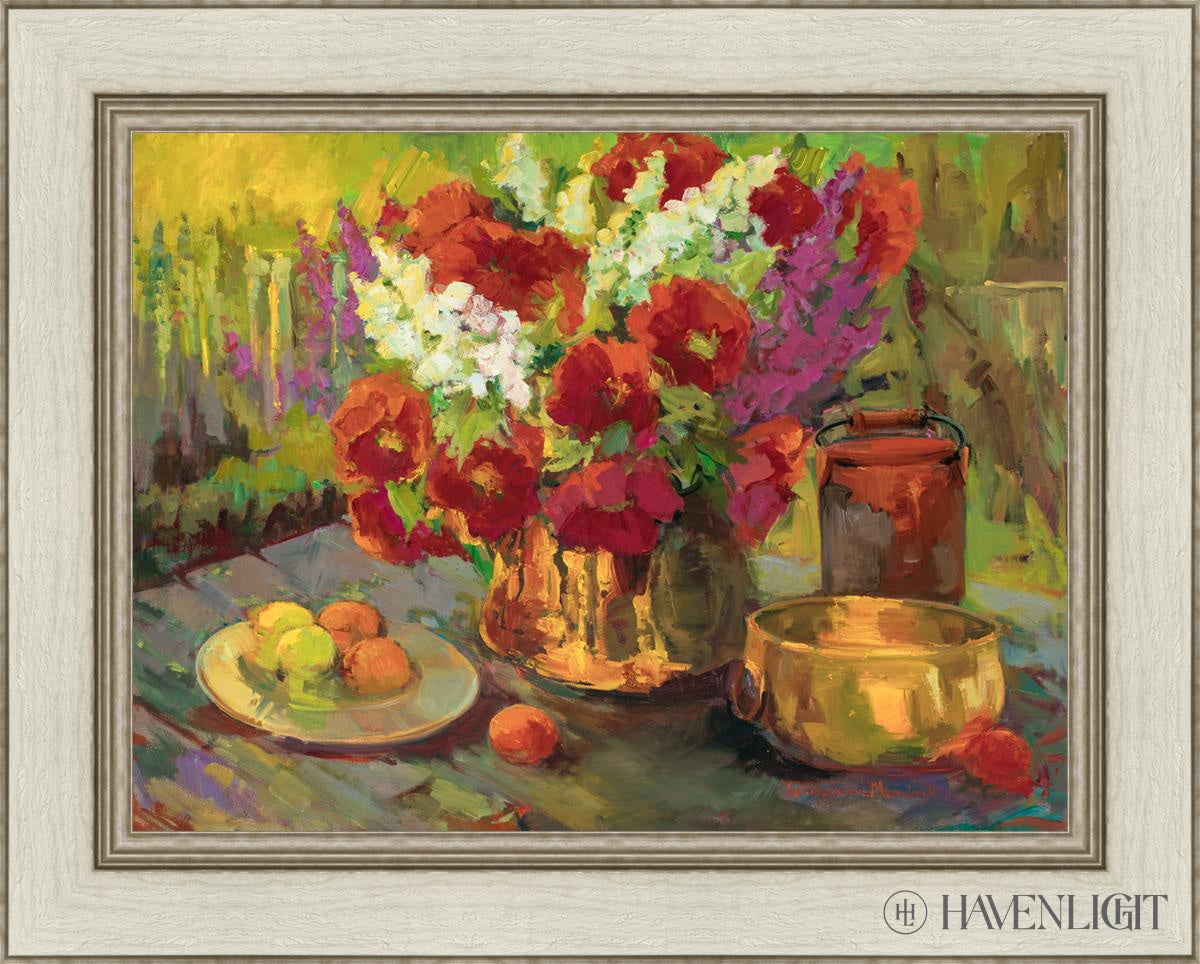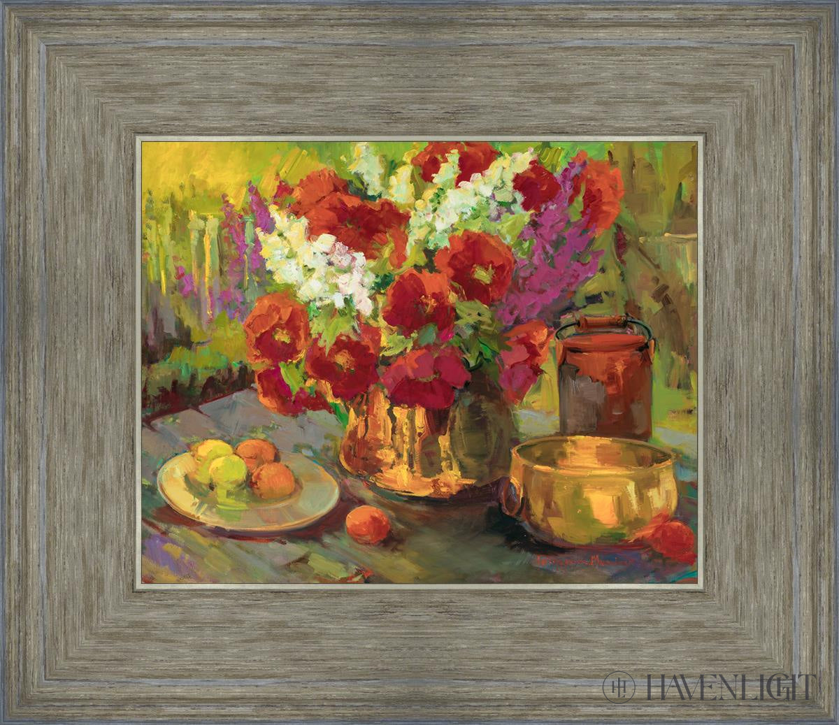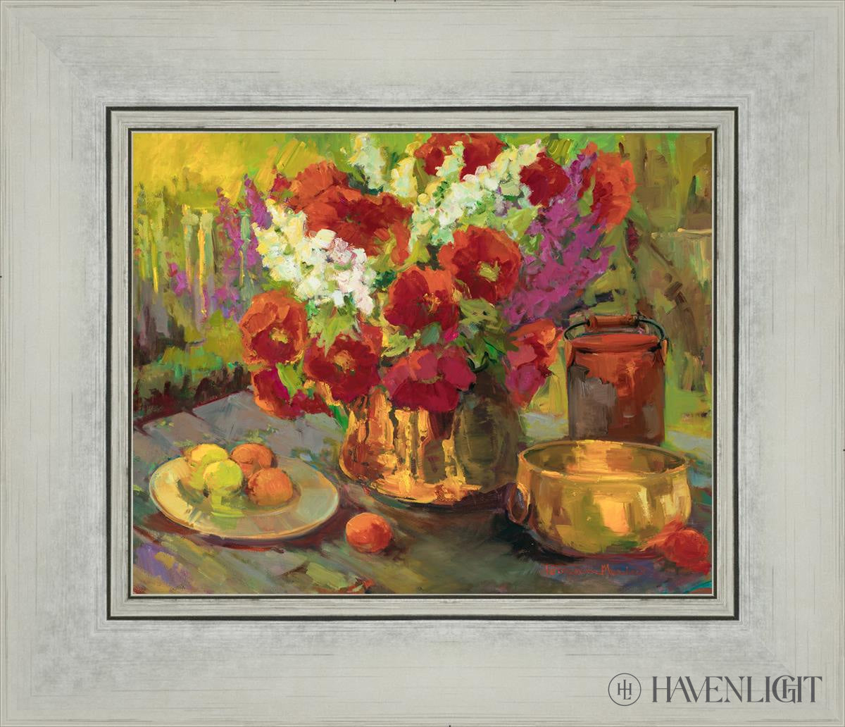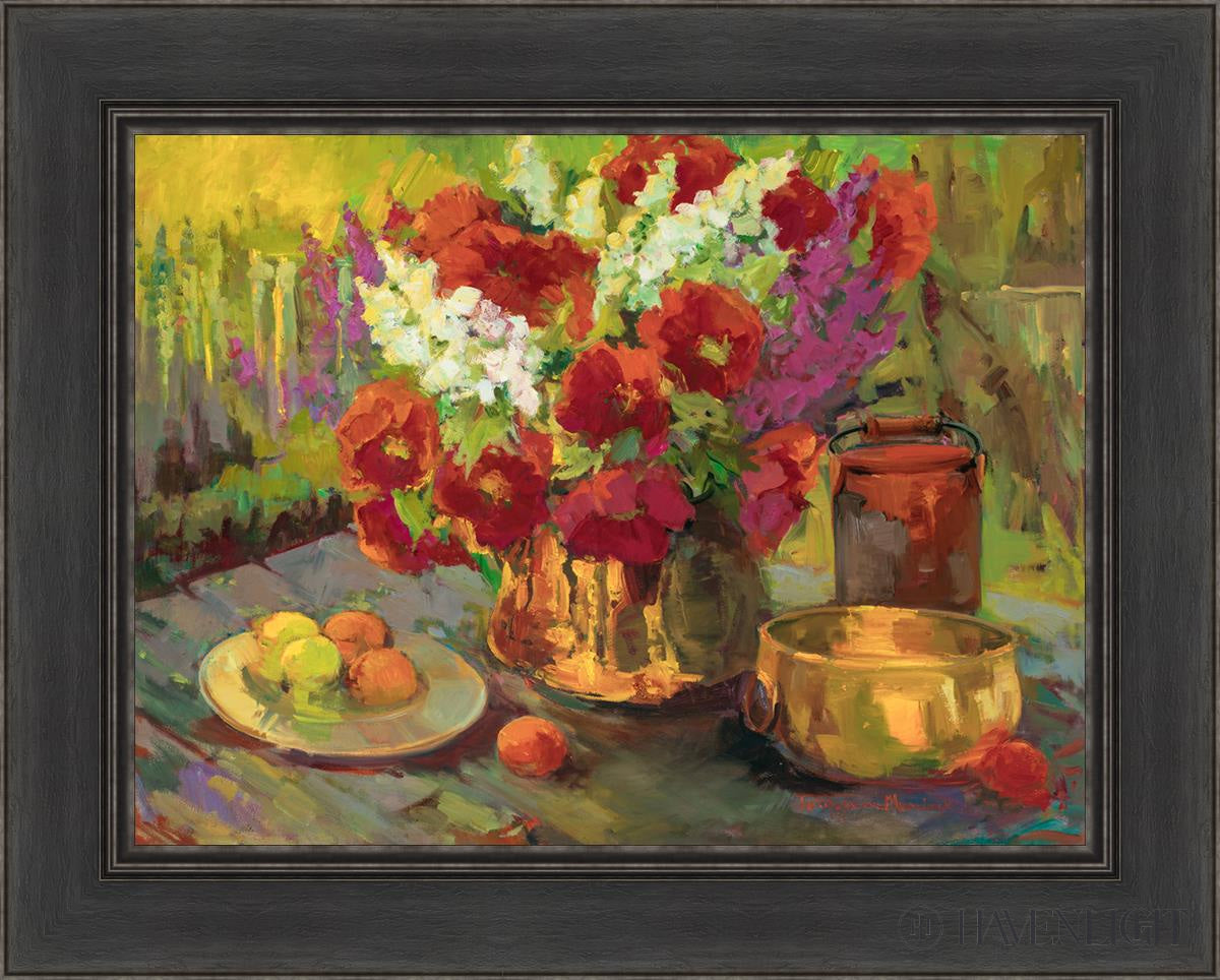 Sun, summer, green lawns, and red poppies. These are a few of my favorite things especially when set off by shining brass and copper. This painting was done on a hot afternoon sunshine day in June. It seemed to me as I sat outside under my umbrella that nothing could be