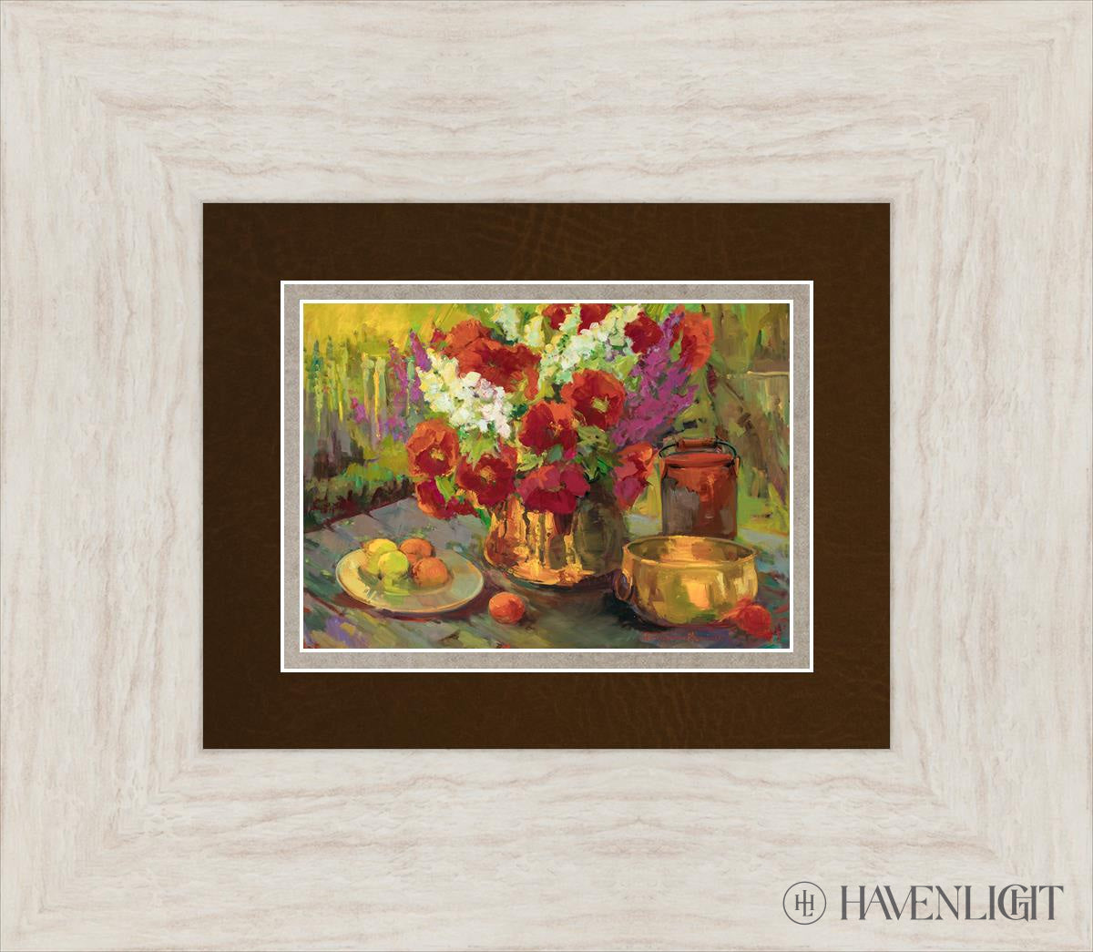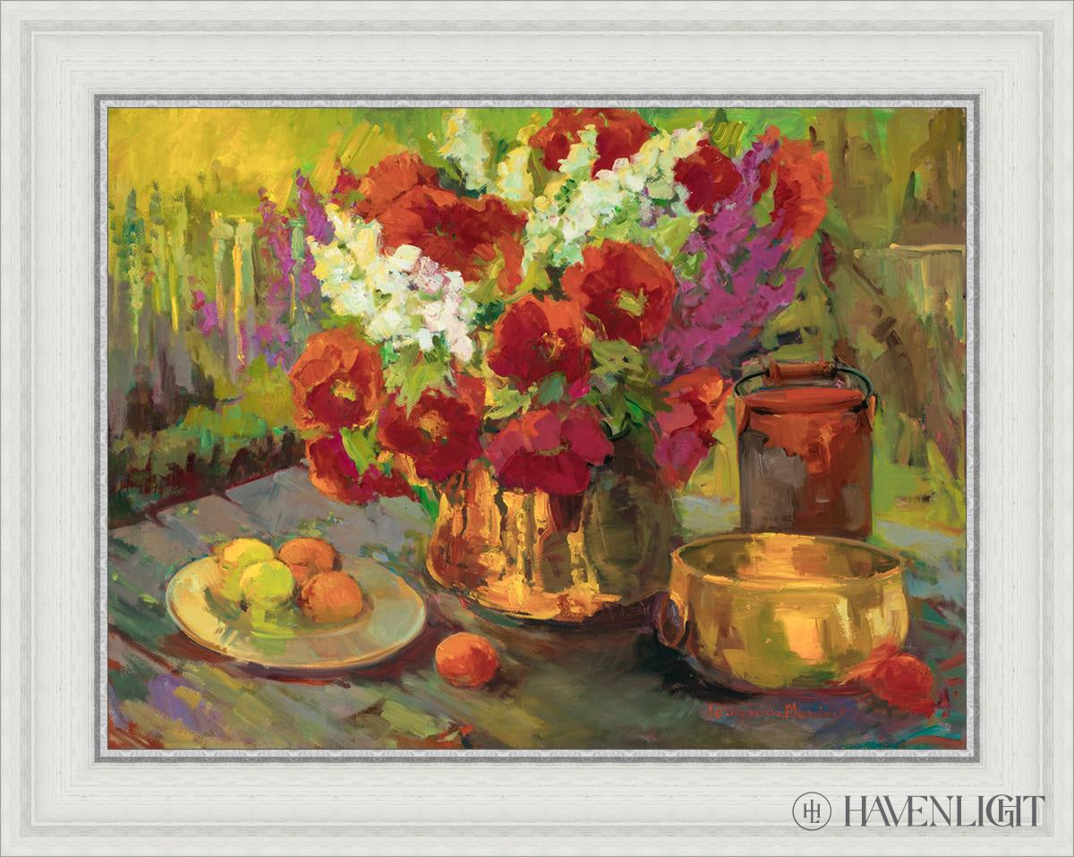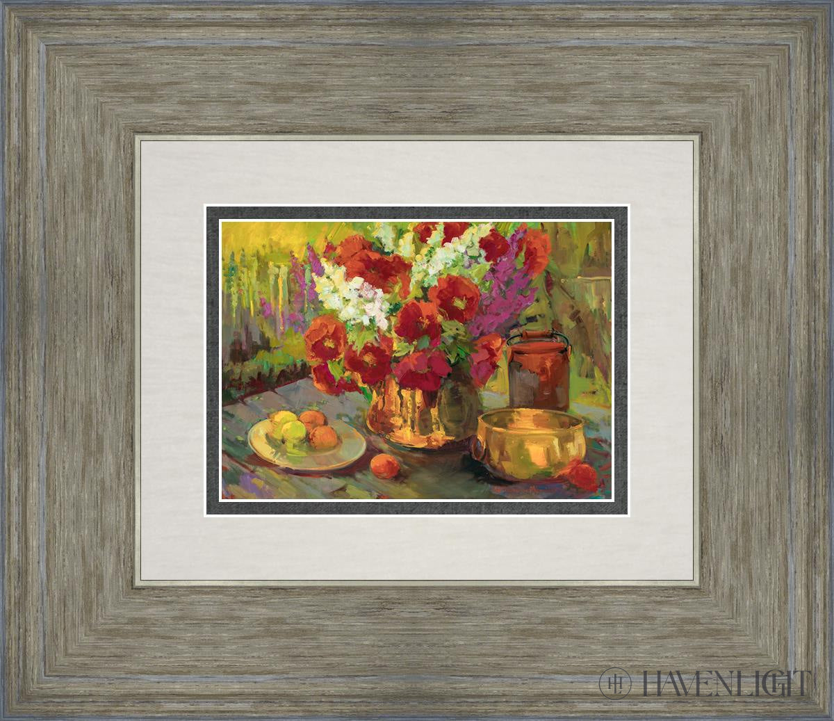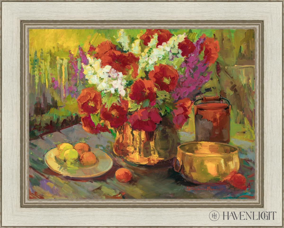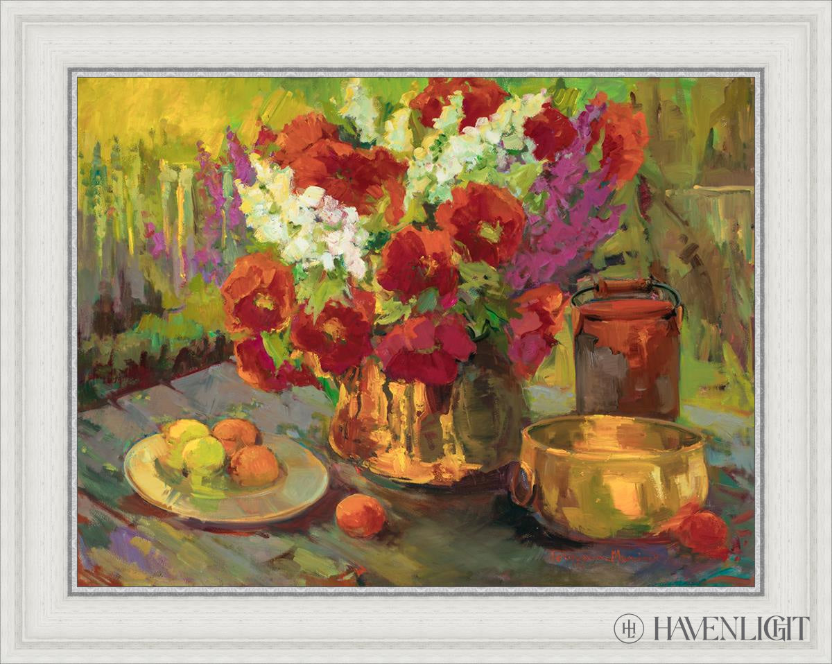 Sun, summer, green lawns, and red poppies. These are a few of my favorite things especially when set off by shining brass and copper. This painting was done on a hot afternoon sunshine day in June. It seemed to me as I sat outside under my umbrella that nothing could be