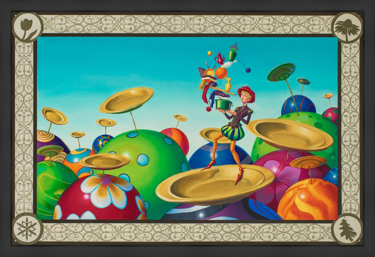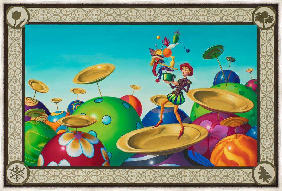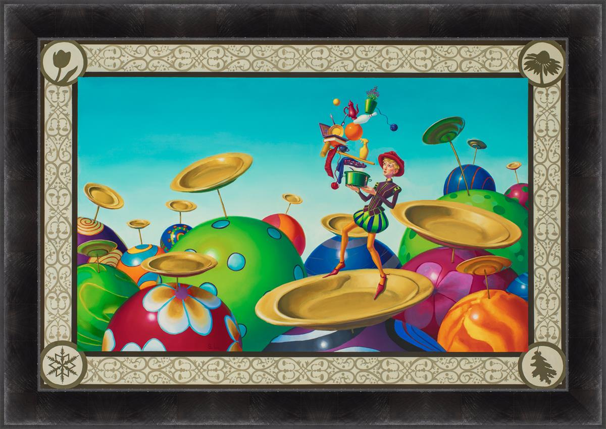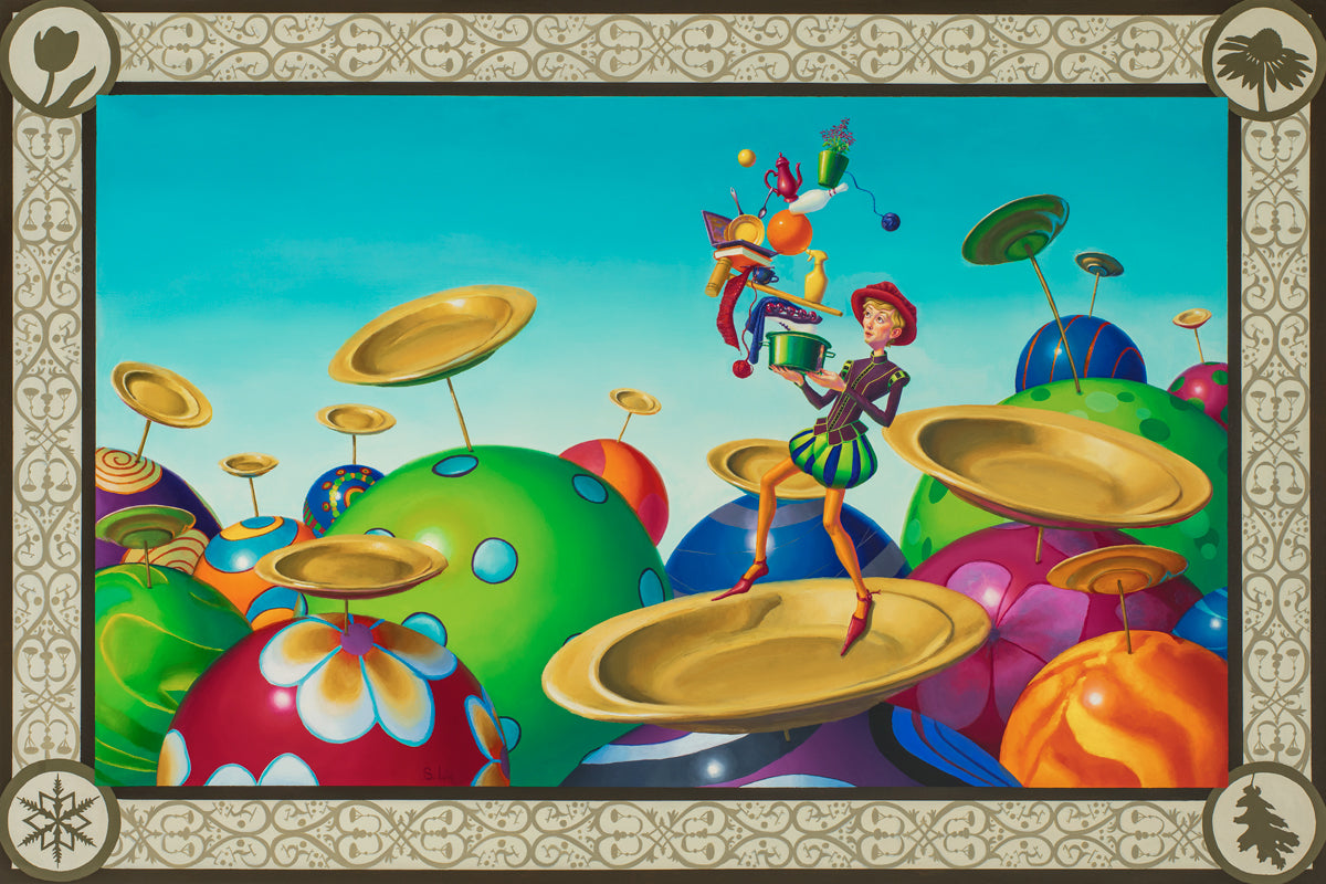 Ironically, while in the development stage of this painting, I had to rebalance my elements several times. At first my figure was too small. Then his stack of items was too tall. Next the plates have to be readjusted. Then I noticed that the orientation of the tulip in the border felt wrong. Finally, balancing the colors and values for the finished painting proved difficult. Finding balance is often a matter of trial and error. We may not always get it right, but as long as we keep trying, we’ll be okay.