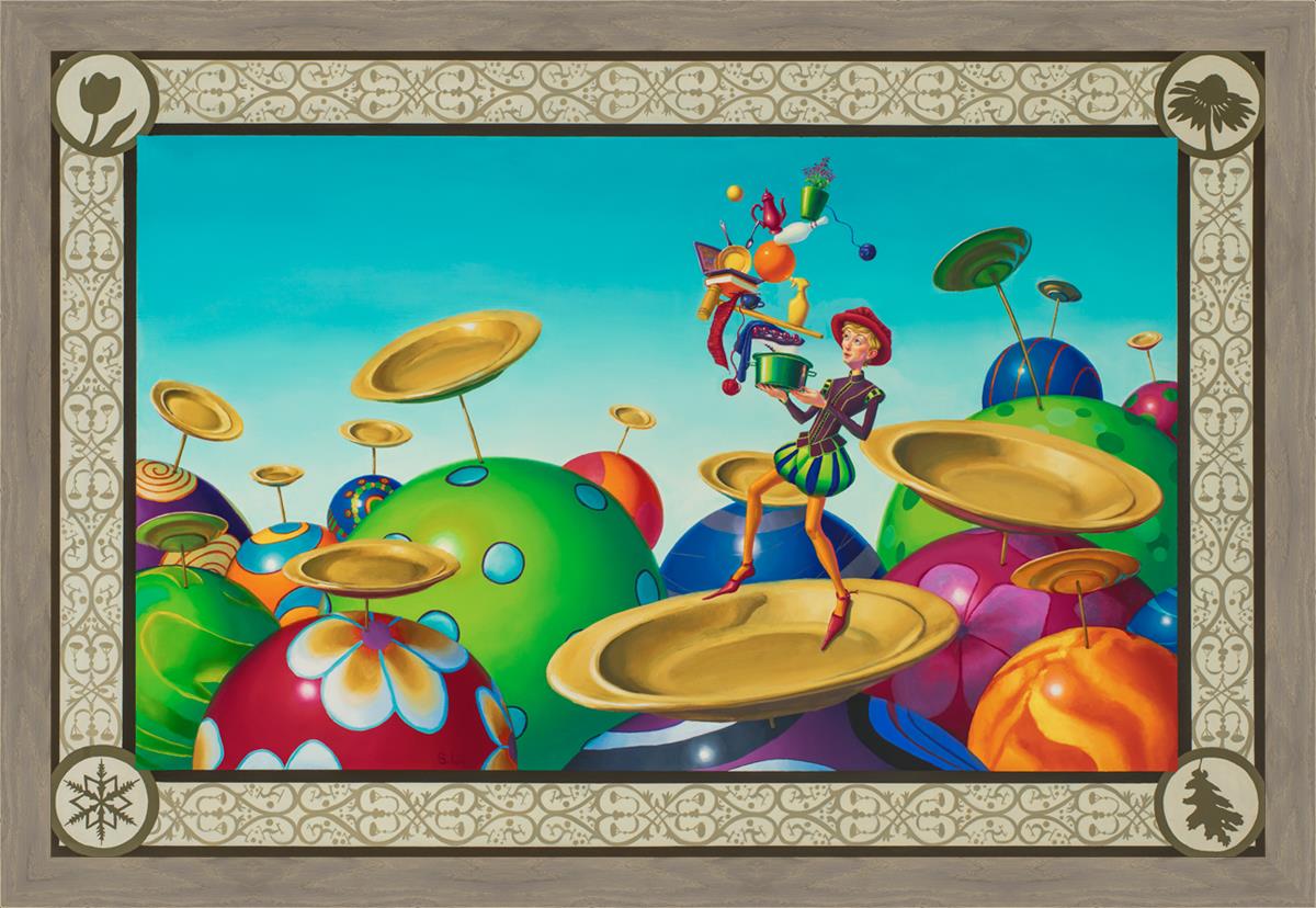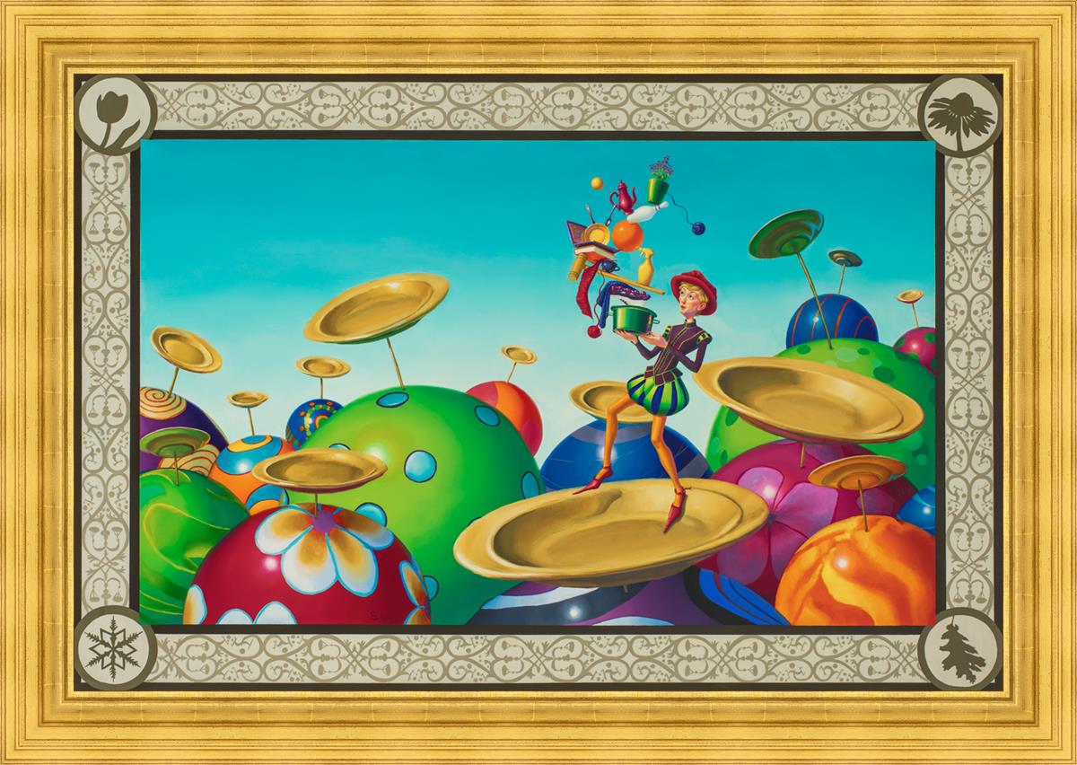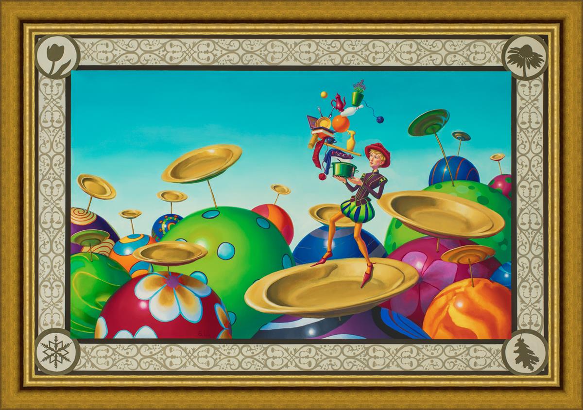 Ironically, while in the development stage of this painting, I had to rebalance my elements several times. At first my figure was too small. Then his stack of items was too tall. Next the plates have to be readjusted. Then I noticed that the orientation of the tulip in the border felt wrong. Finally, balancing the colors and values for the finished painting proved difficult. Finding balance is often a matter of trial and error. We may not always get it right, but as long as we keep trying, we’ll be okay.