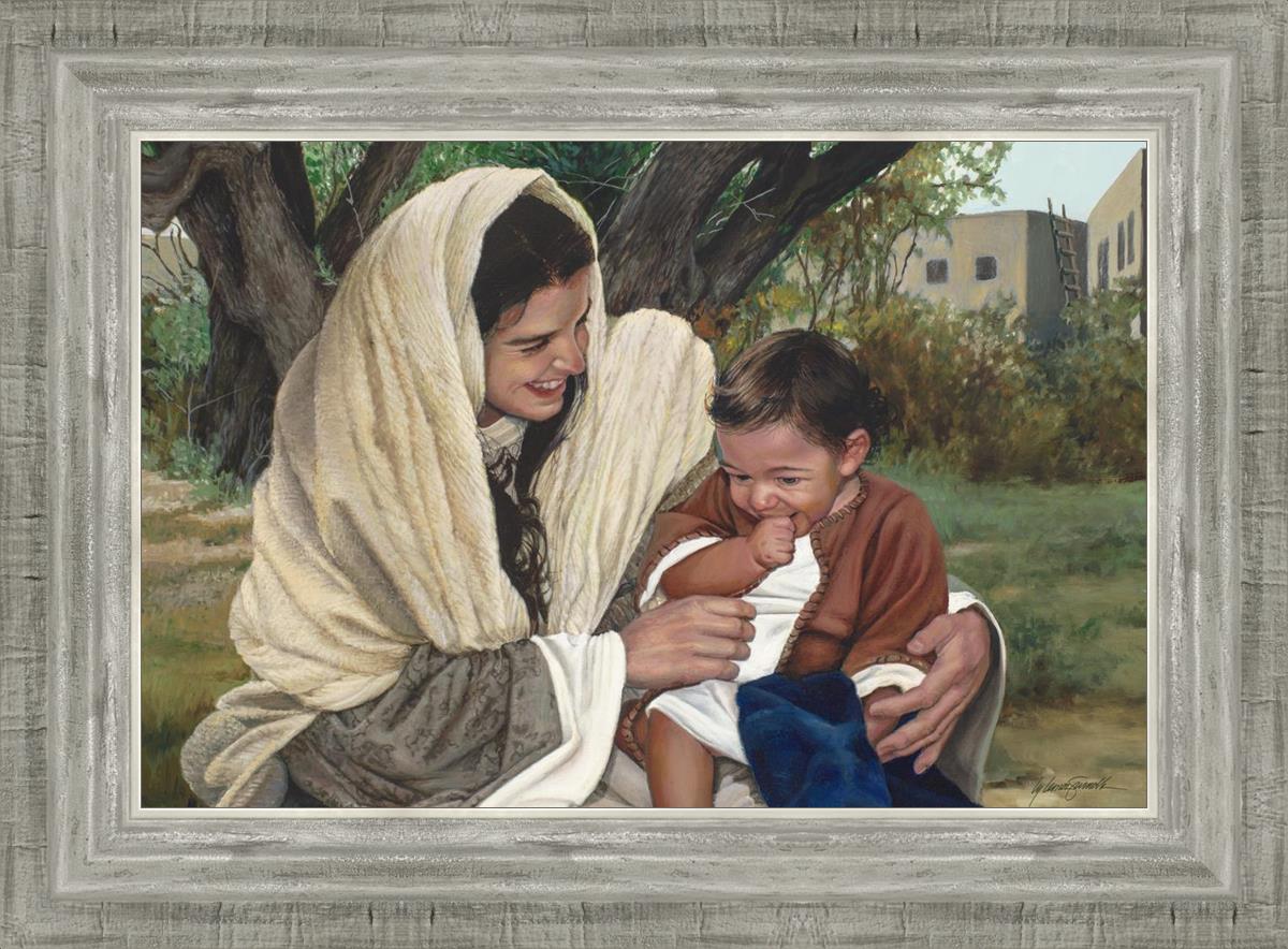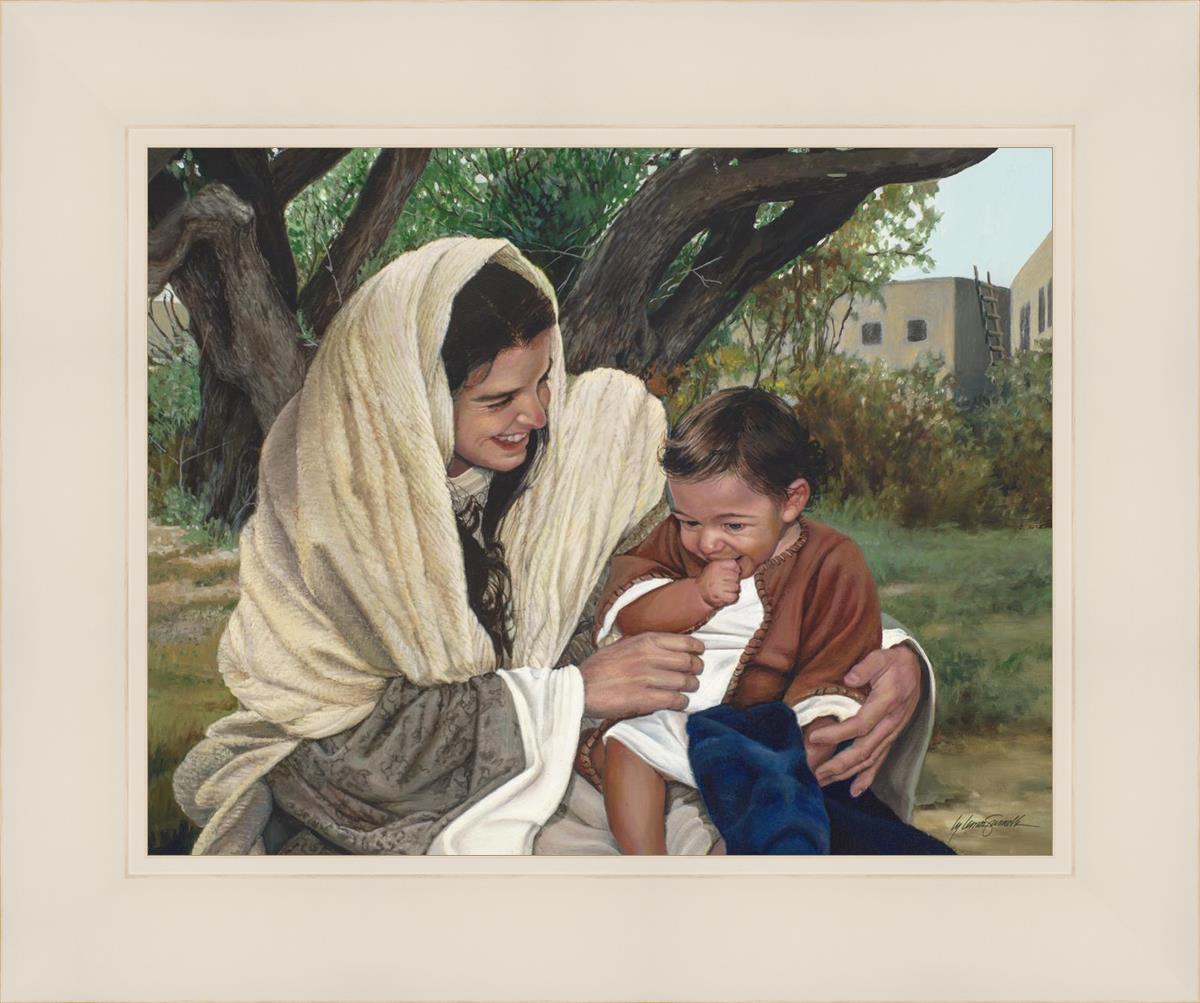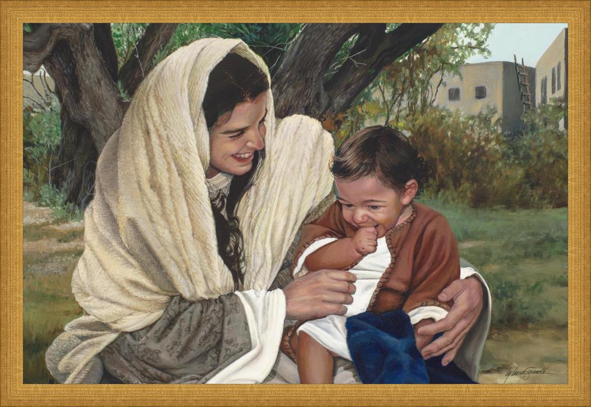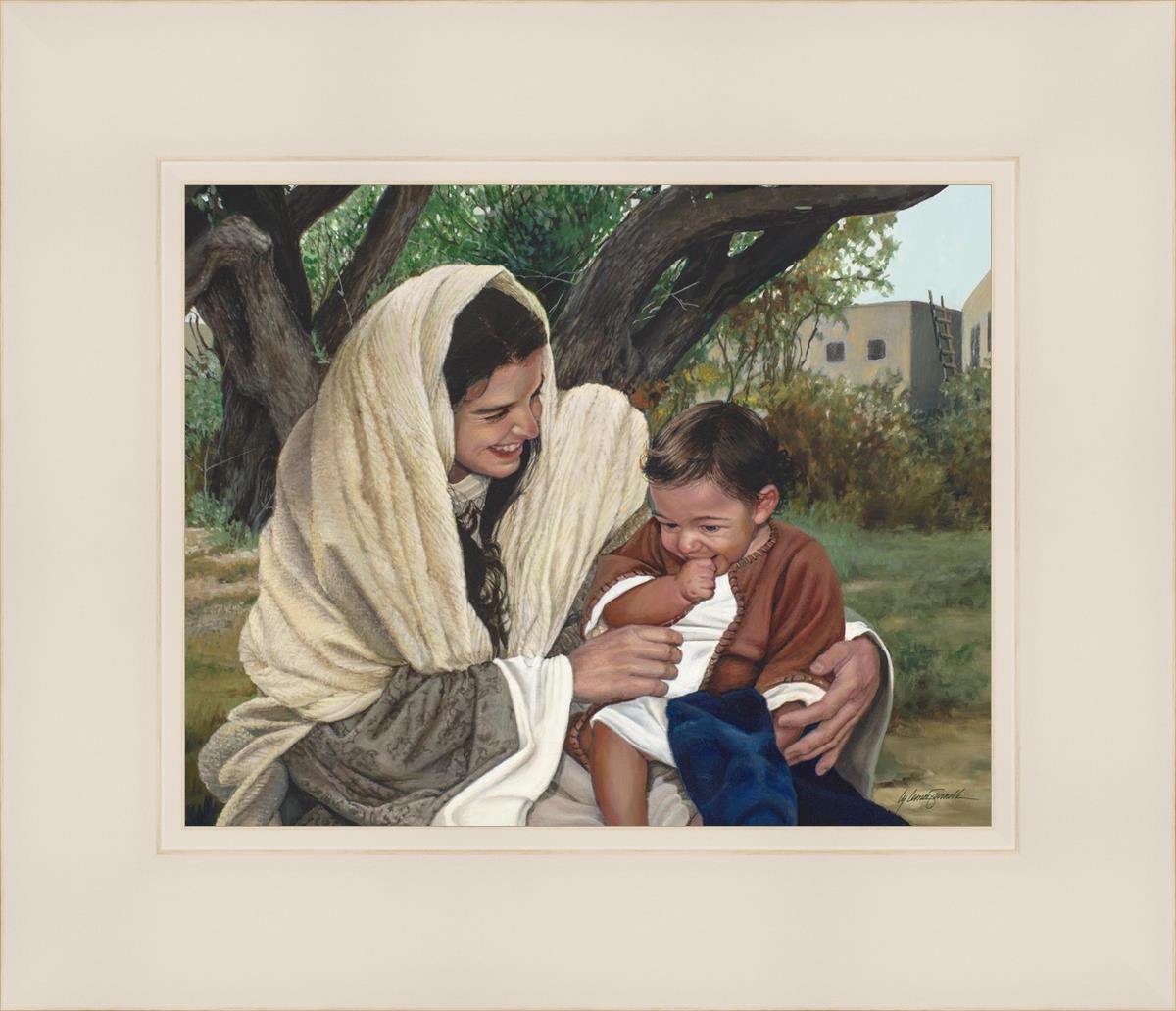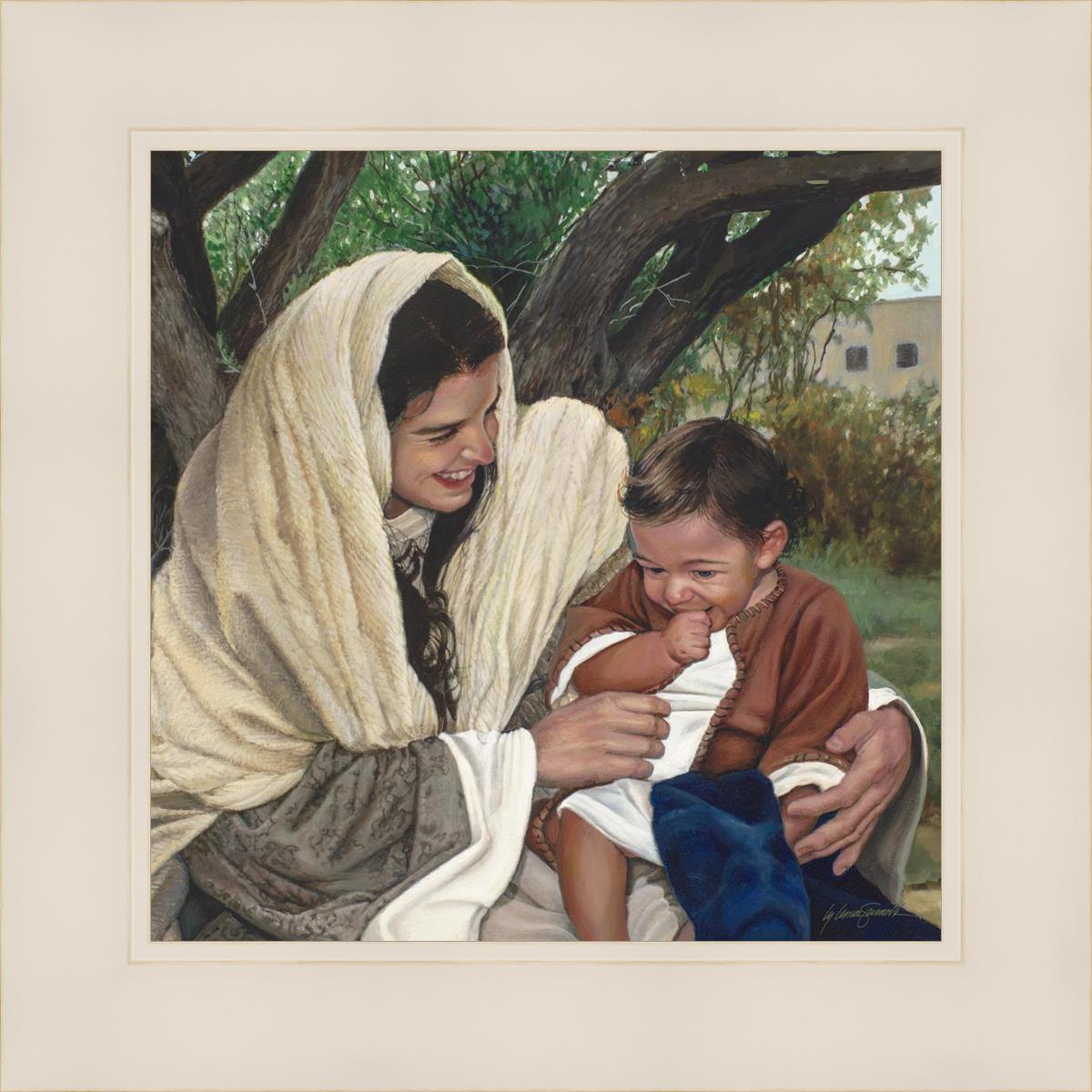 For All Small Moment is a painting by Liz Lemon Swindle. This painting depicts Mary with young Jesus sitting in front of a tree.