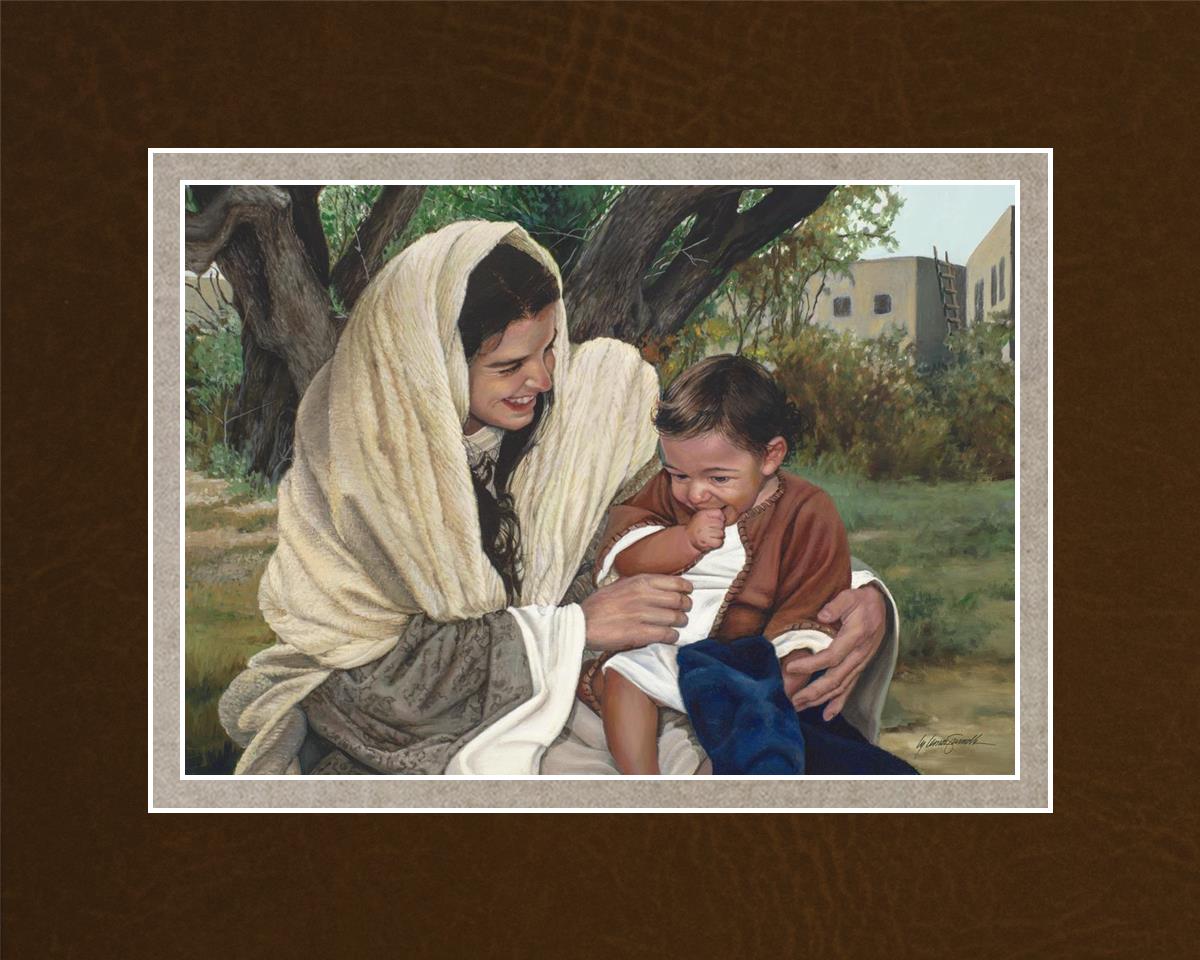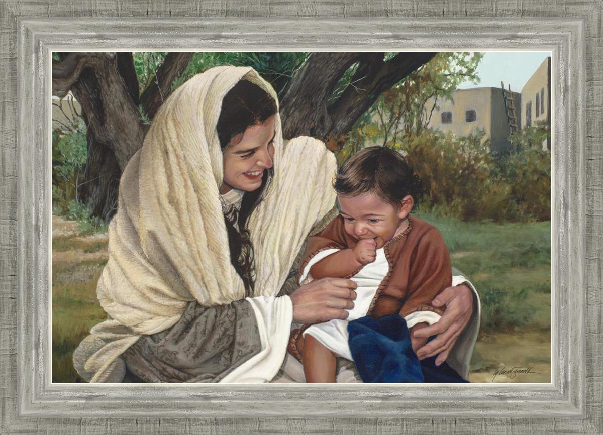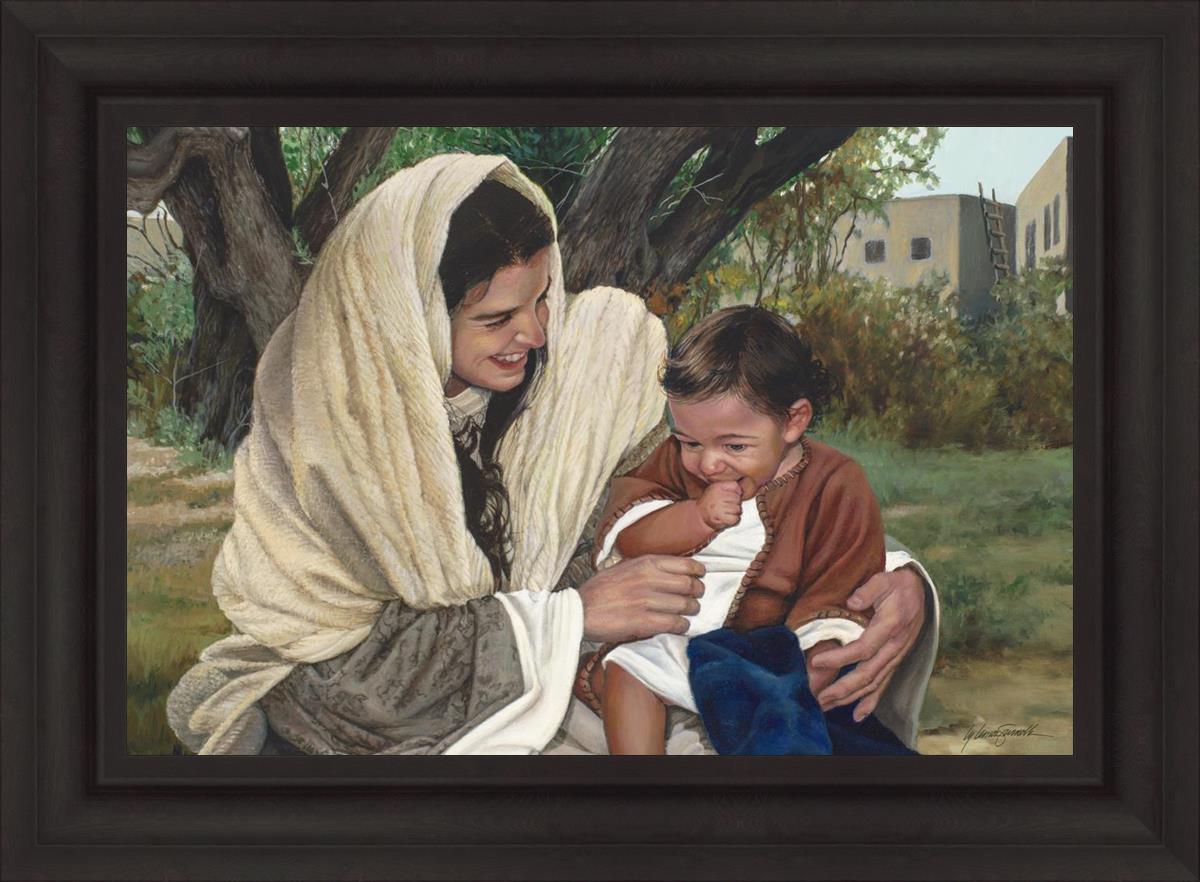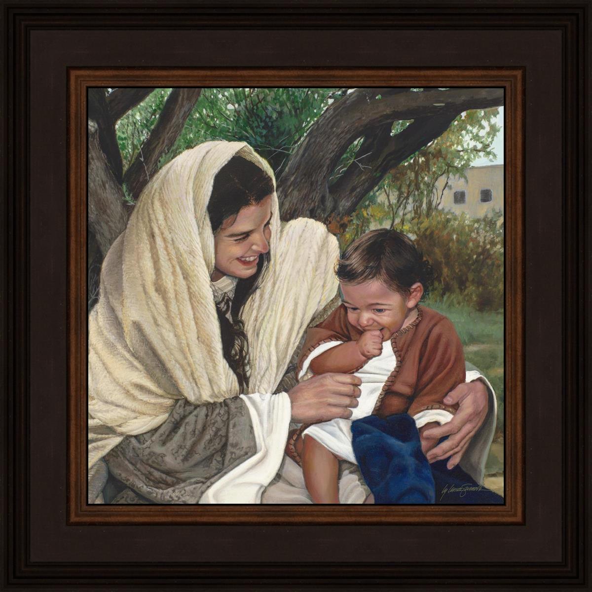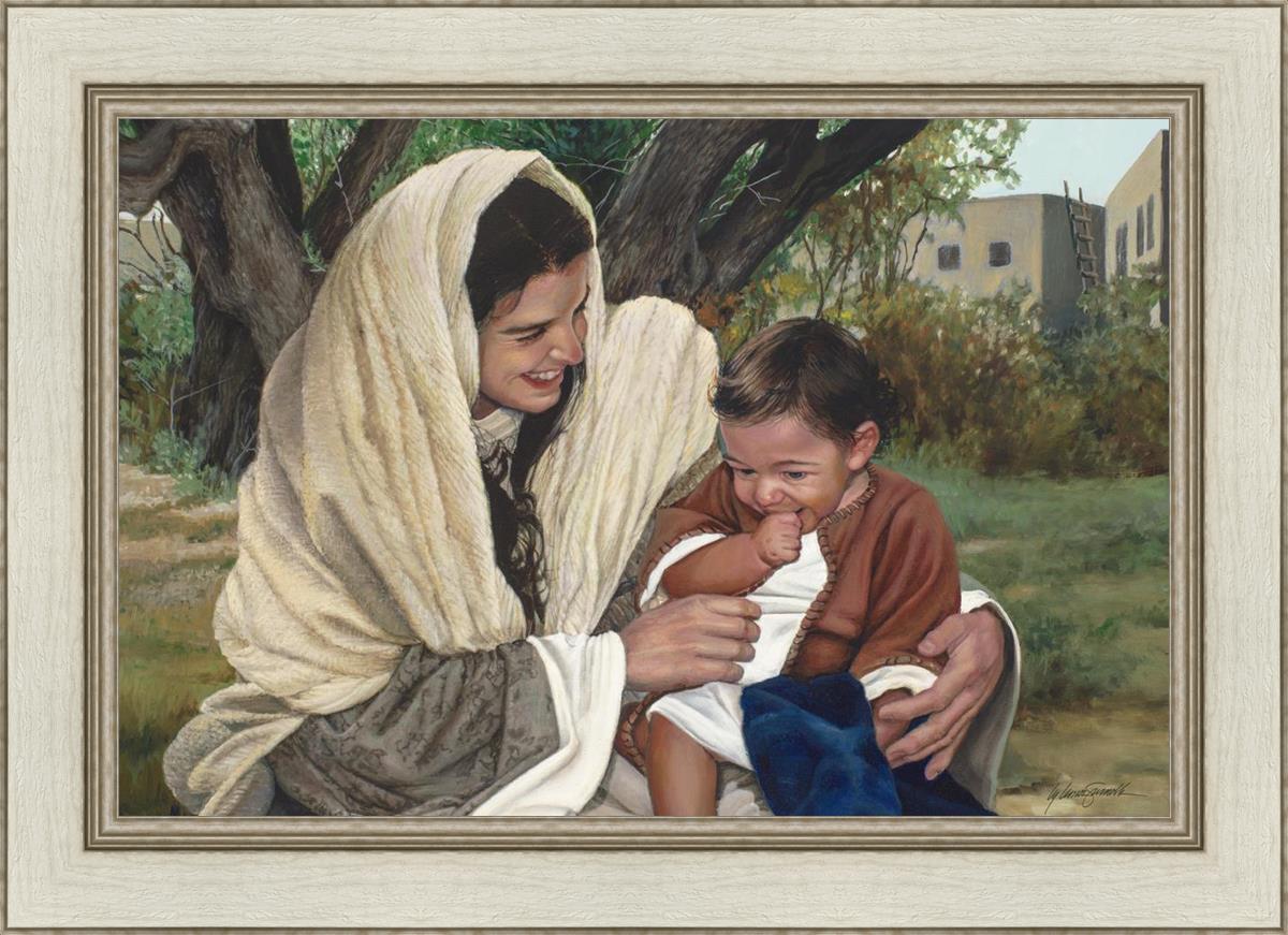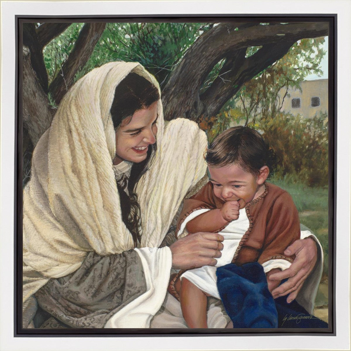 For All Small Moment is a painting by Liz Lemon Swindle. This painting depicts Mary with young Jesus sitting in front of a tree.