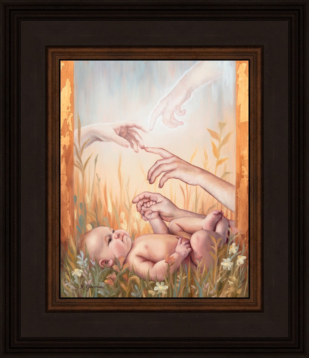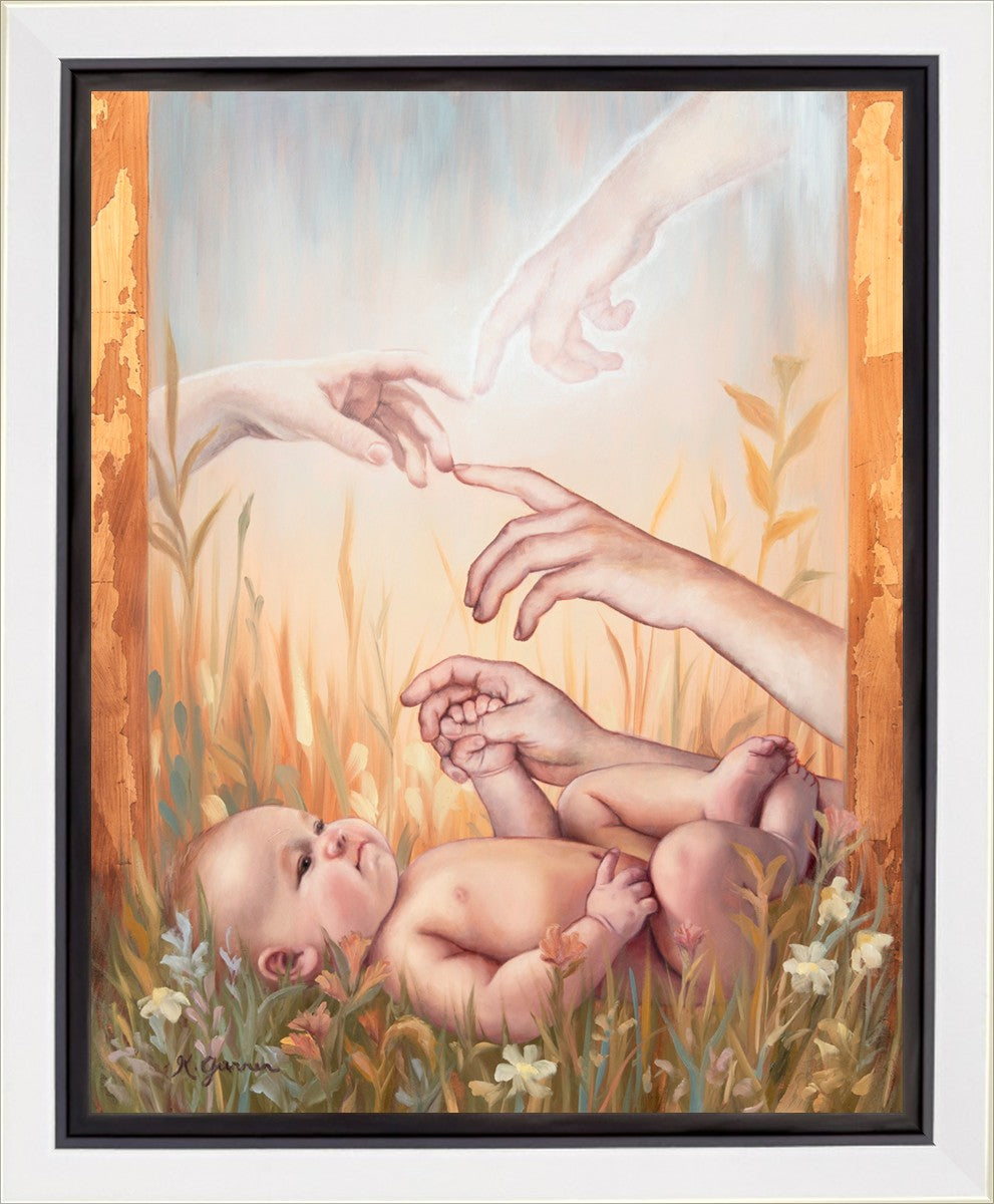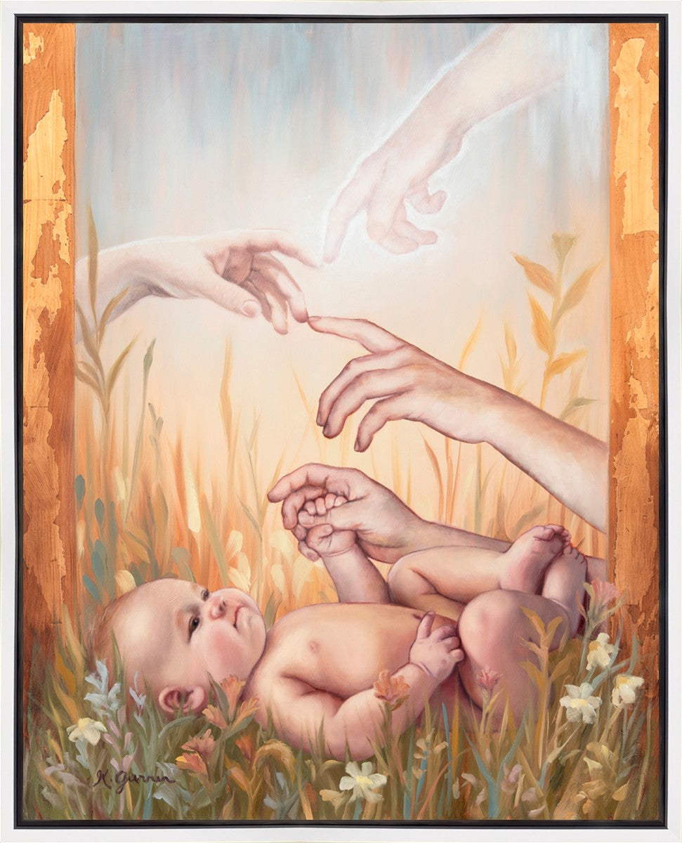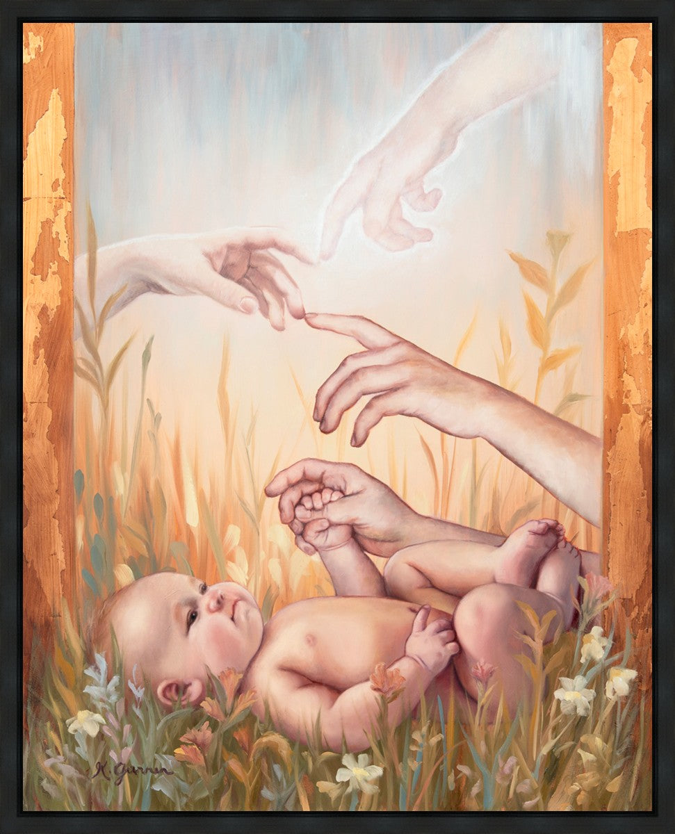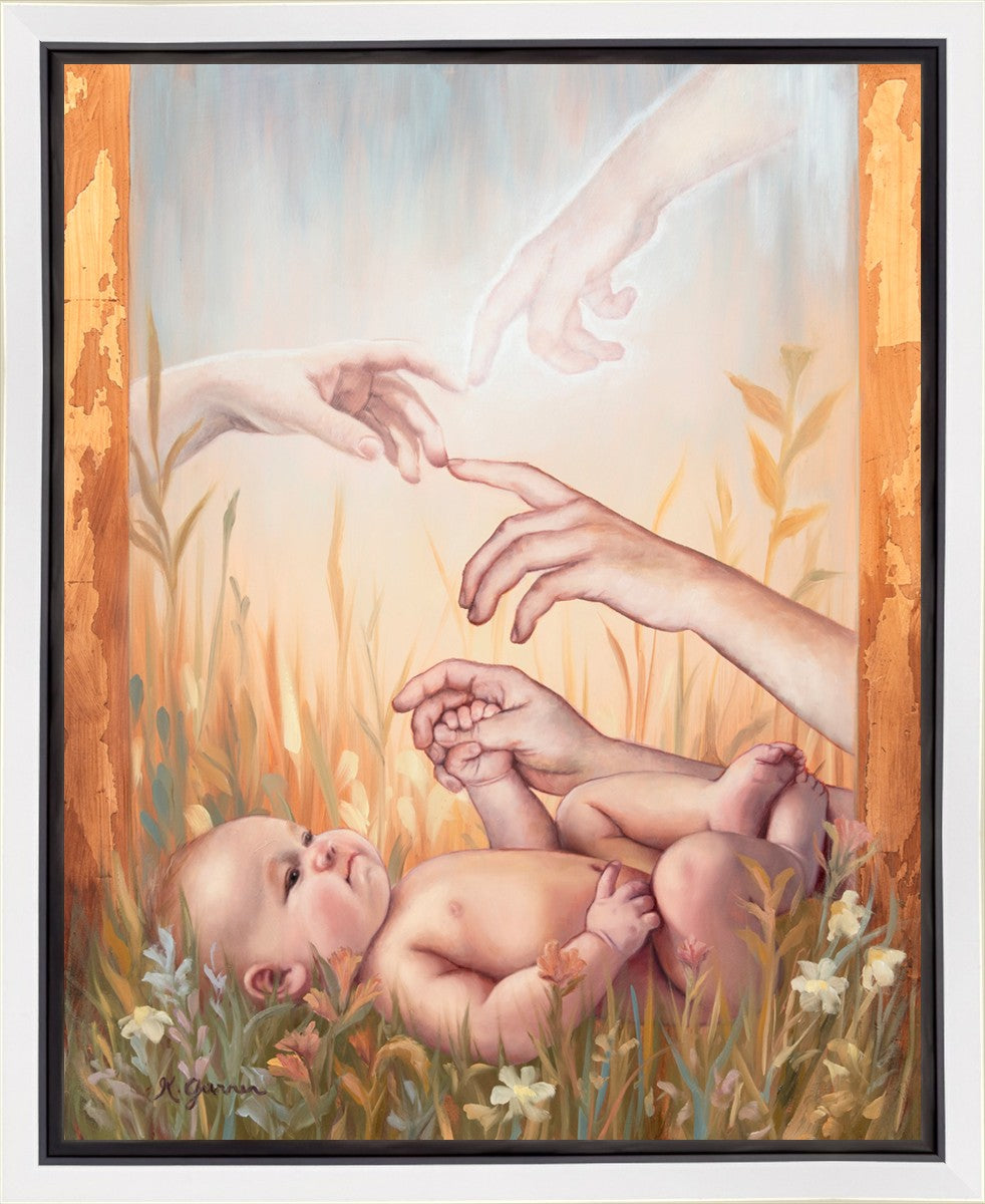 “Generations of Mothers” was first inspired by Michelangelo’s painting of the Creation of Adam. His painting was from a masculine perspective and I found myself excited to create a feminine version, with Heavenly Mother creating Eve. But the creation of Eve was more than the creation of just one woman, she was the vessel through which all the generations of the earth would be born.