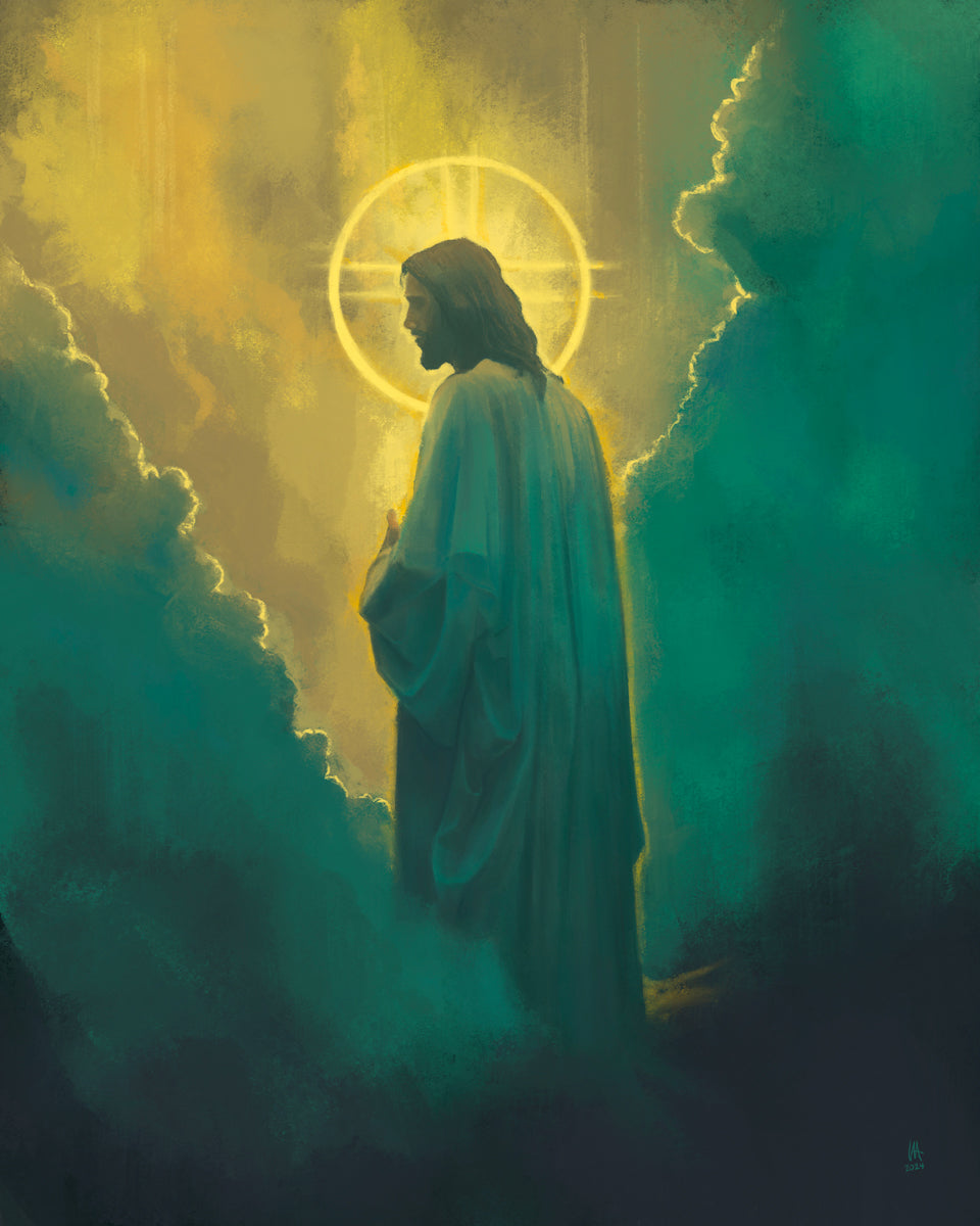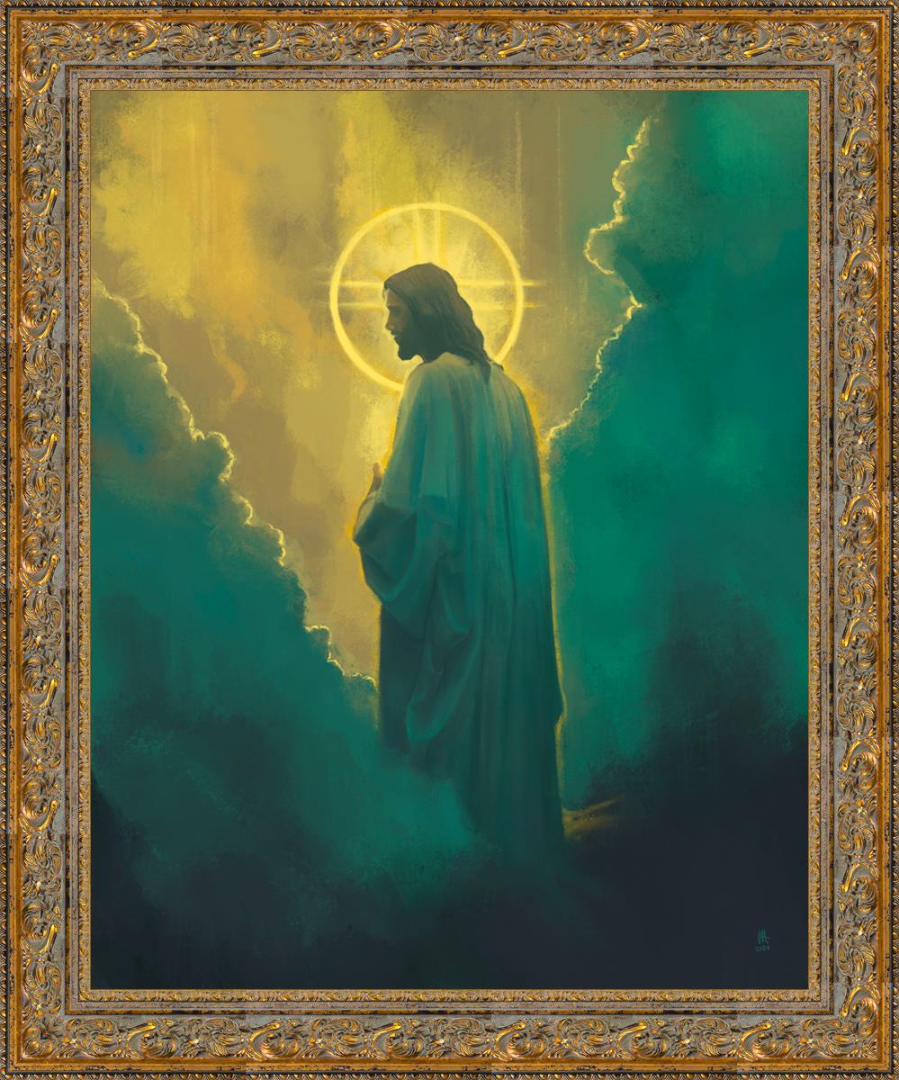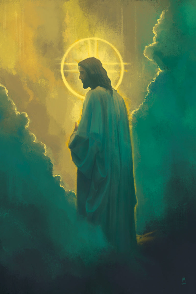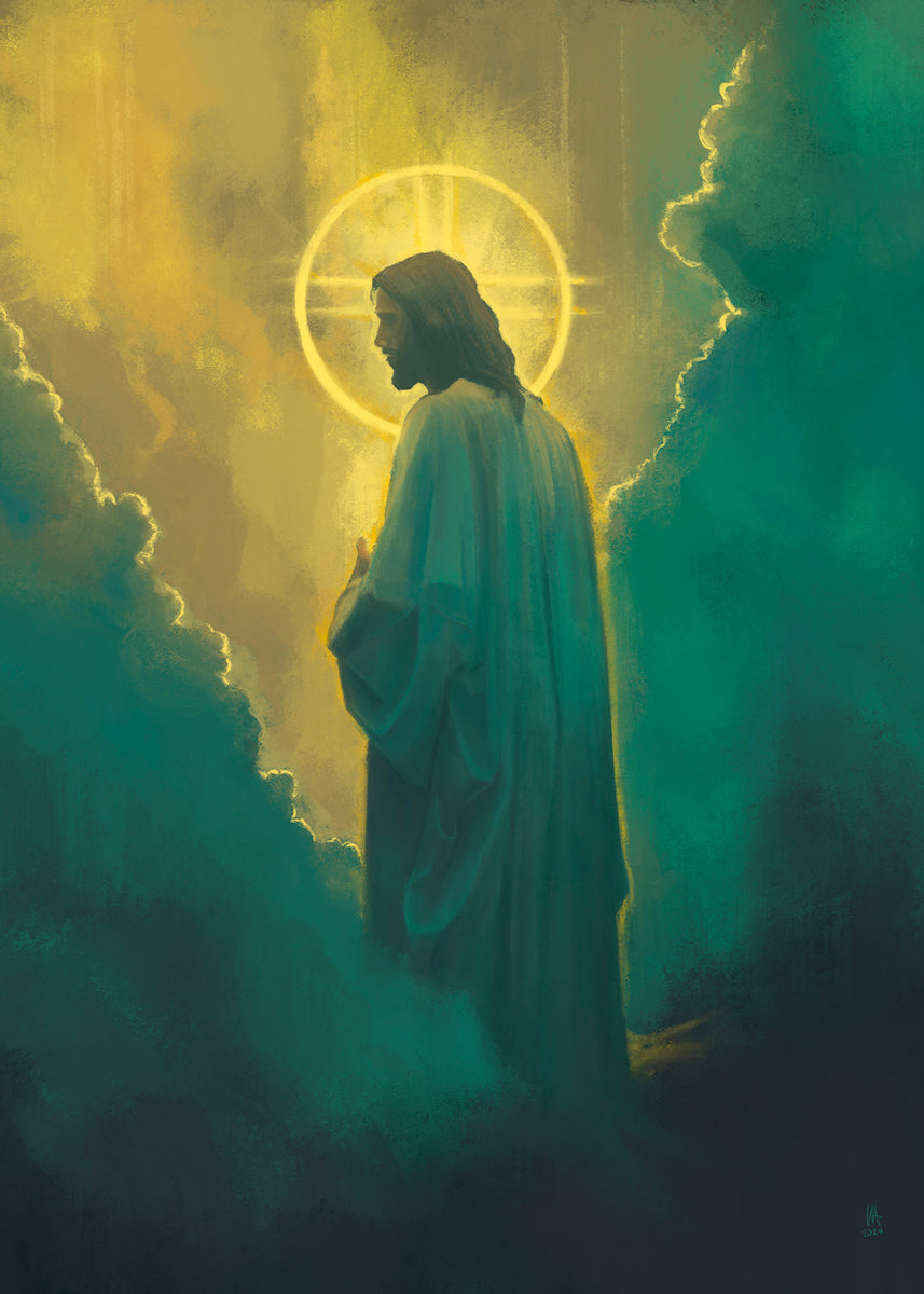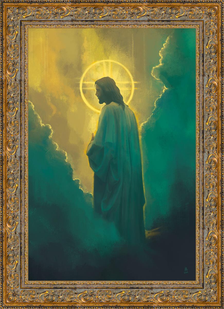 The clouds suggest the gentle and comforting nature of the divine. but also show that way the path and light is obscured without Christ to guide us. This painting offers a powerful and evocative portrayal of Jesus Christ, inviting viewers to contemplate the divine and its relationship to humanity.