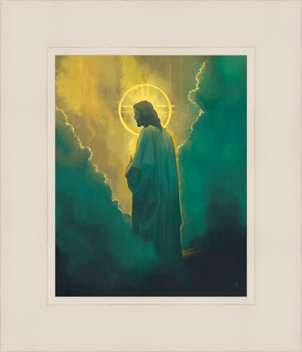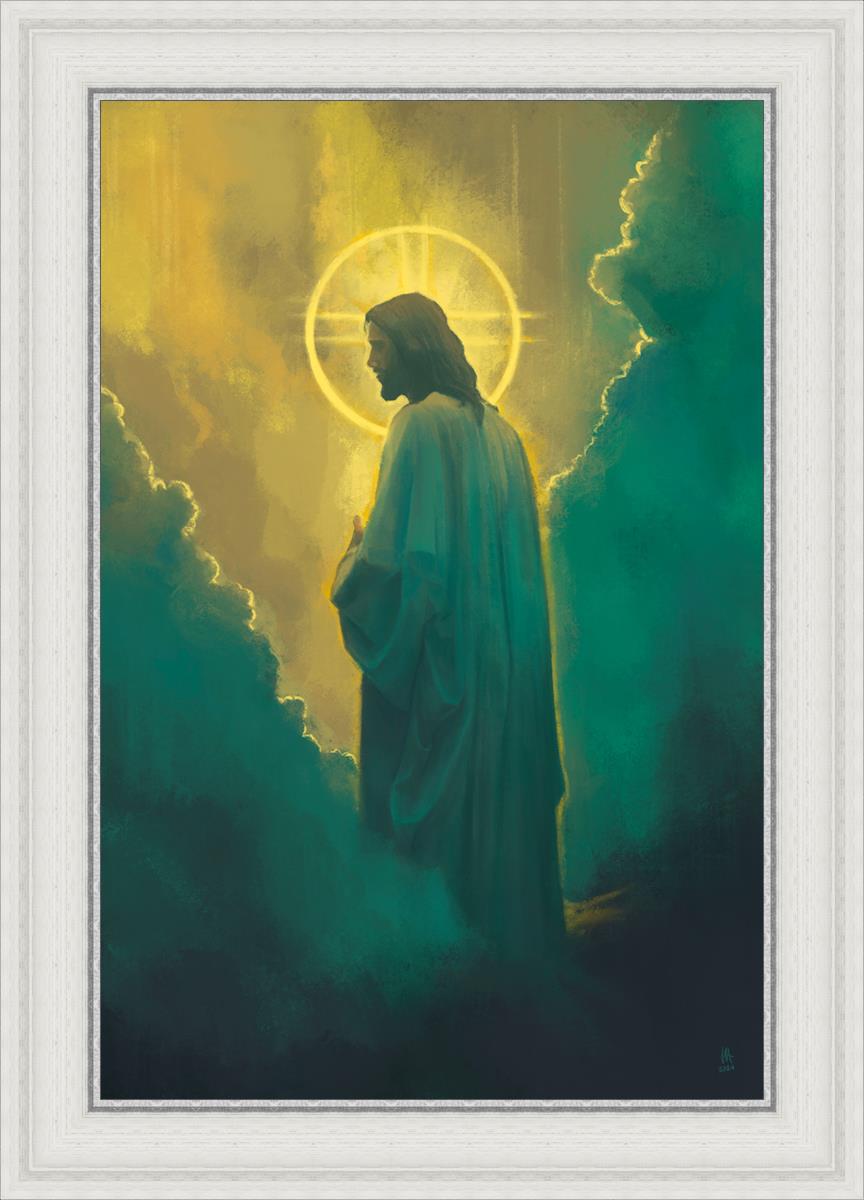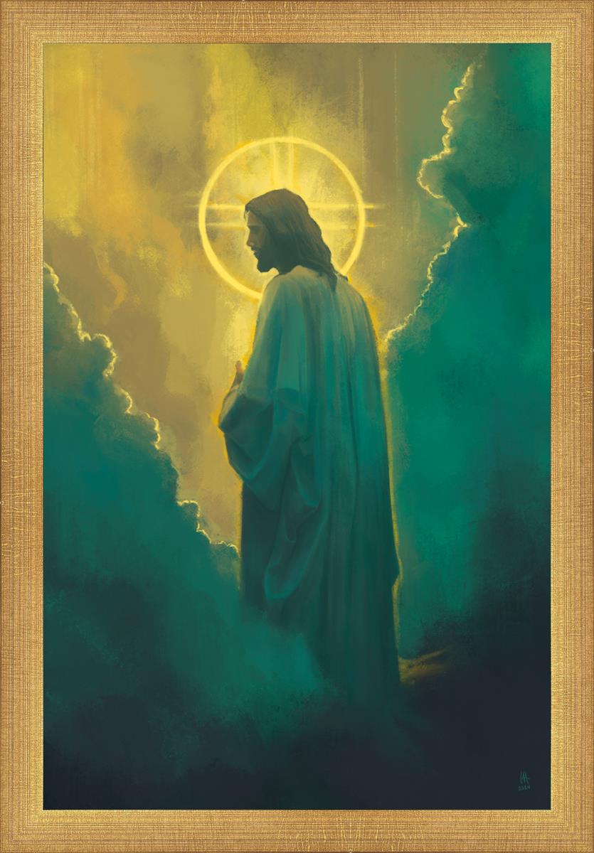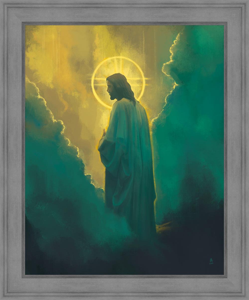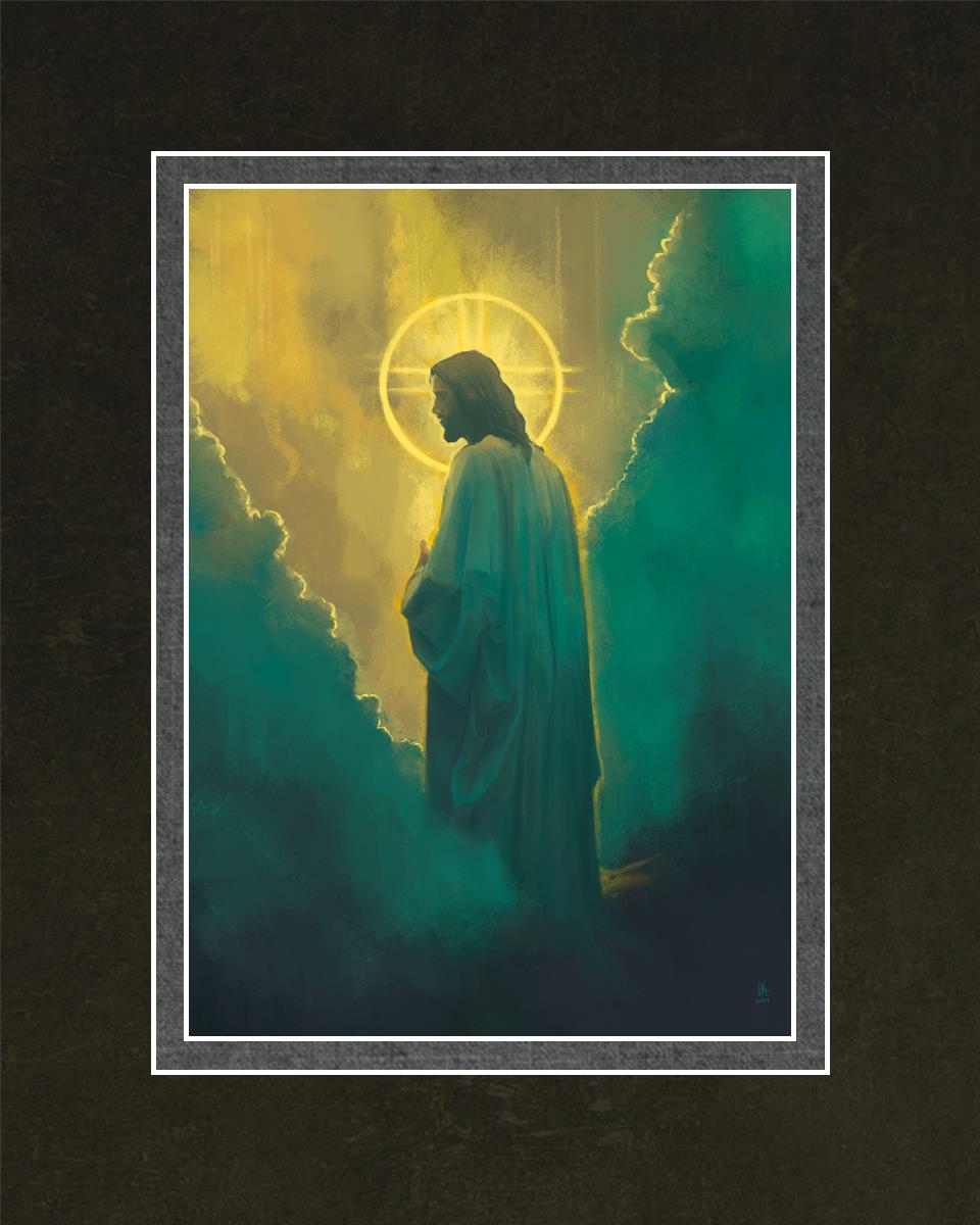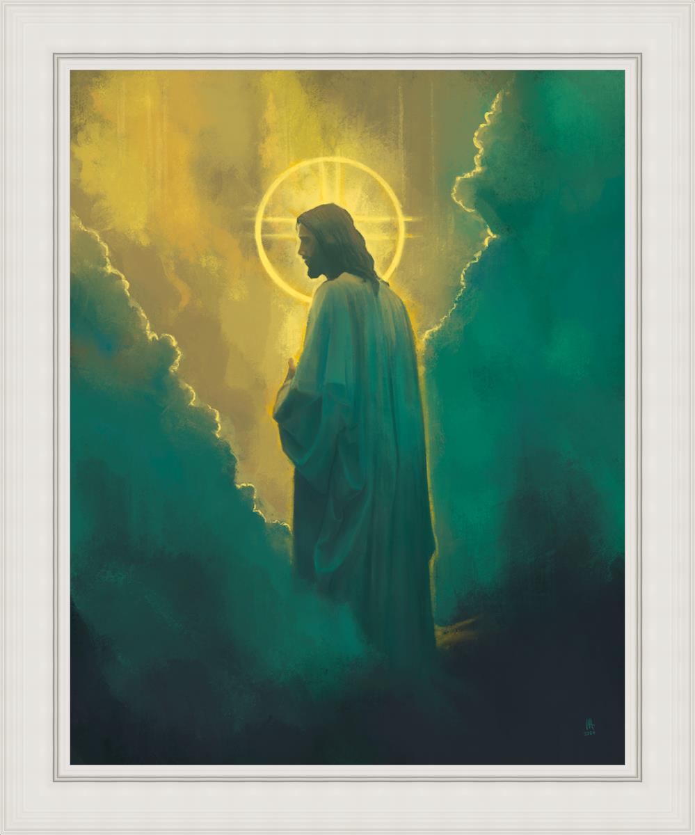 The clouds suggest the gentle and comforting nature of the divine. but also show that way the path and light is obscured without Christ to guide us. This painting offers a powerful and evocative portrayal of Jesus Christ, inviting viewers to contemplate the divine and its relationship to humanity.