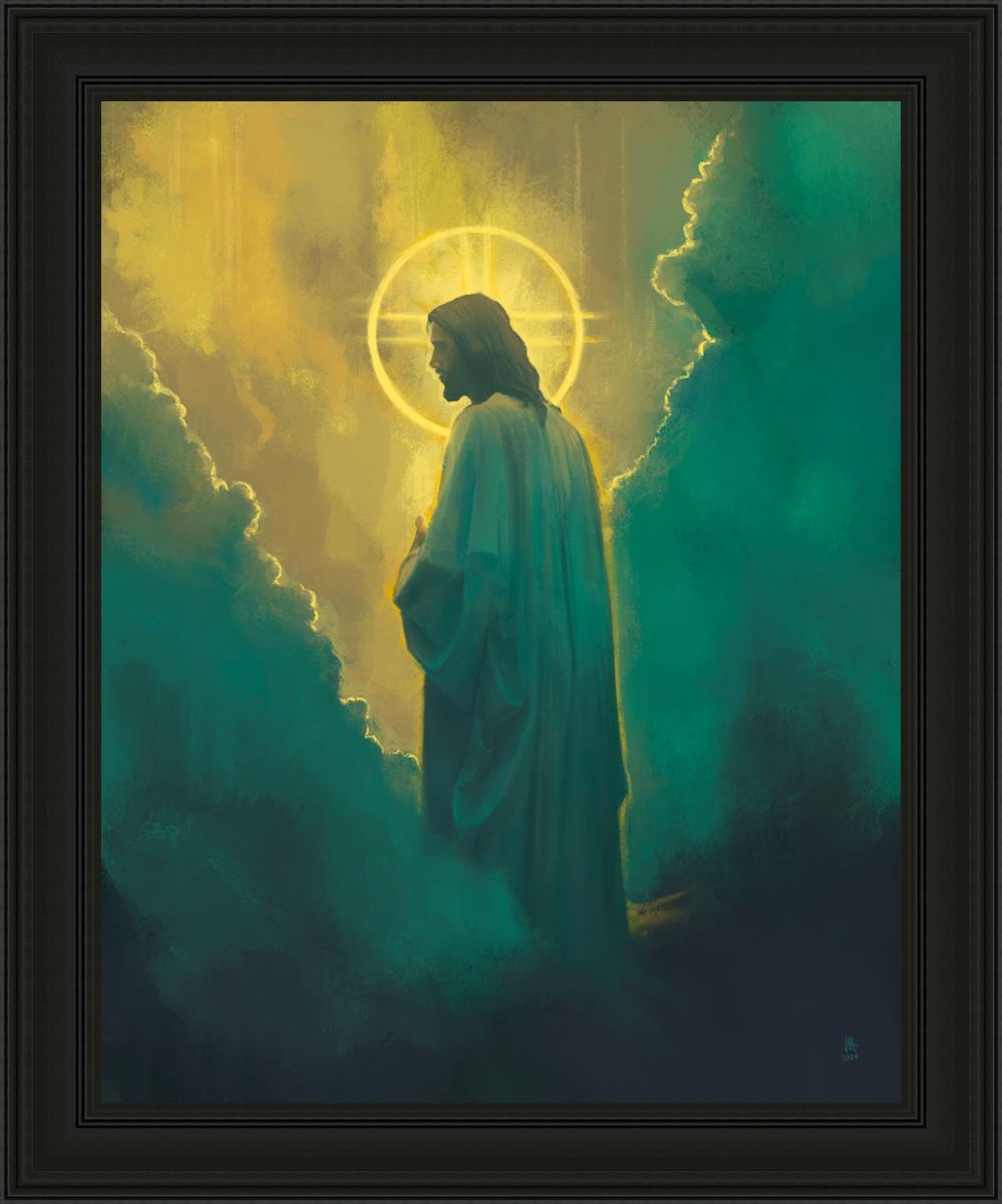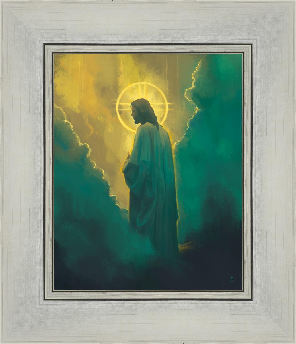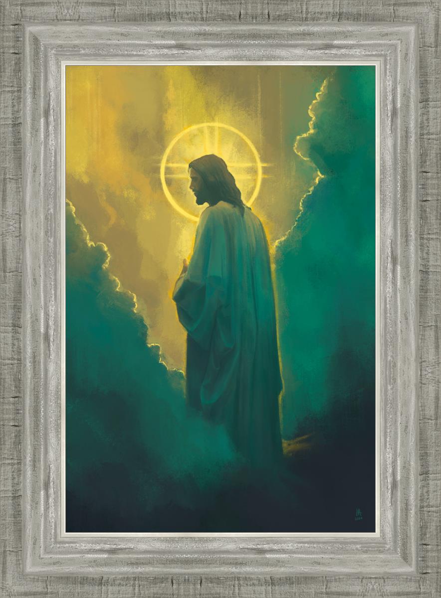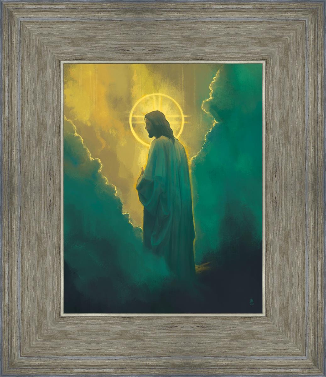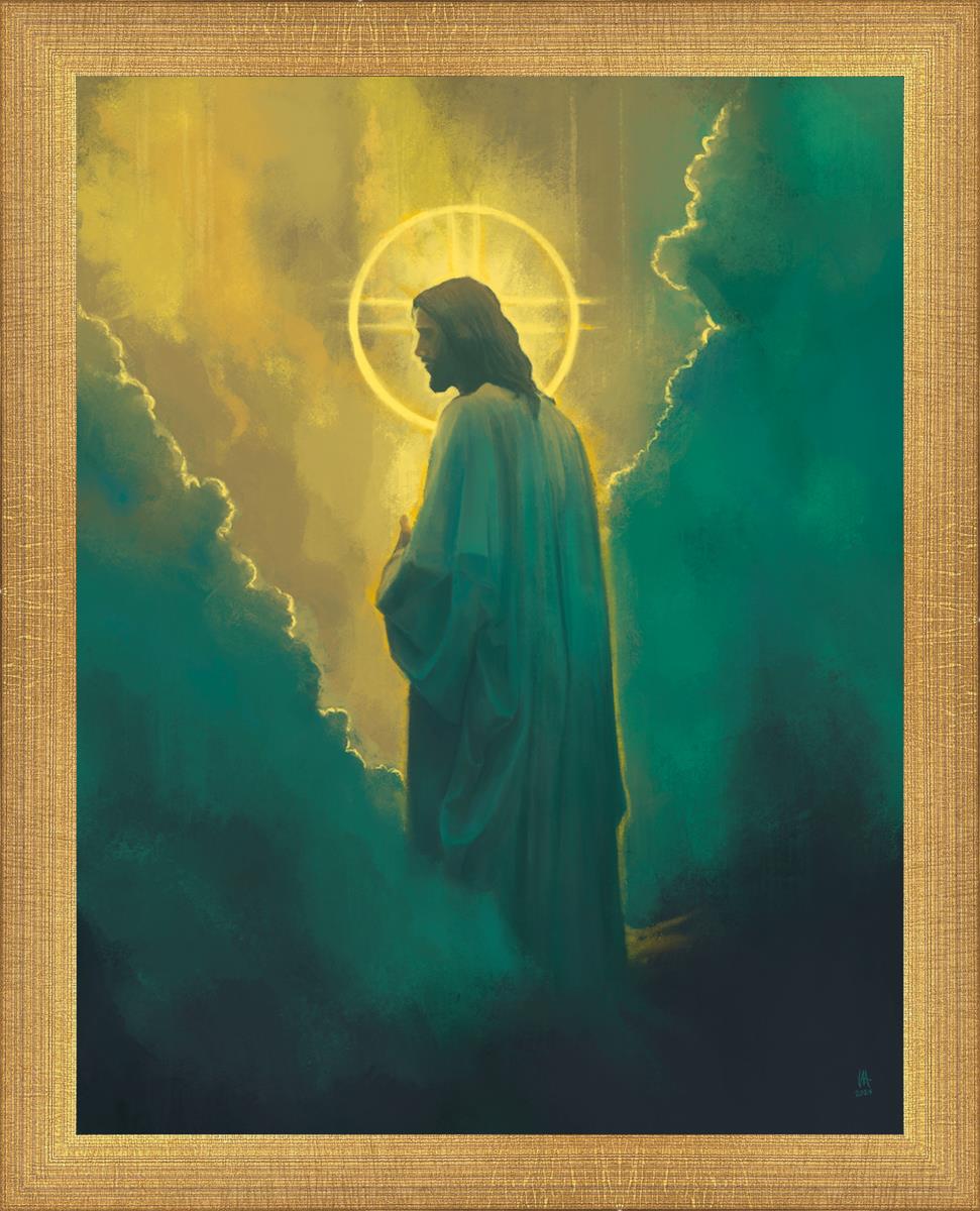 The clouds suggest the gentle and comforting nature of the divine. but also show that way the path and light is obscured without Christ to guide us. This painting offers a powerful and evocative portrayal of Jesus Christ, inviting viewers to contemplate the divine and its relationship to humanity.