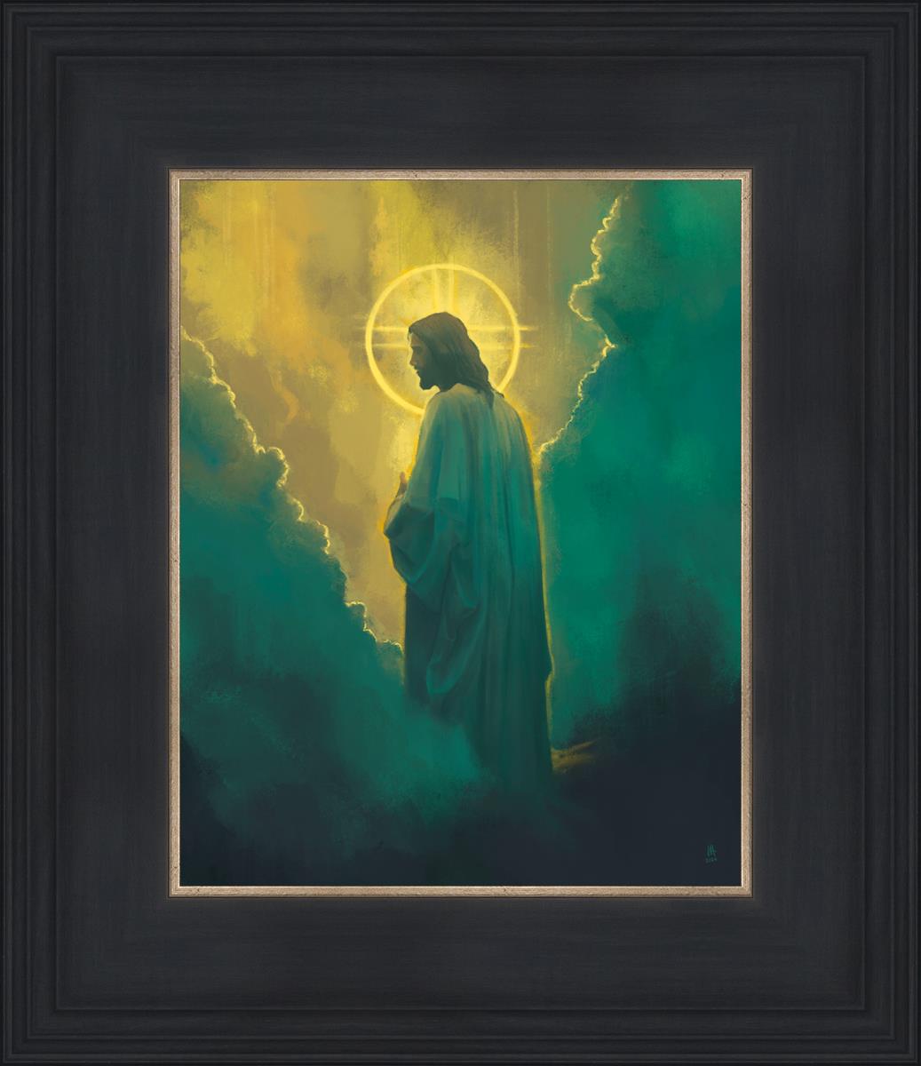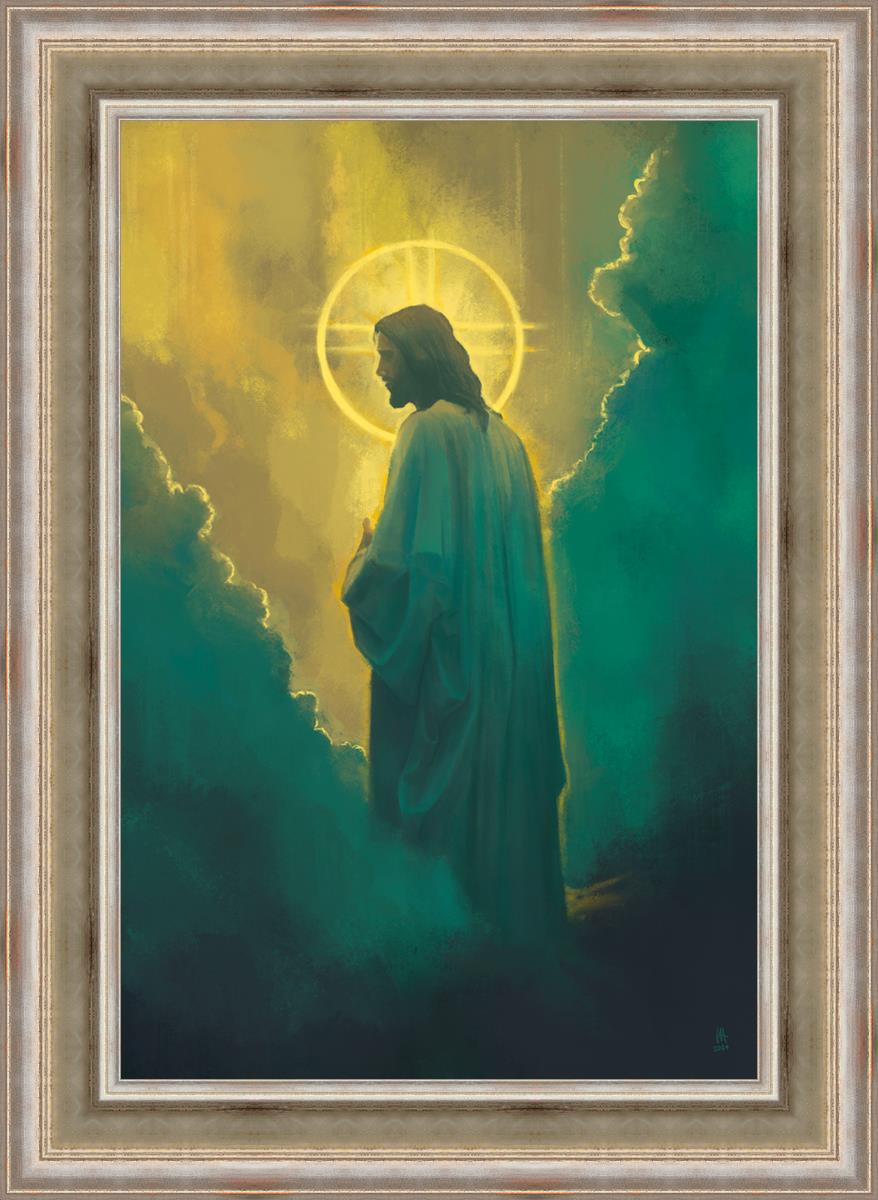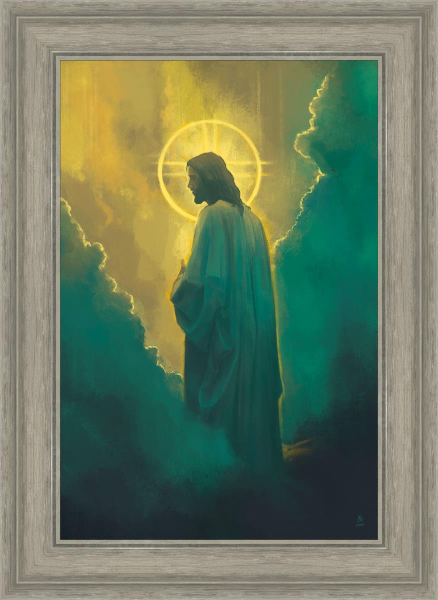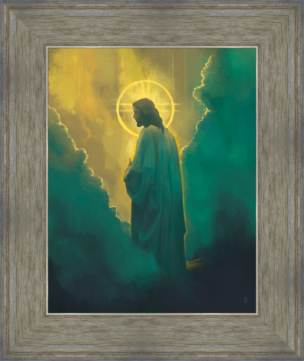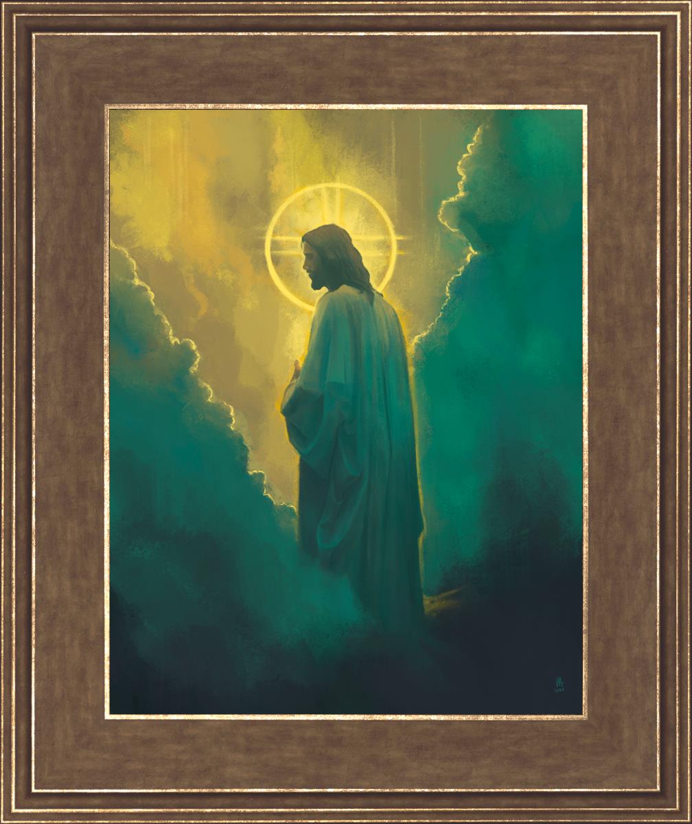 The clouds suggest the gentle and comforting nature of the divine. but also show that way the path and light is obscured without Christ to guide us. This painting offers a powerful and evocative portrayal of Jesus Christ, inviting viewers to contemplate the divine and its relationship to humanity.