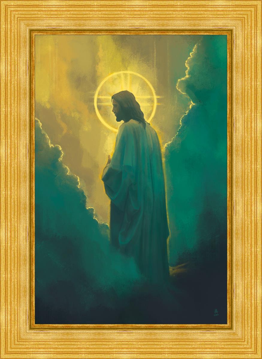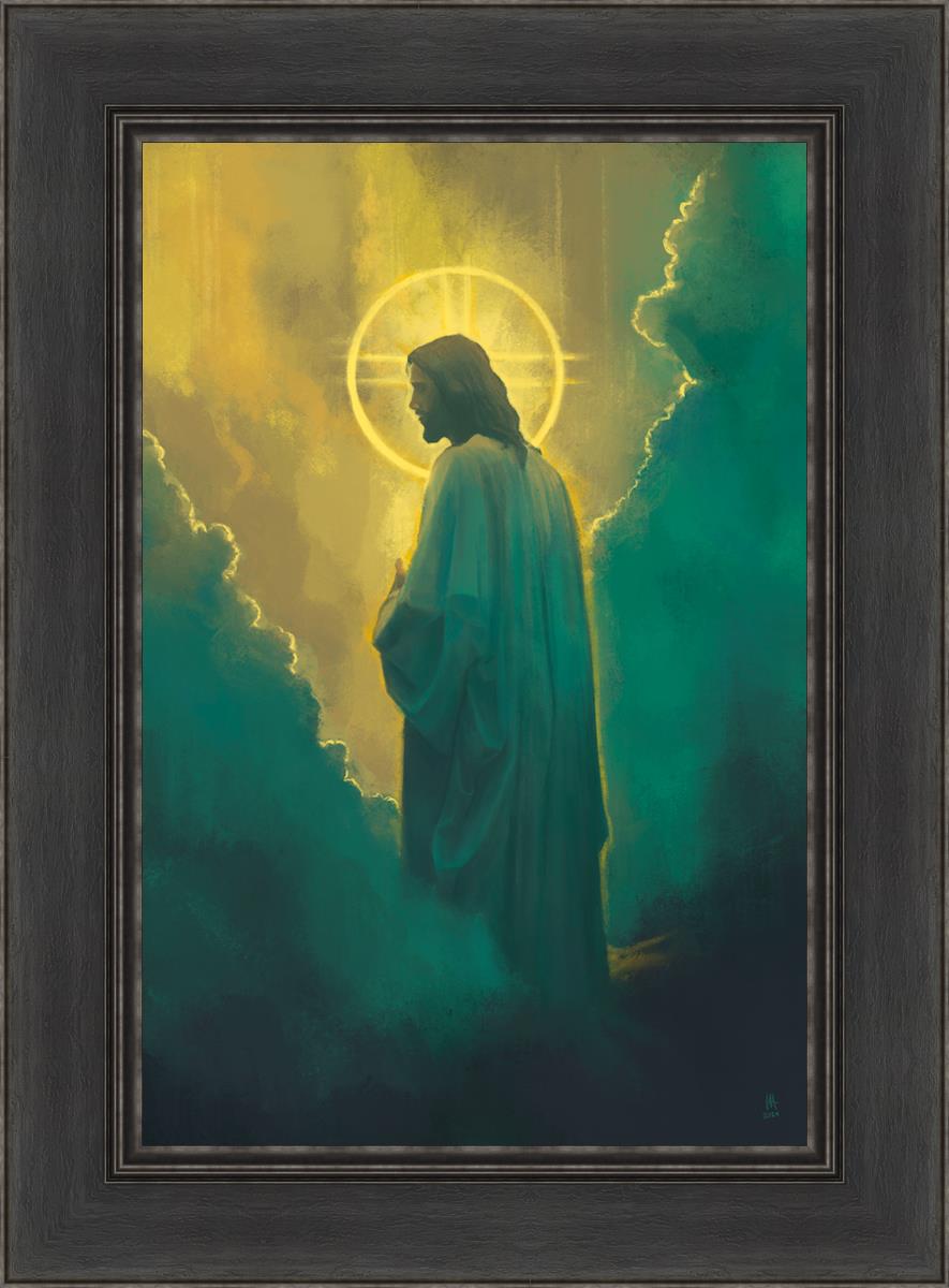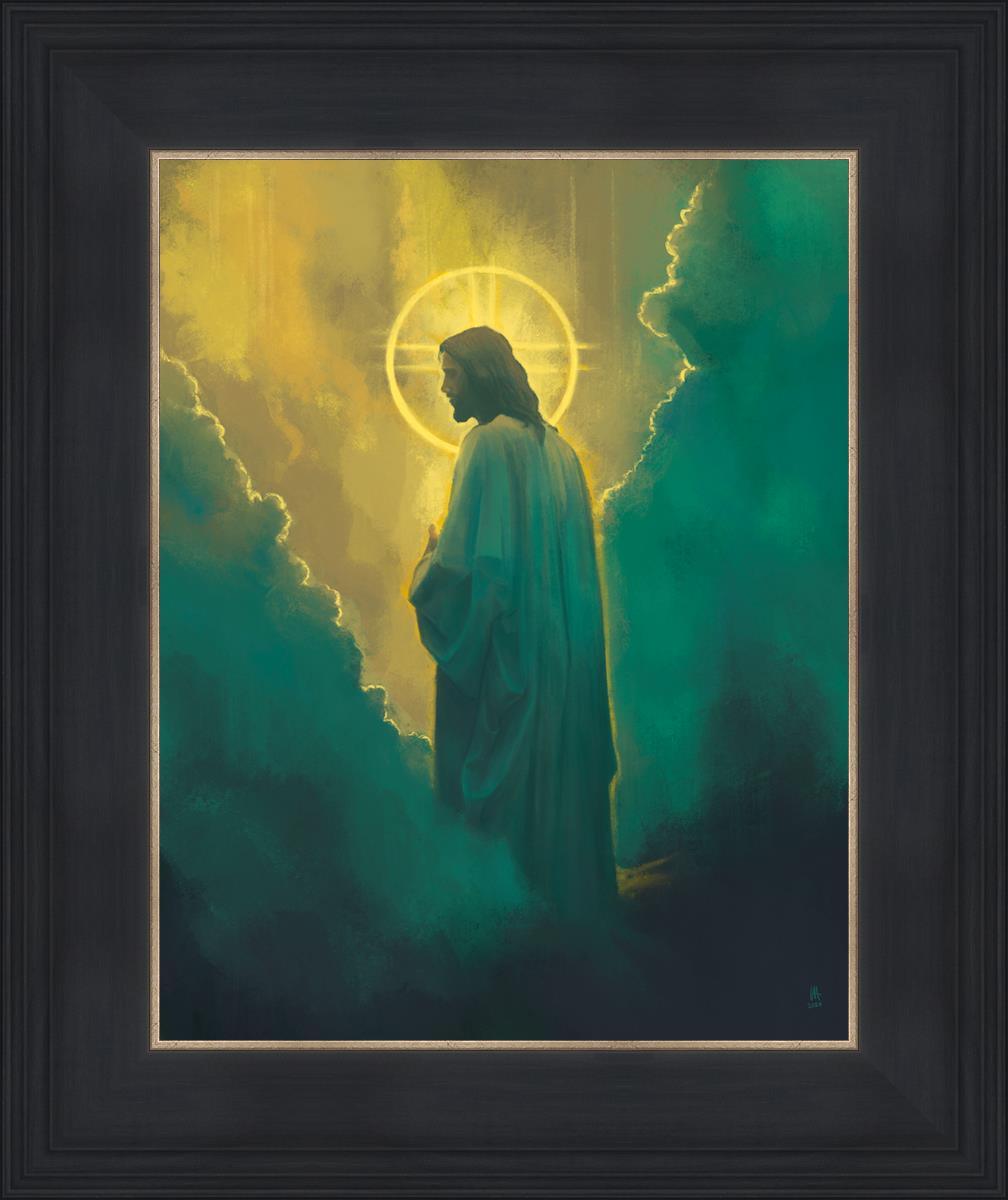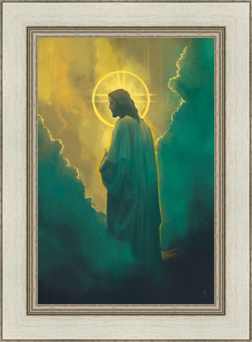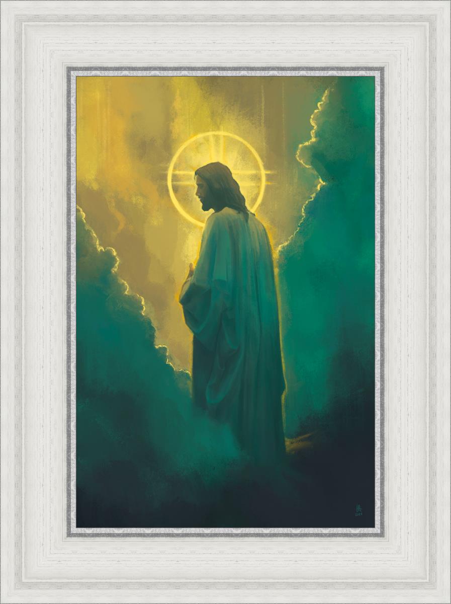 The clouds suggest the gentle and comforting nature of the divine. but also show that way the path and light is obscured without Christ to guide us. This painting offers a powerful and evocative portrayal of Jesus Christ, inviting viewers to contemplate the divine and its relationship to humanity.