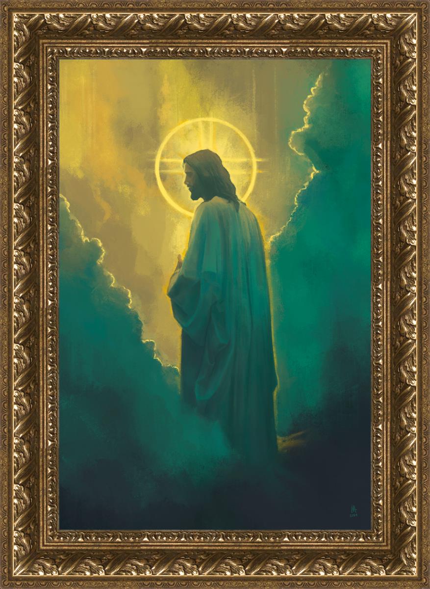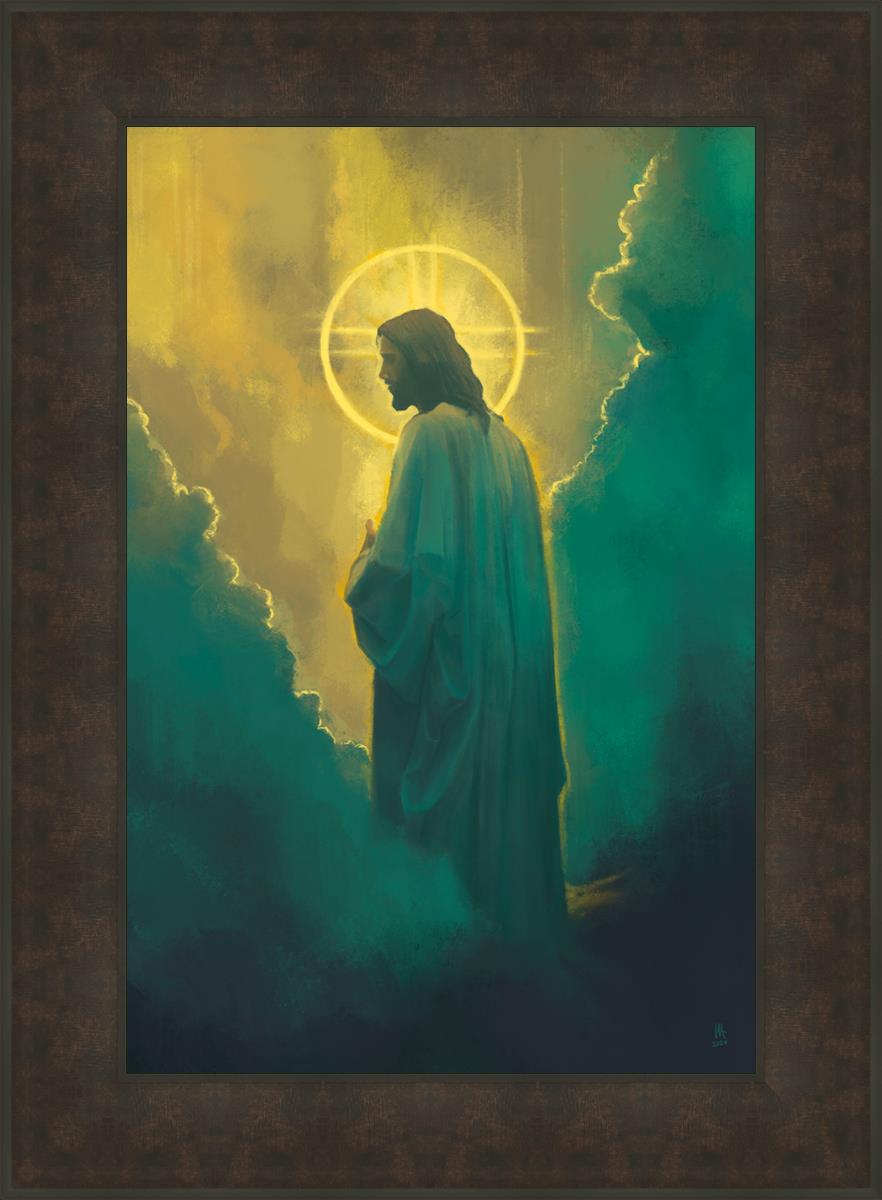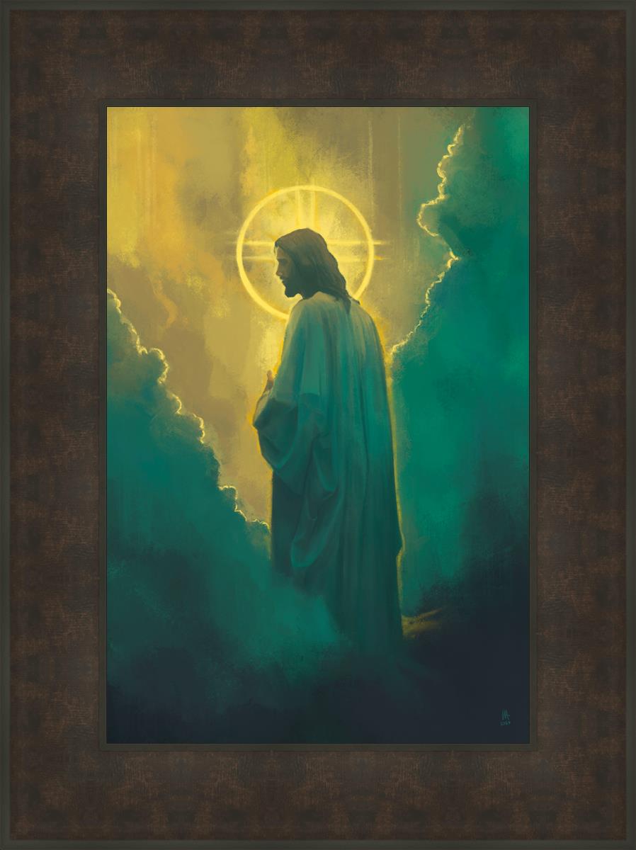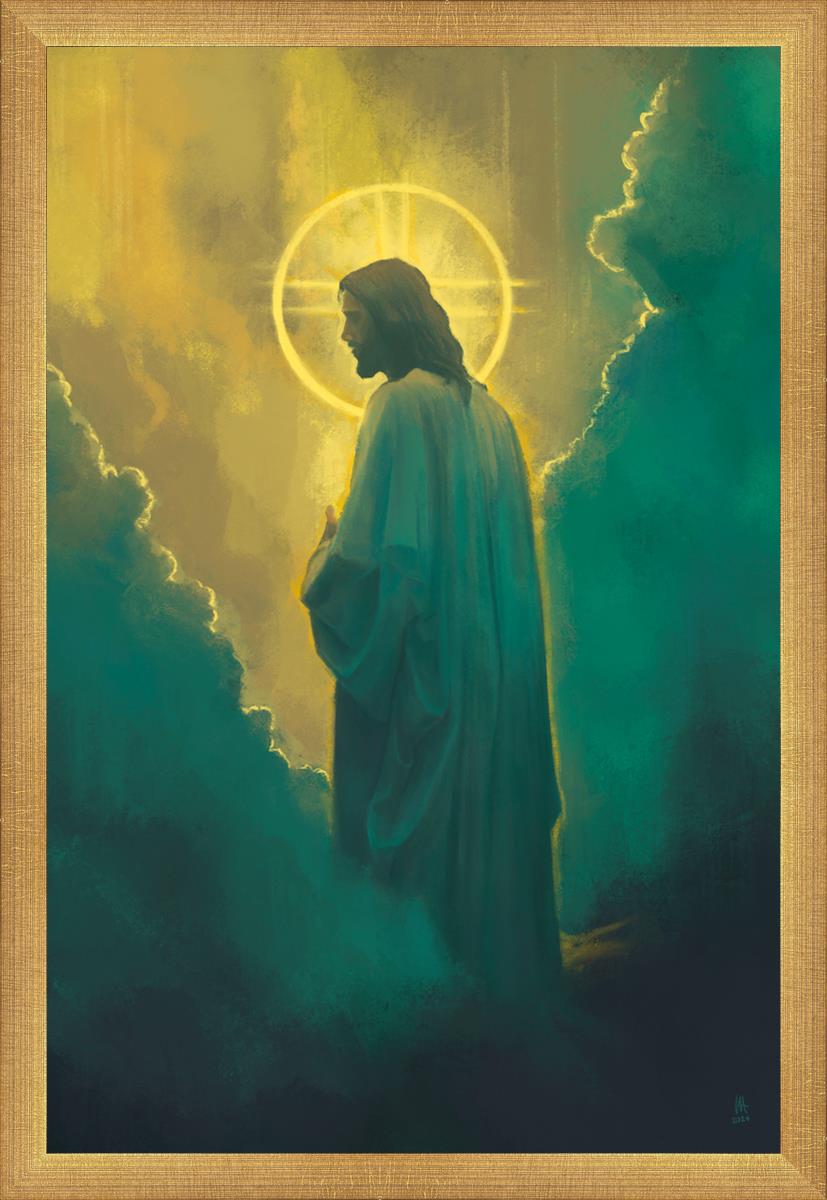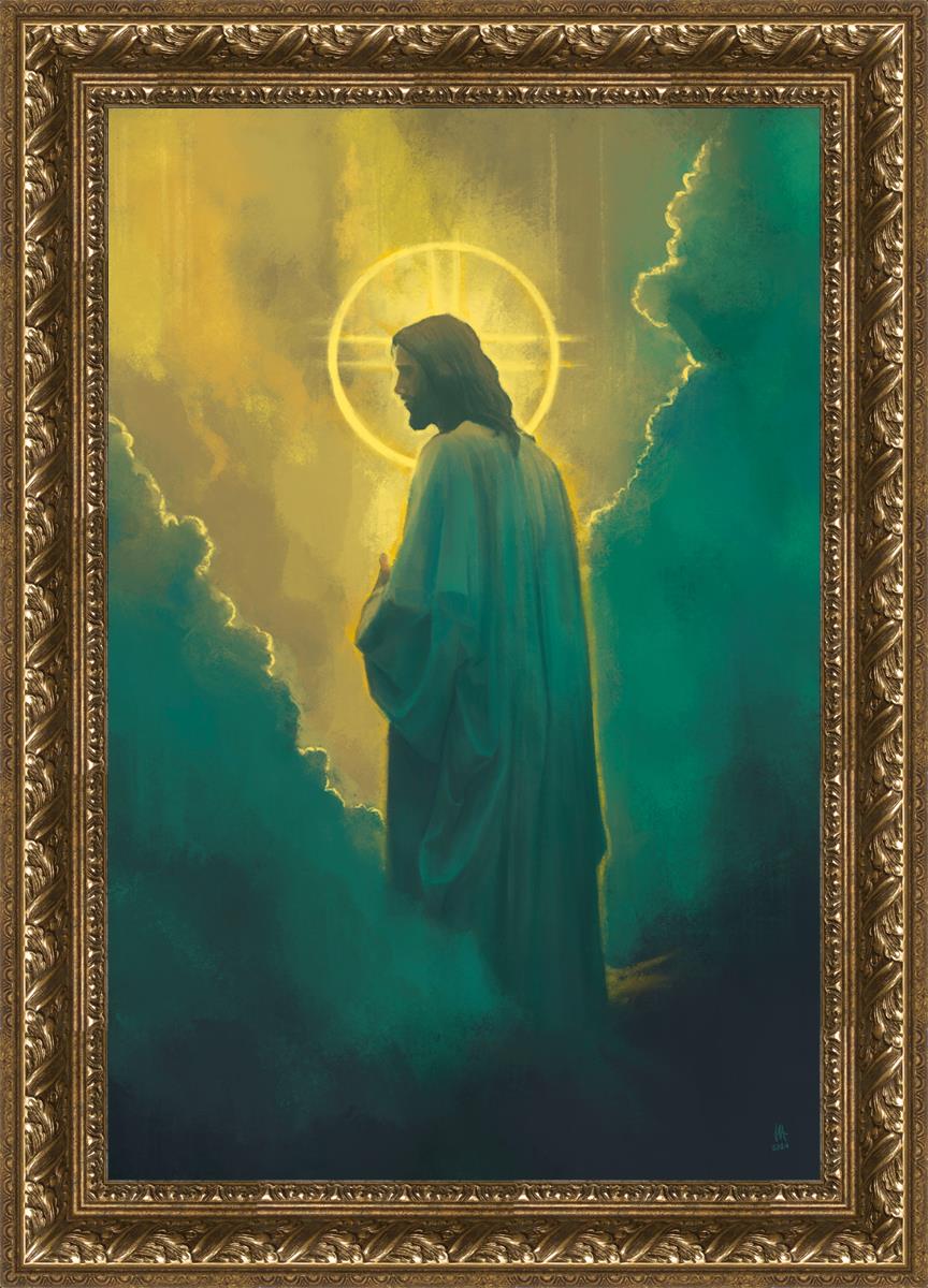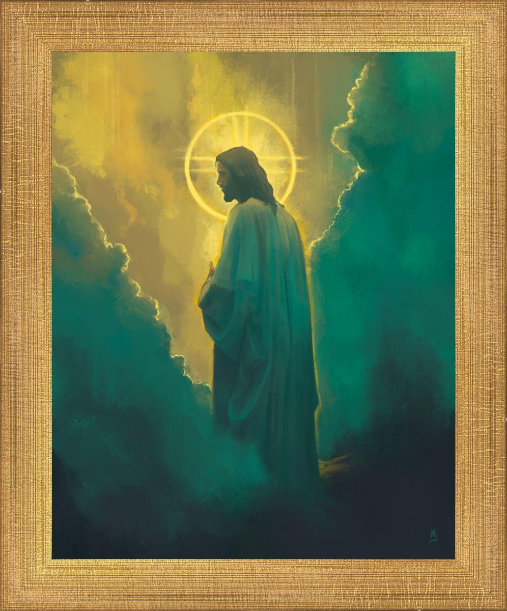 Jesus leads us on the path back to our Heavenly Father, bringing us from the darkness back into the light of God's presence. This image is meant to show Christ inviting us then leading us without cohesion. A halo, a symbol of divine crowning glory, encircles his head, a luminous aureole that emphasizes his sacred nature.