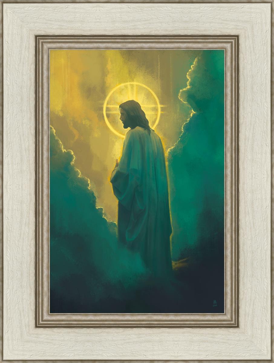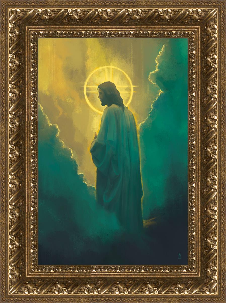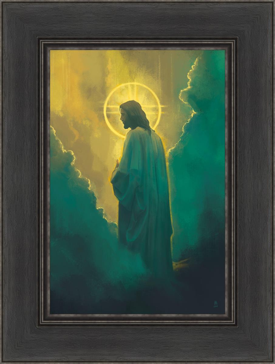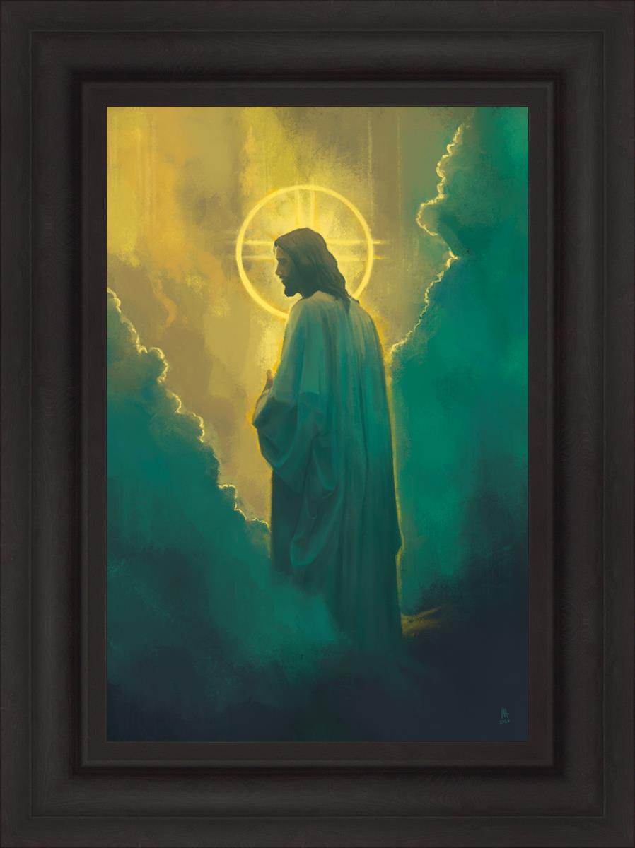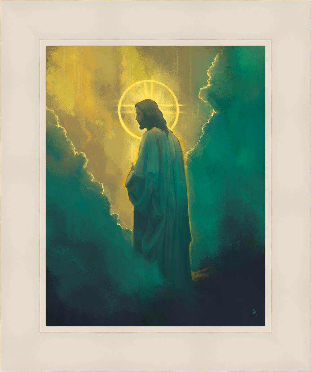 Jesus leads us on the path back to our Heavenly Father, bringing us from the darkness back into the light of God's presence. This image is meant to show Christ inviting us then leading us without cohesion. A halo, a symbol of divine crowning glory, encircles his head, a luminous aureole that emphasizes his sacred nature.