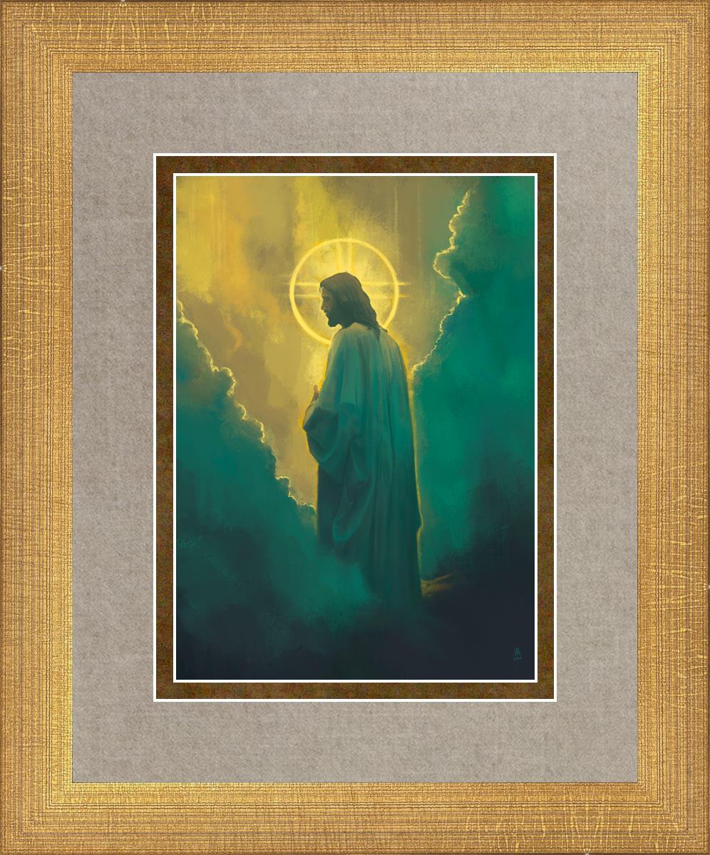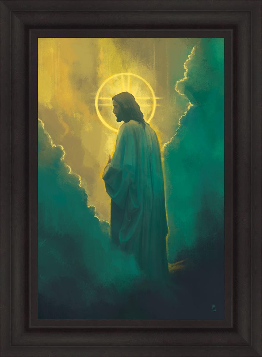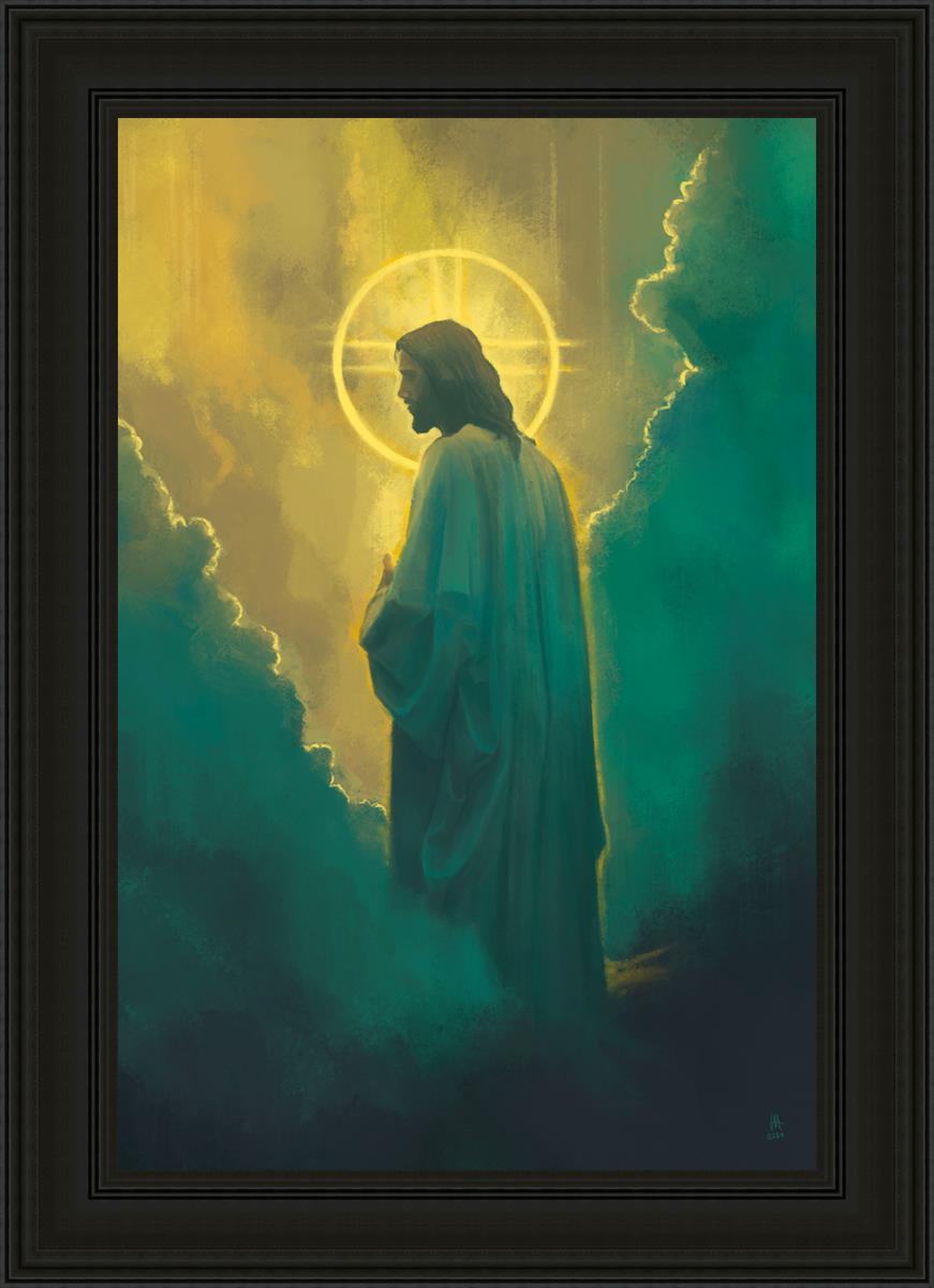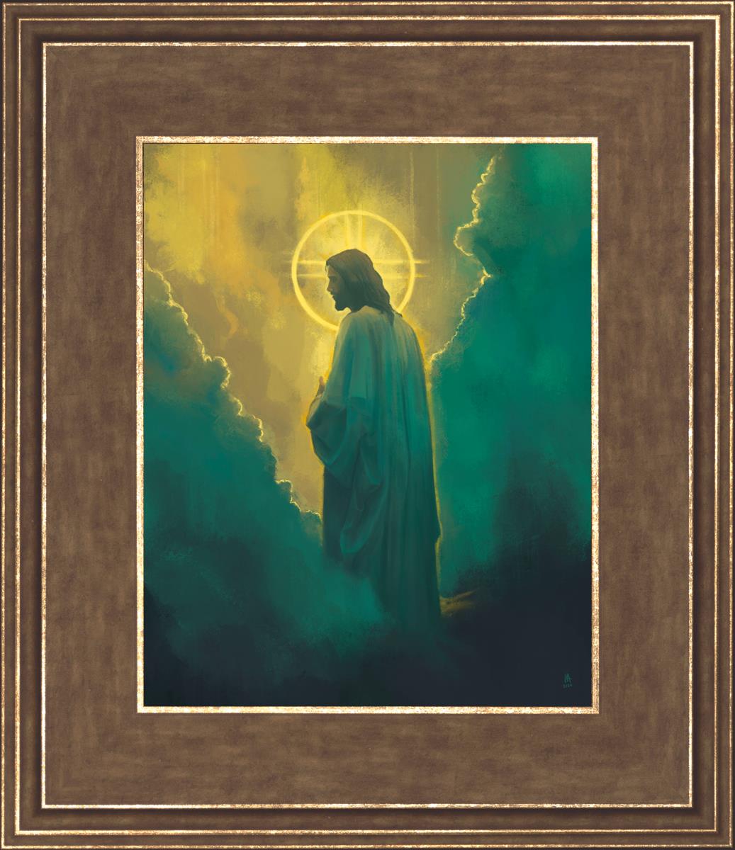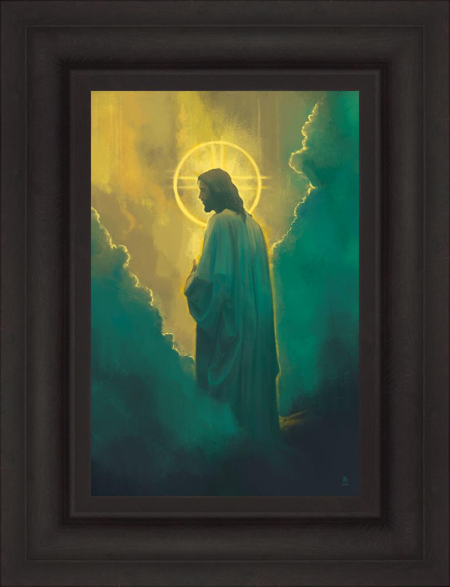 Jesus leads us on the path back to our Heavenly Father, bringing us from the darkness back into the light of God's presence. This image is meant to show Christ inviting us then leading us without cohesion. A halo, a symbol of divine crowning glory, encircles his head, a luminous aureole that emphasizes his sacred nature.