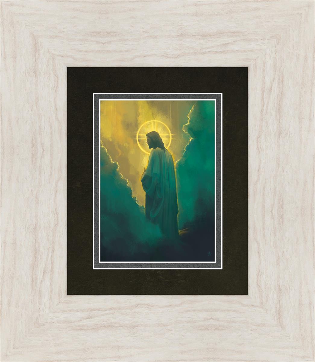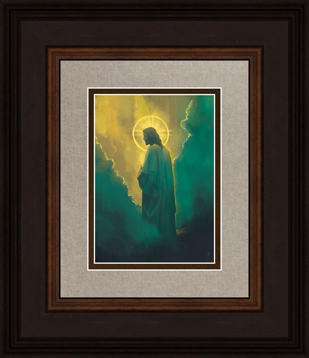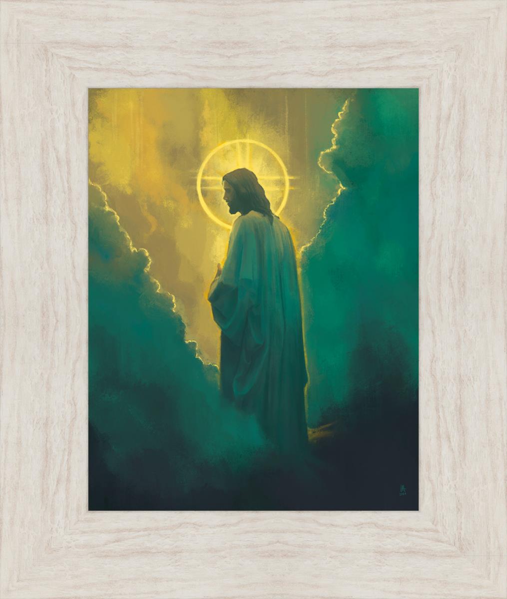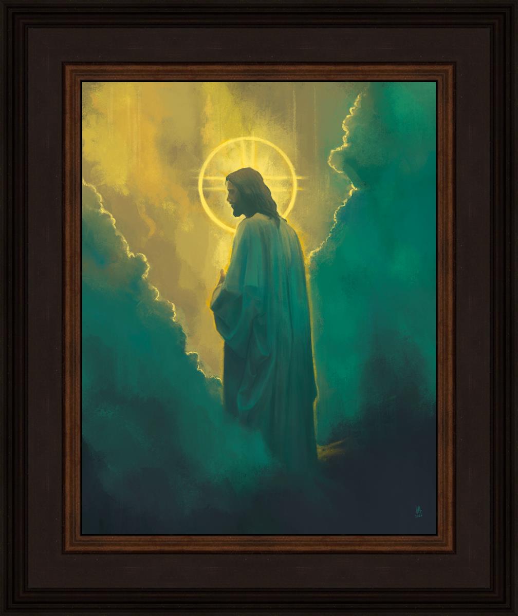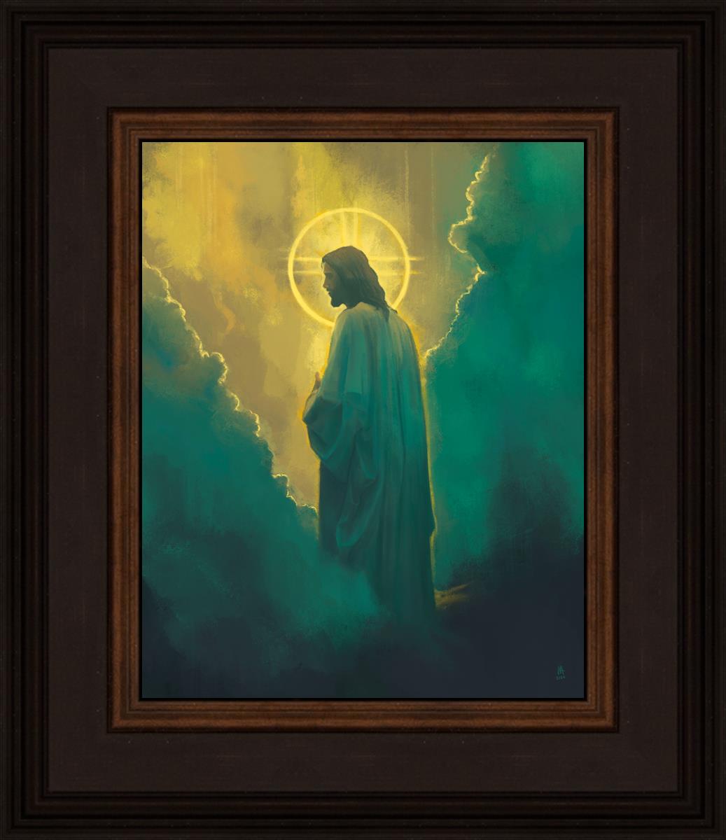 Jesus leads us on the path back to our Heavenly Father, bringing us from the darkness back into the light of God's presence. This image is meant to show Christ inviting us then leading us without cohesion. A halo, a symbol of divine crowning glory, encircles his head, a luminous aureole that emphasizes his sacred nature.