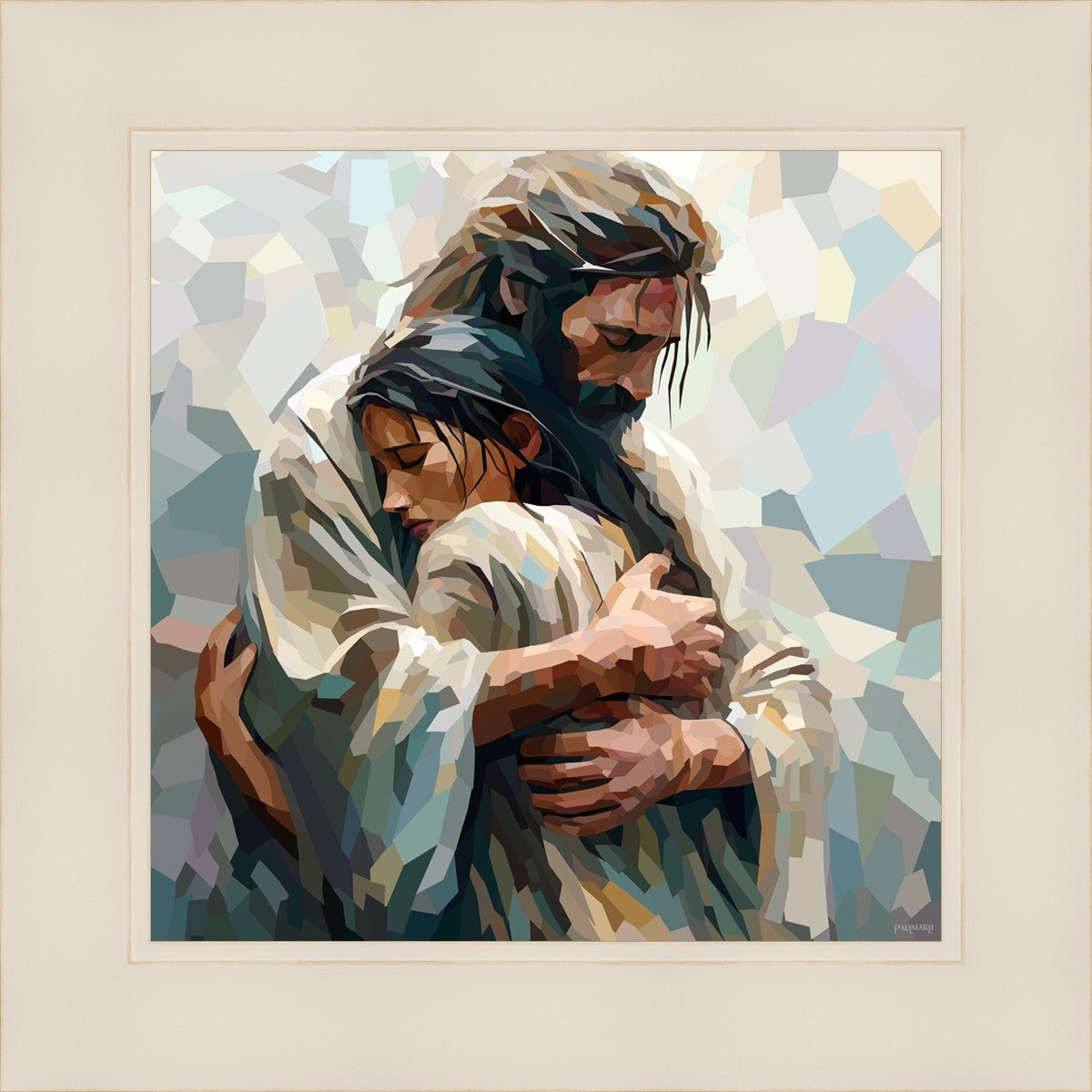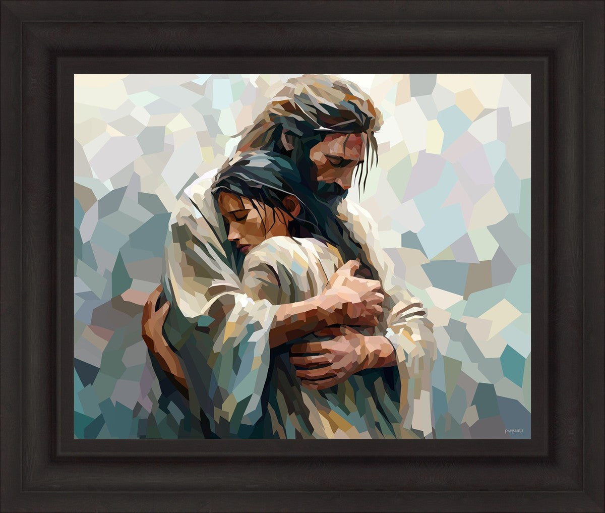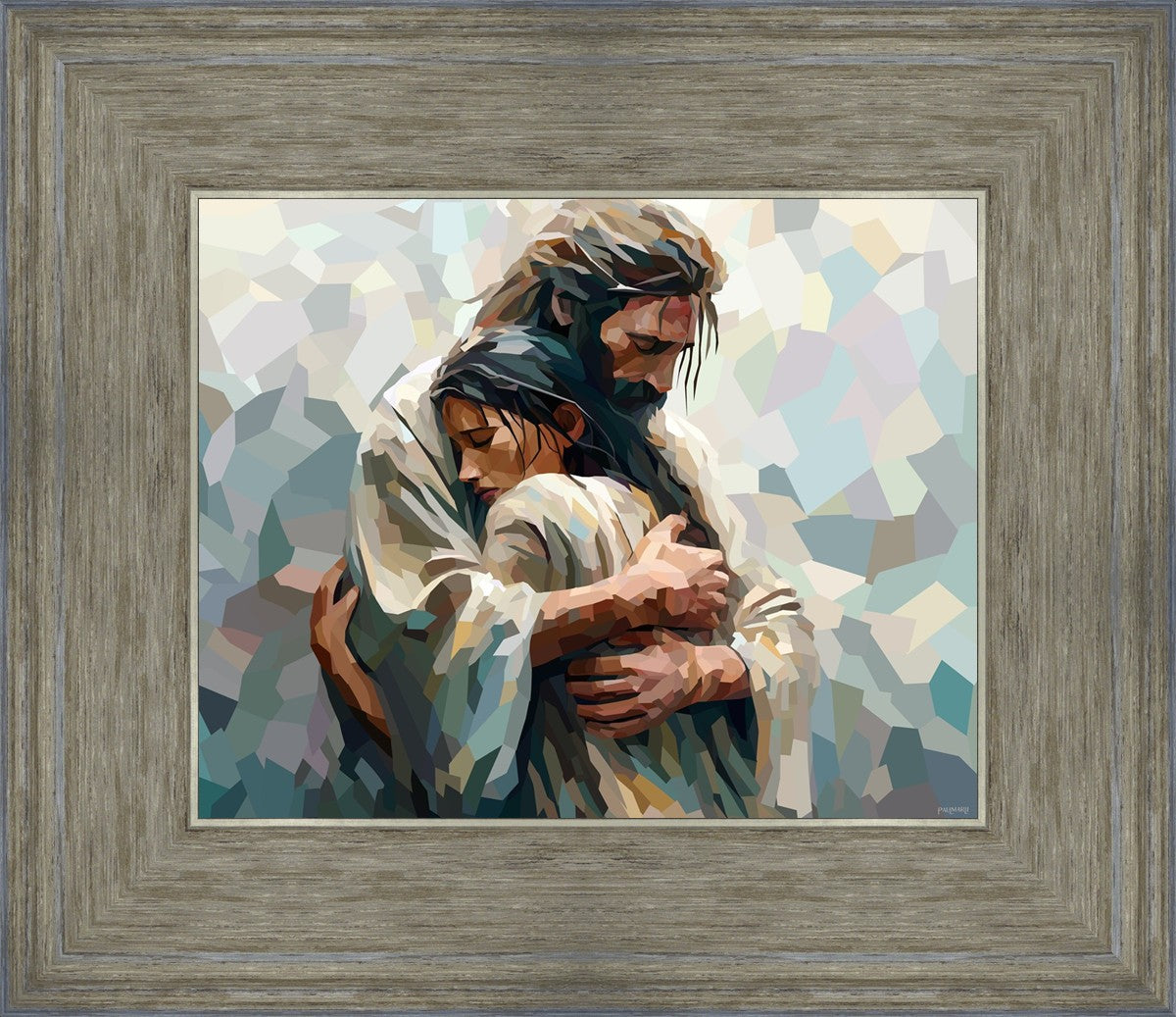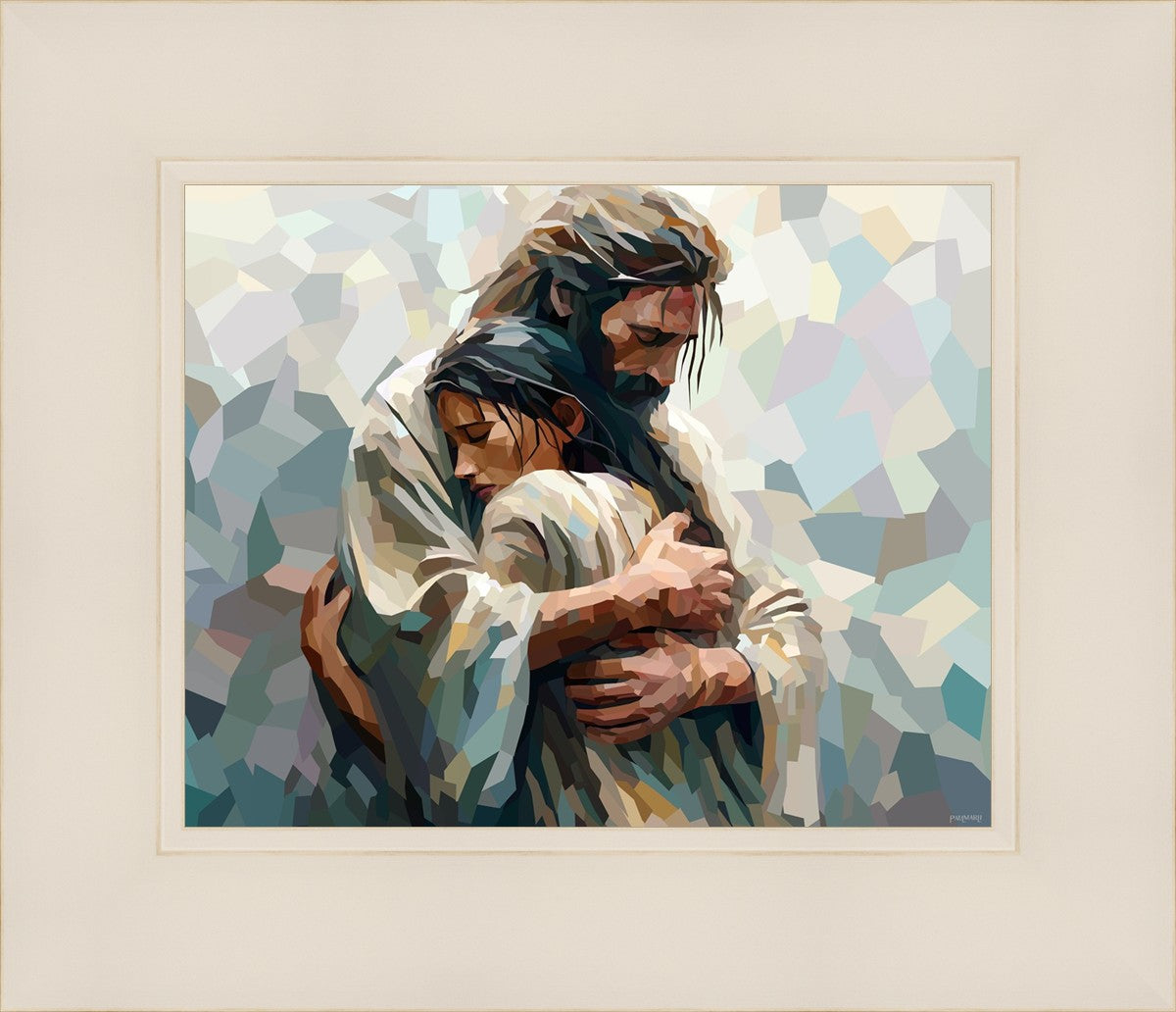 I am so pleased with my artwork. It arrived in perfect condition and in a timely manner. I can’t wait to frame it and hang it up. It makes me think of Jesus giving me a hug when I need it most!