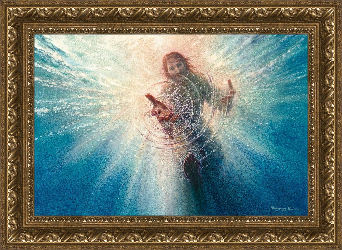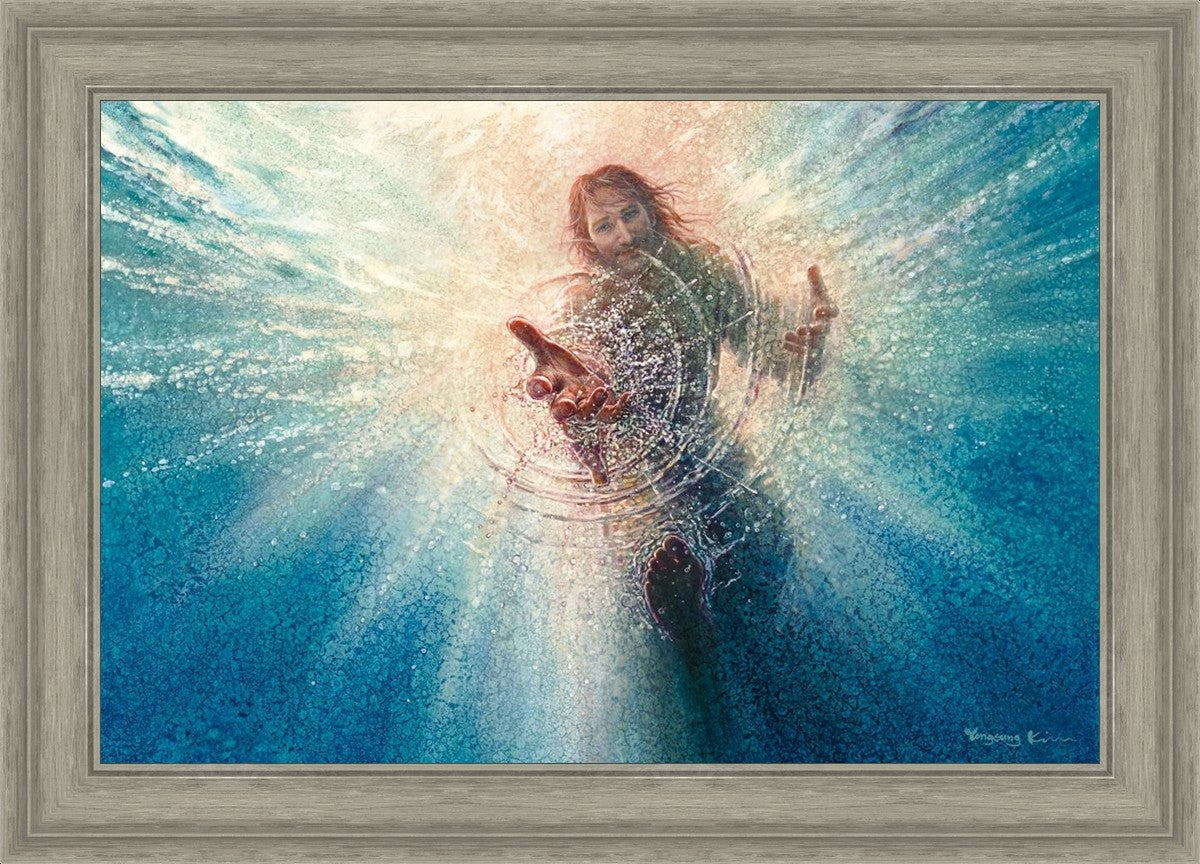 His Mighty Hand is a painting by Yongsung Kim. This painting depicts Jesus reaching down to save Peter from drowning.