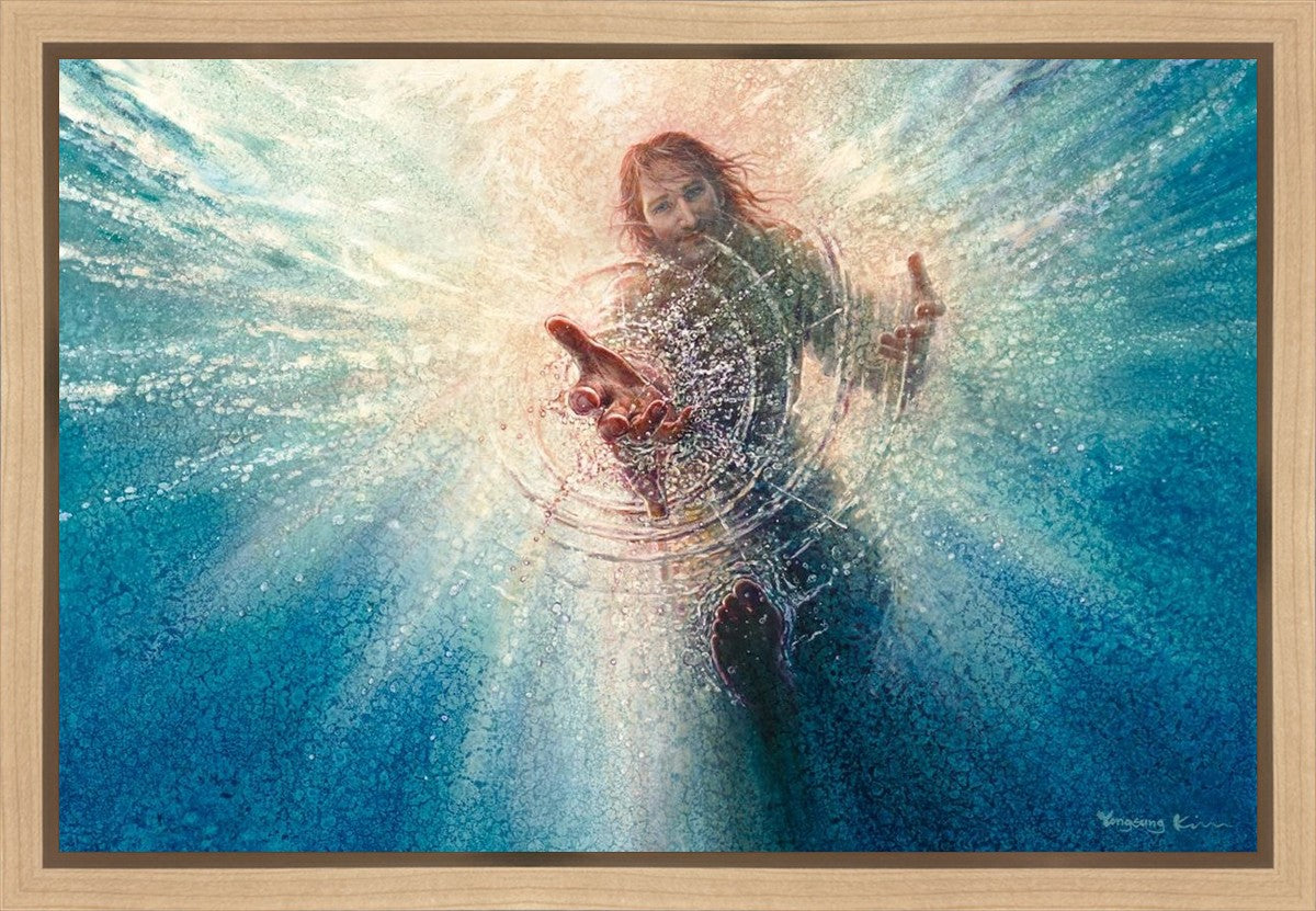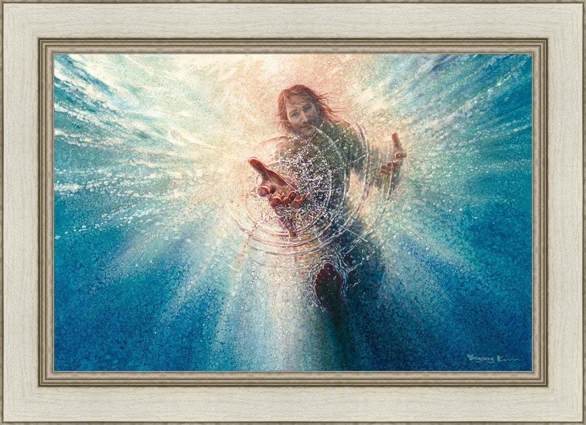 Yongsung Kim's 'His Mighty Hand' painting portrays the powerful scene of Jesus rescuing Peter from drowning.