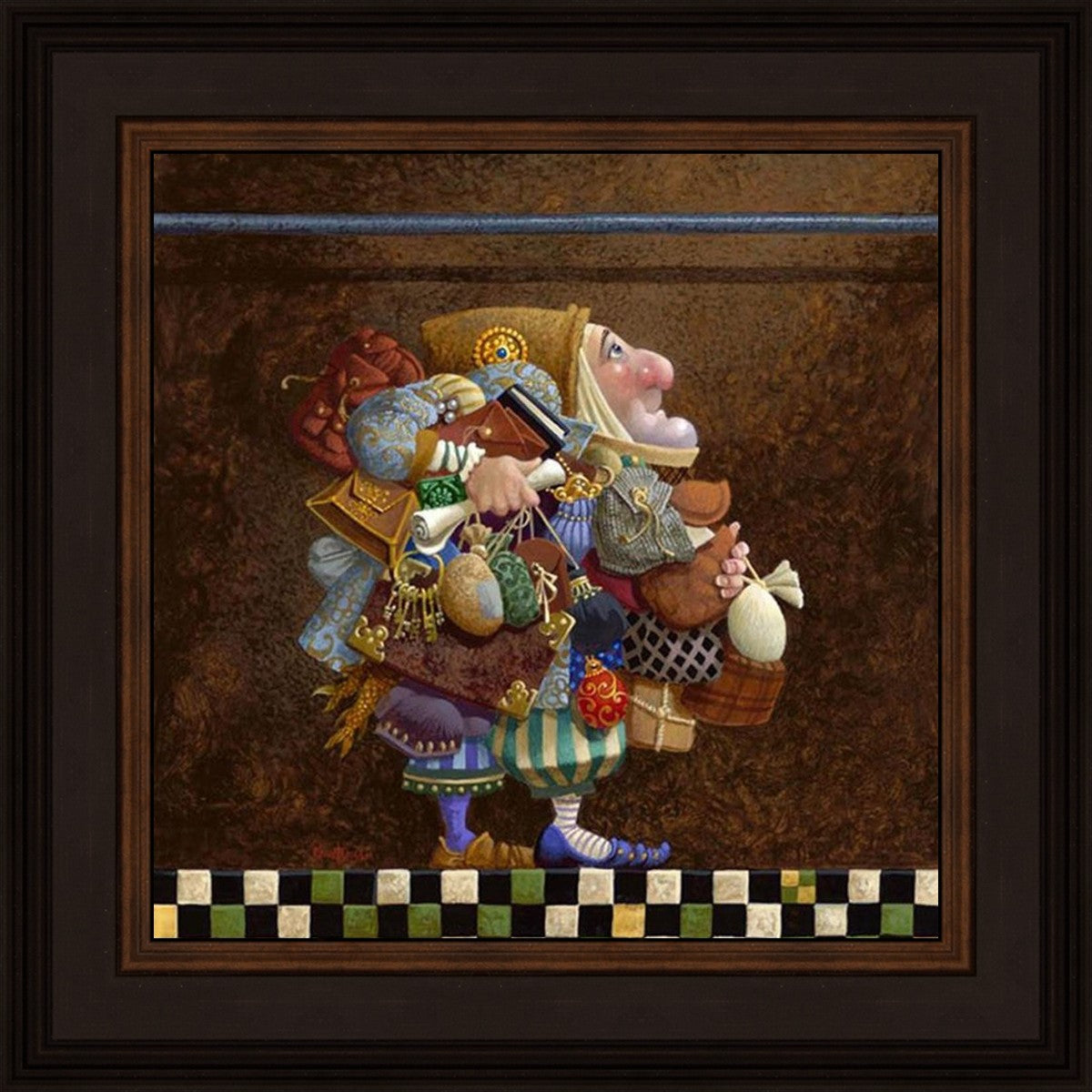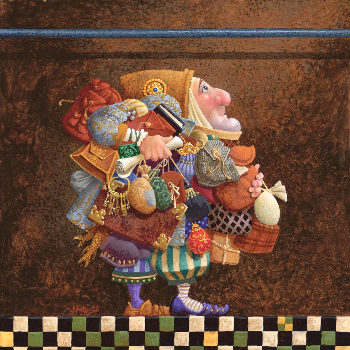 The character in "Hold to the Rod" finds himself so burdened with the mundane objects he has collected that, while he hopefully eyes the rod, he cannot reach up to hold it for fear of losing something else. The man has become little more than a vehicle for his adornments. He demonstrates that what is truly important is keeping sight of our true belief and faith, that they alone will guide us through.