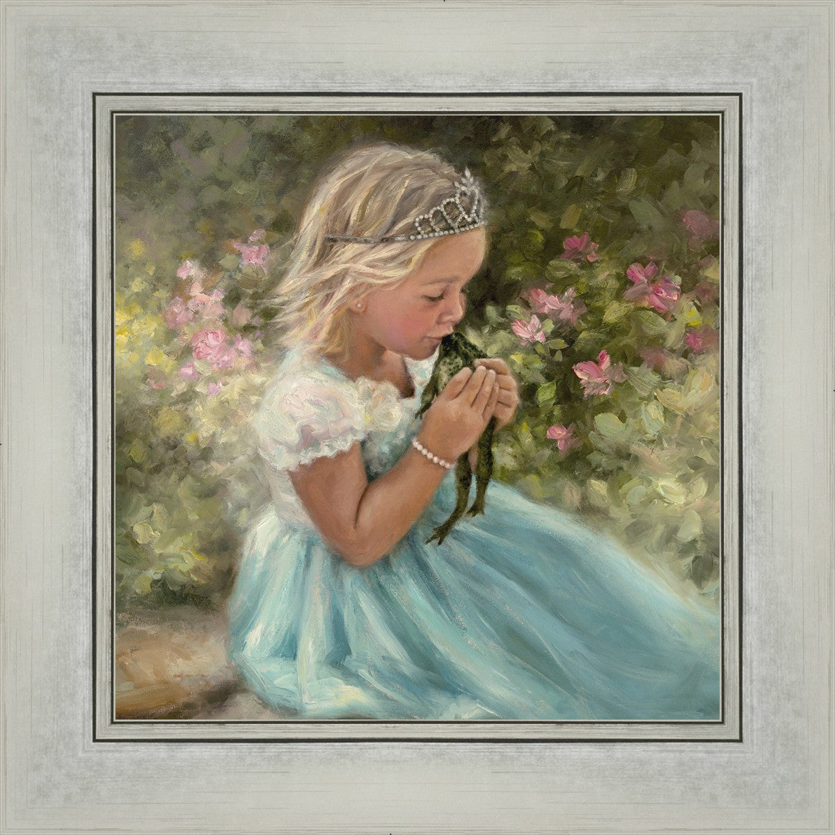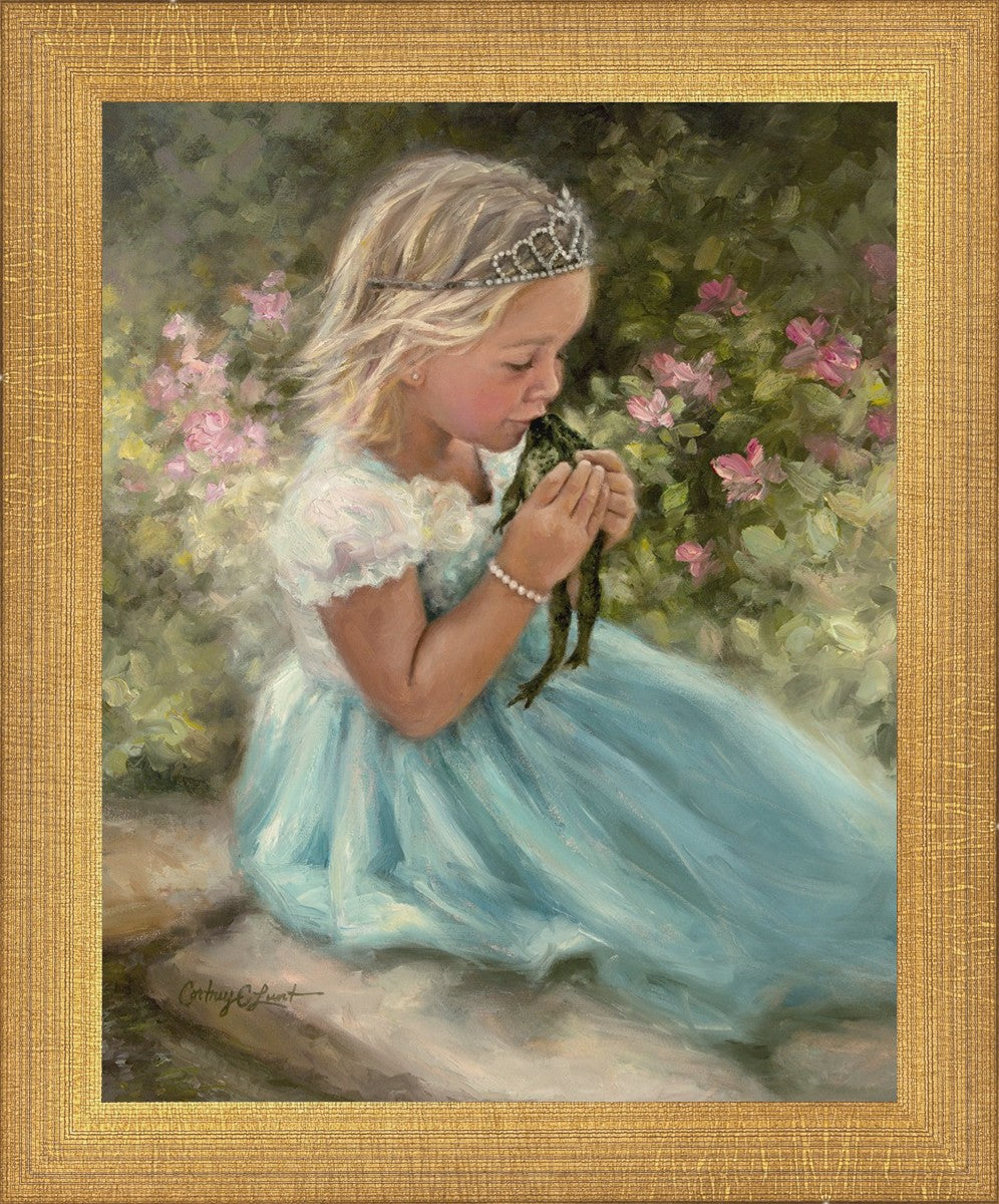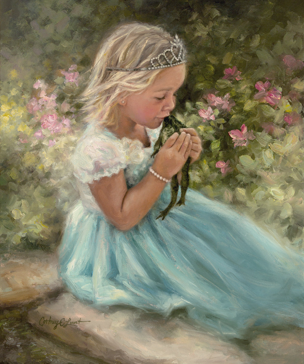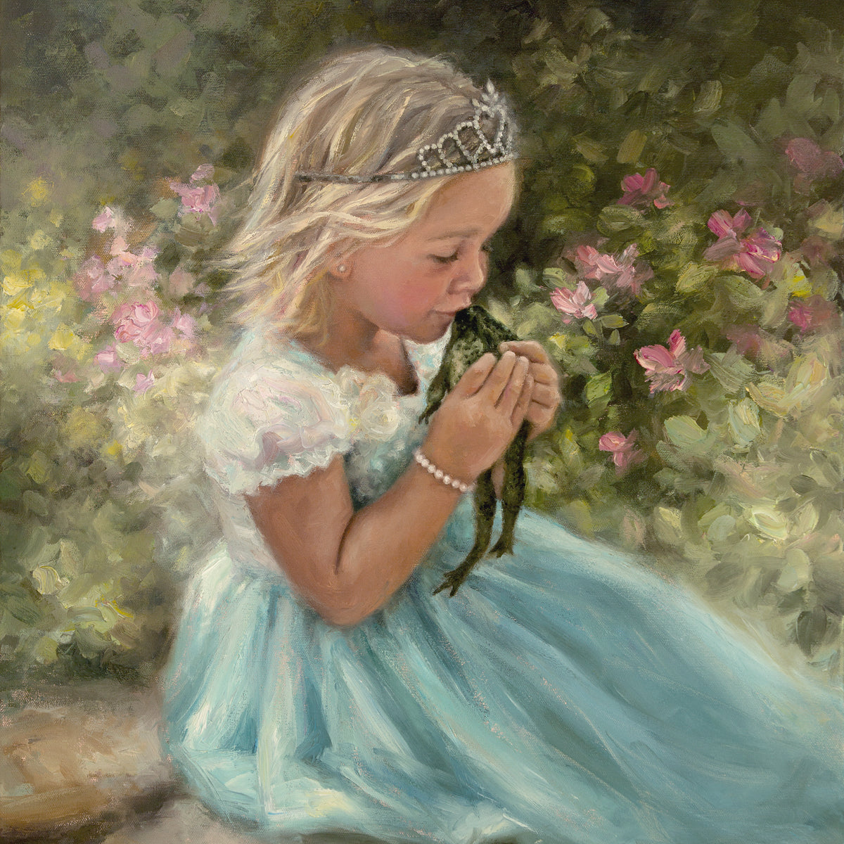 Little girls believe they are princesses. This girl, in particular, had no fear of kissing this toad! She was fully confident that her kiss could make something happen, and she knew she was special in her little gown. For some reason, when girls get a bit older, they forget to believe. They sometimes forget who they truly are. I hope that this painting can bring back some of that belief.