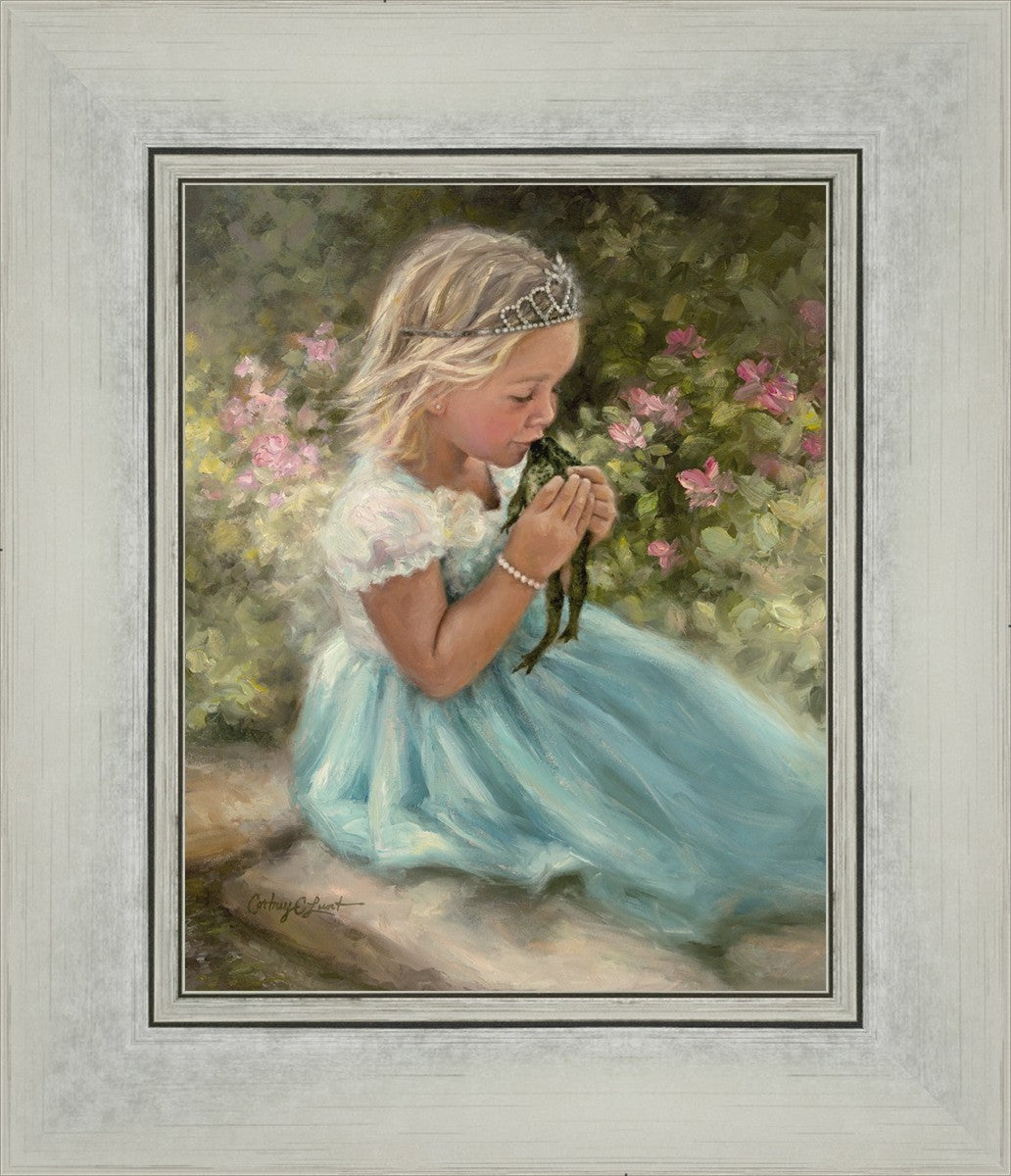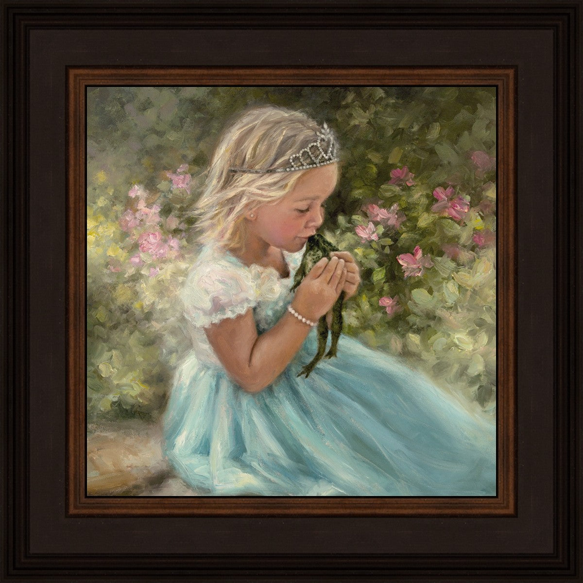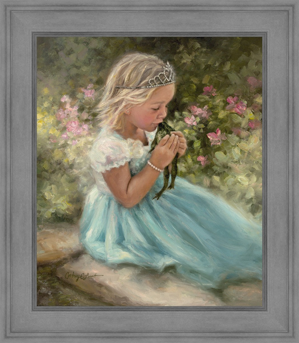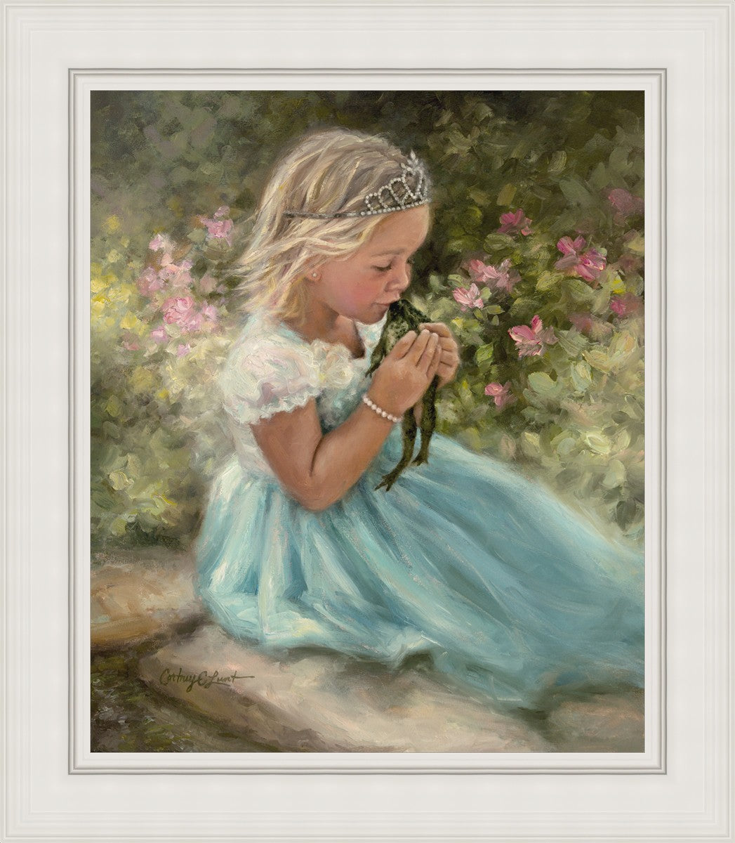 Little girls believe they are princesses. This girl, in particular, had no fear of kissing this toad! She was fully confident that her kiss could make something happen, and she knew she was special in her little gown. For some reason, when girls get a bit older, they forget to believe. They sometimes forget who they truly are. I hope that this painting can bring back some of that belief.