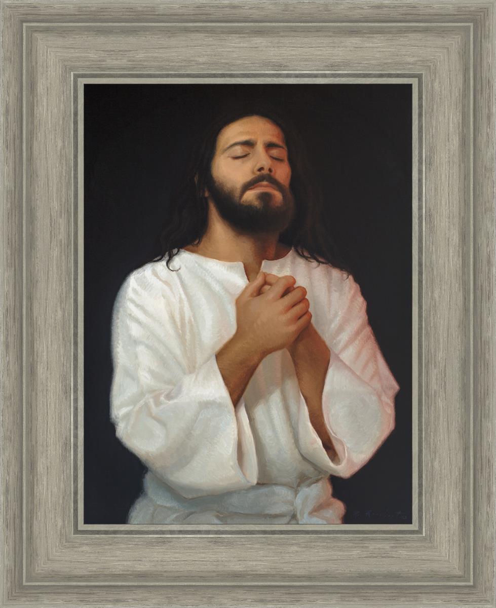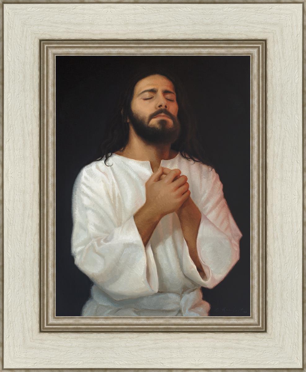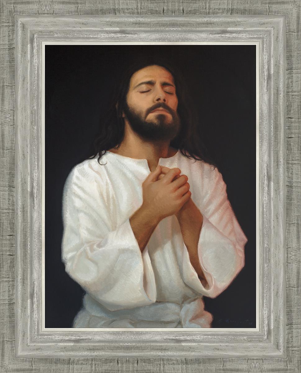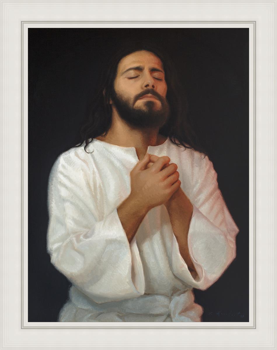In verse 19, Jesus says that He sanctifies Himself that we might be sanctified. I think of His atonement which required His complete sanctification in order to overcome all things. And because of that, He offers me a way to become sanctified, too. In this painting there is a cool light shining on one side of Him, and a warm light hitting the other side of Him. These different colored lights represent how everything good is because of Jesus Christ while everything evil was overcome by Him. They all converge on Him, and He bore the weight and responsibility of it all. And He did it for you and me. I created this painting to help people remember that Jesus Christ prayed for them, and still prays for them.