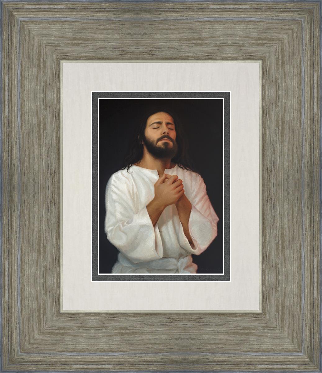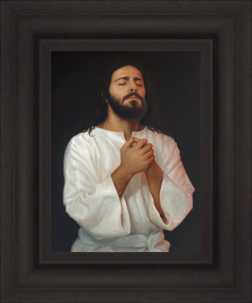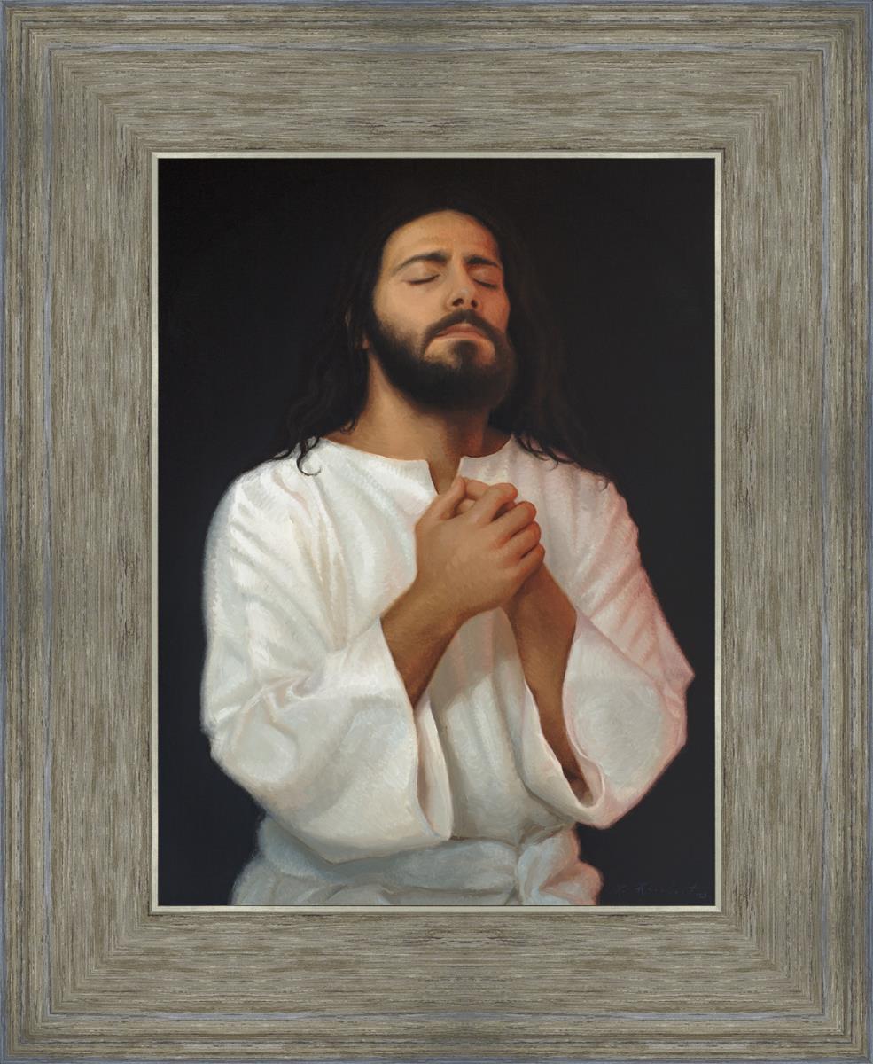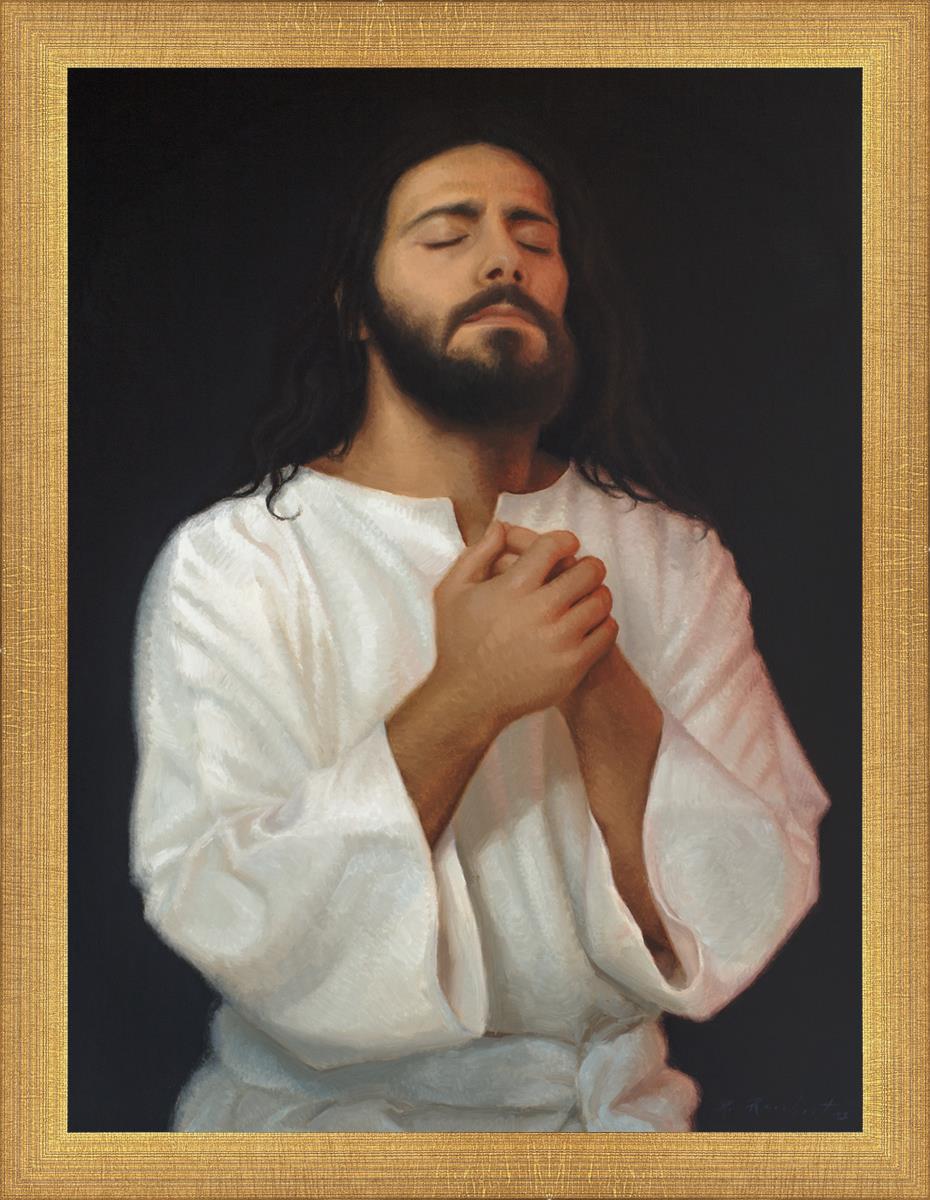 In verse 19, Jesus says that He sanctifies Himself that we might be sanctified. I think of His atonement which required His complete sanctification in order to overcome all things. And because of that, He offers me a way to become sanctified, too. In this painting there is a cool light shining on one side of Him, and a warm light hitting the other side of Him. These different colored lights represent how everything good is because of Jesus Christ while everything evil was overcome by Him. They all converge on Him, and He bore the weight and responsibility of it all. And He did it for you and me. I created this painting to help people remember that Jesus Christ prayed for them, and still prays for them.