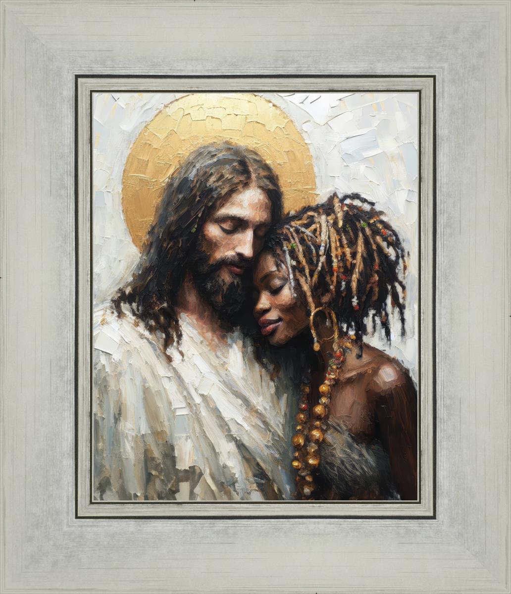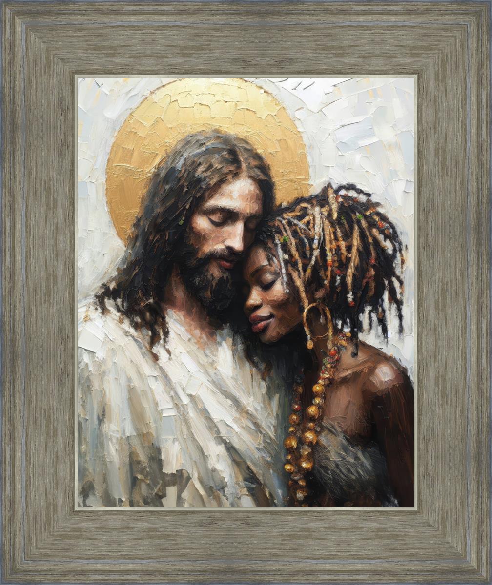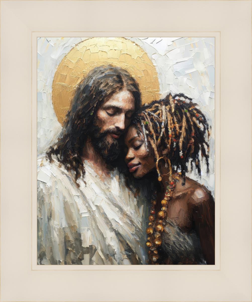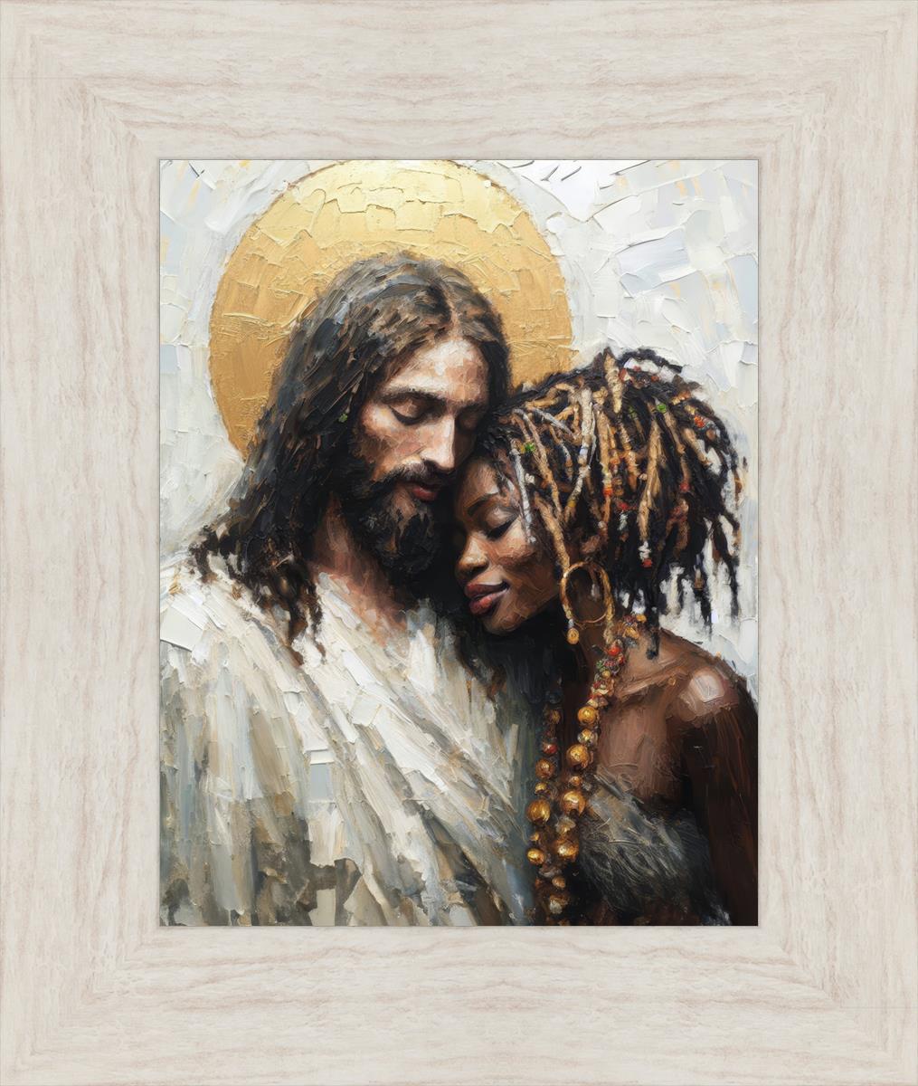In this tender portrait, we capture a moment of connection between the woman and her Savior, illustrating the timeless promise of rest and renewal found in Christ, regardless of who you are. In a world filled with turmoil and uncertainty, this painting serves as a reminder that true peace can be found in the arms of Jesus, where burdens are lifted and rest is offered to weary souls.