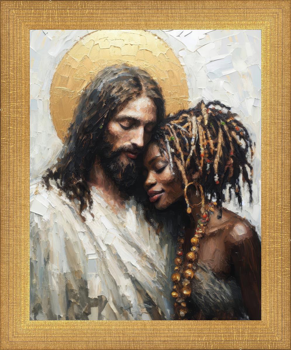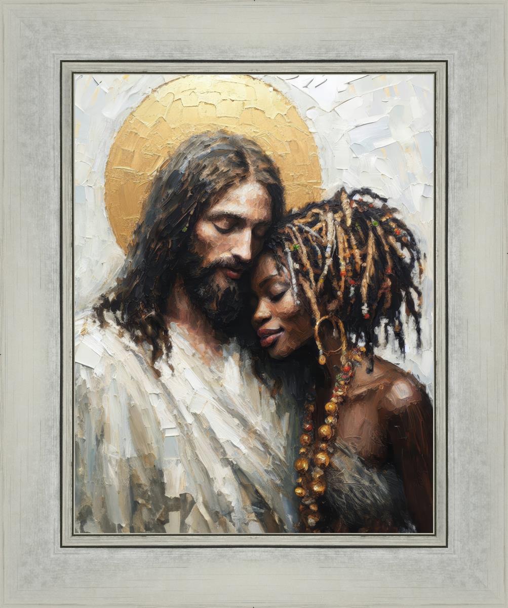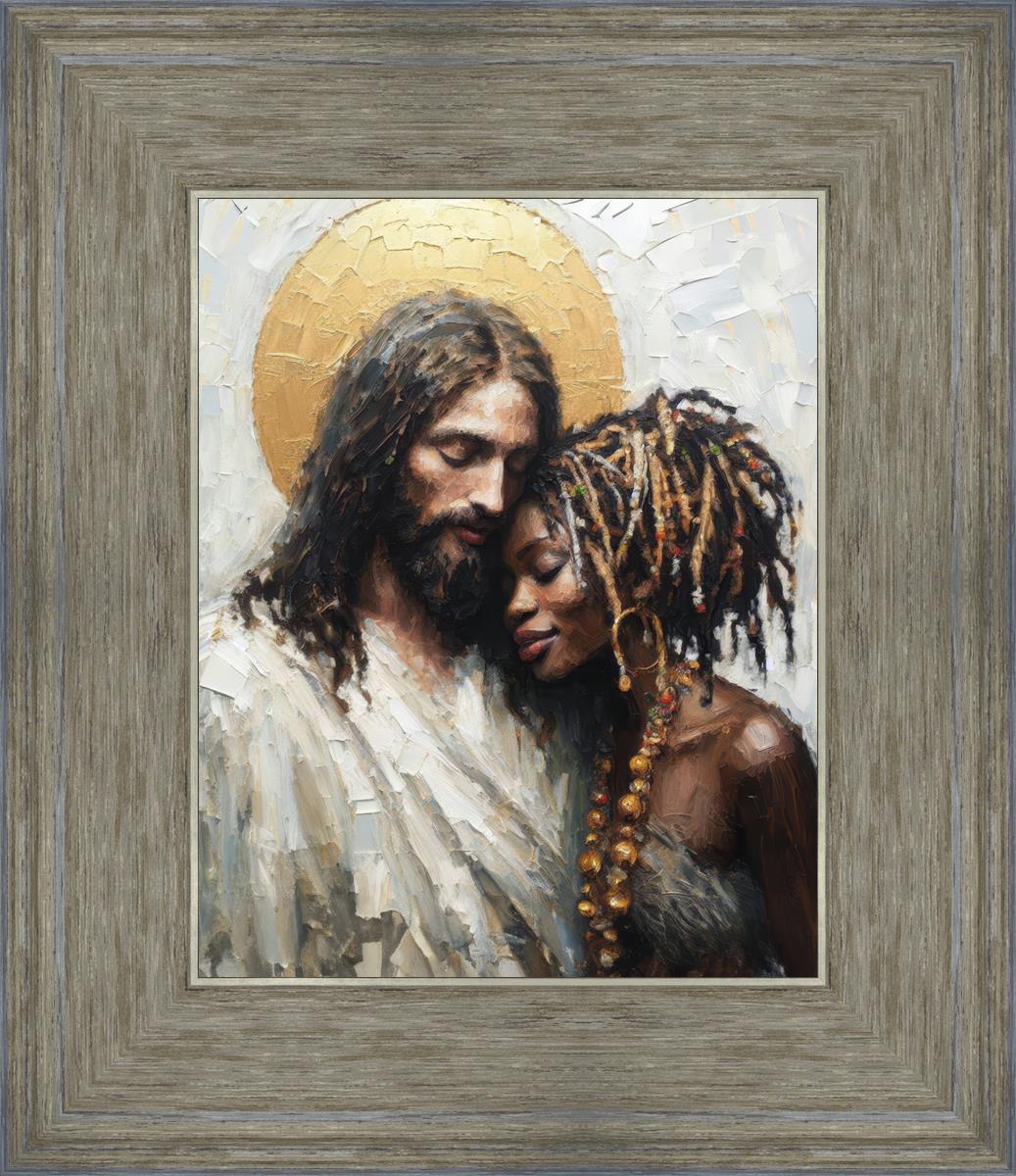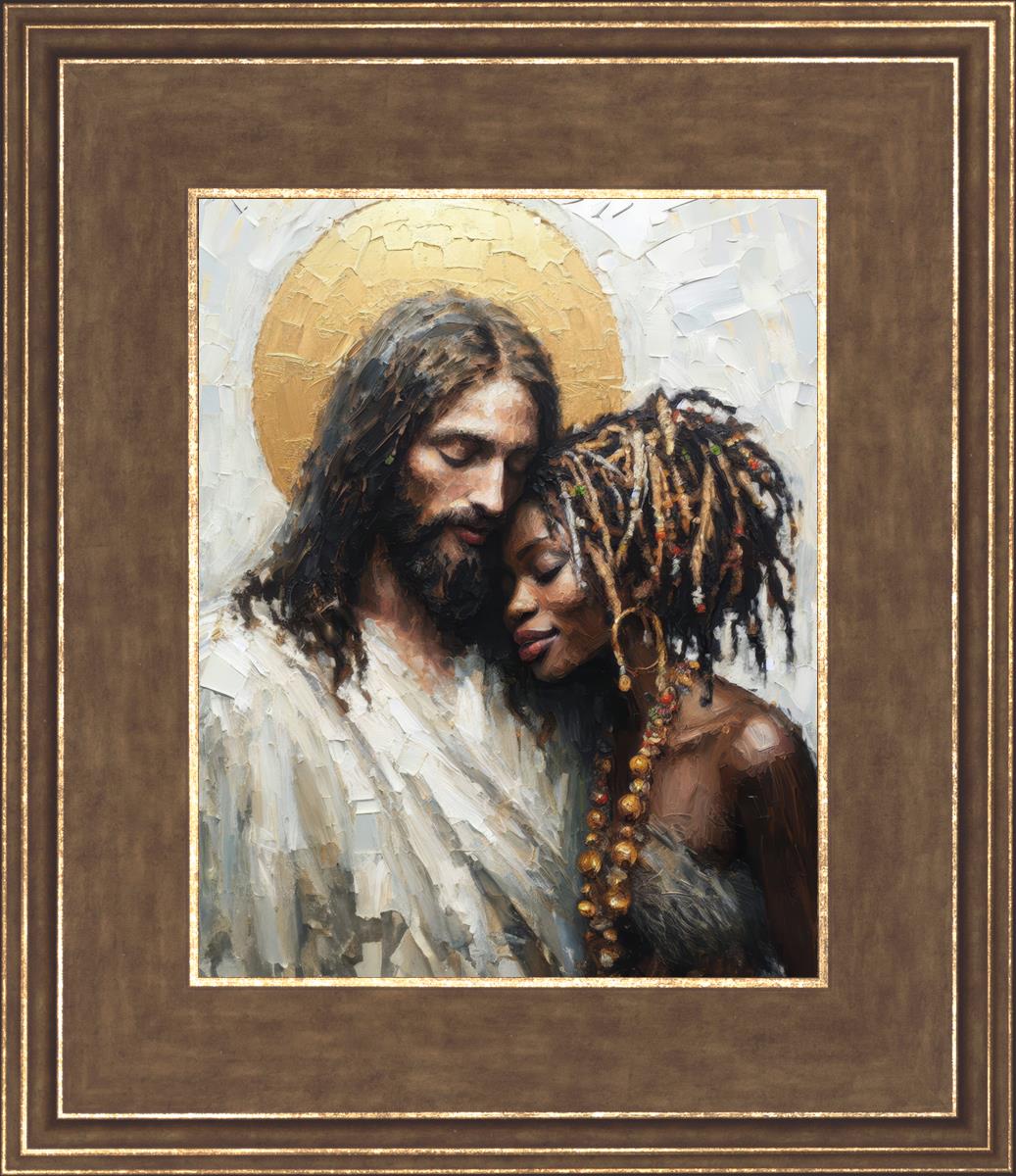 In this tender portrait, we capture a moment of connection between the woman and her Savior, illustrating the timeless promise of rest and renewal found in Christ, regardless of who you are. In a world filled with turmoil and uncertainty, this painting serves as a reminder that true peace can be found in the arms of Jesus, where burdens are lifted and rest is offered to weary souls.